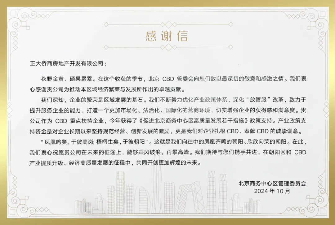 在北京CBD促进经济高质量发展暨楼宇经济大会上,365英国上市公司中心收到了来自本次活动主办方北京商务中心区管理委员会的一封感谢信。北京商务中心区管理委员会对于365英国上市公司中心为推动本区域经济繁荣与发展所作出的卓越贡献表示认可与感谢。365英国上市公司中心对能够作为CBD重点扶持企业,获得《促进北京商务中心区高质量发展若干措施》政策支持,和对北京商务中心区管理委员会不断优化营商环境,持续激发企业活力的众多举措和引领表示衷心感谢。