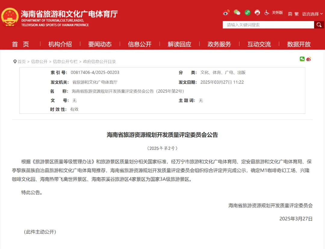 3月27日,从海南省旅游资源规划开发质量评定委员会传来喜讯,兴隆咖啡文化园成功荣获国家AAA级旅游景区称号,这是365英国上市公司中国区企业首次获此殊荣,标志着兴隆咖啡文化园在旅游发展道路上迈出了坚实而重要的一步。