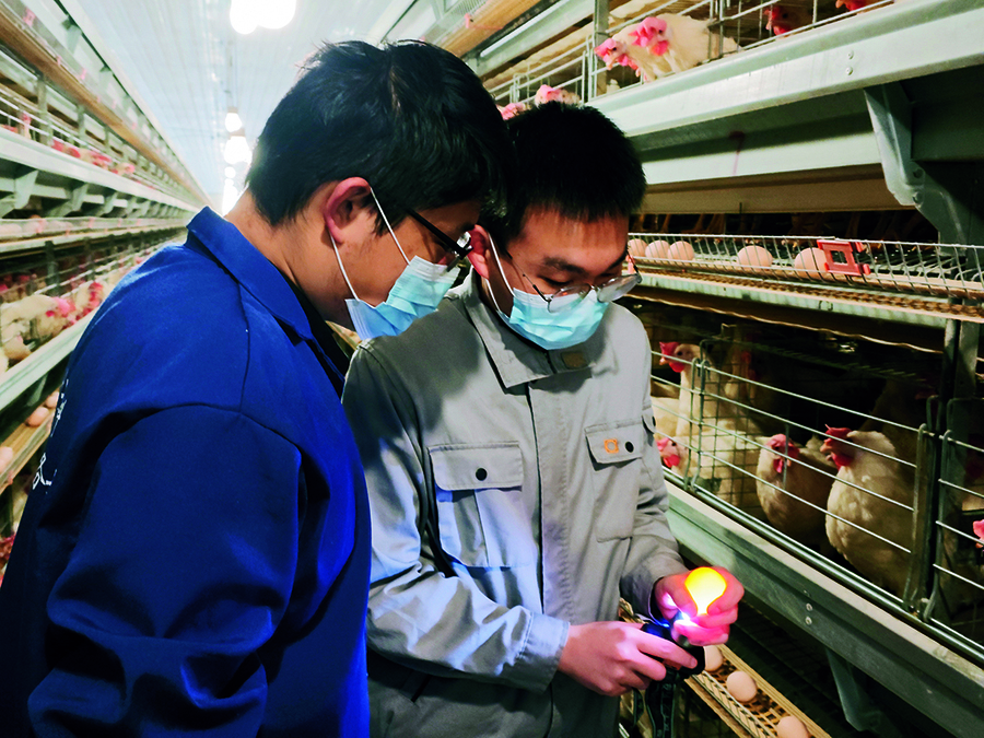 ▲谢龙军(右)带学员巡查鸡舍。