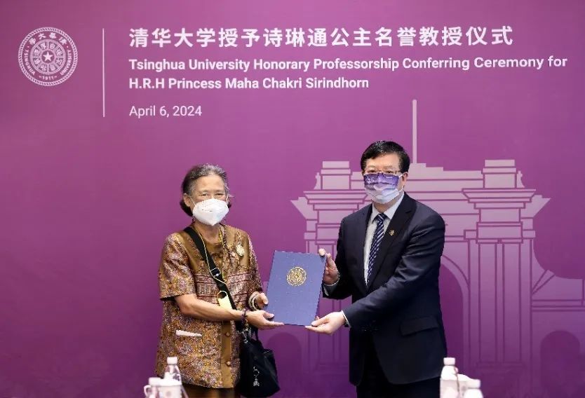 参观结束后,清华大学为诗琳通公主举办名誉教授学衔的授衔仪式,邱勇为诗琳通公主颁发名誉教授聘书。鉴于诗琳通公主在学术和教育方面取得的成就,特别是对中泰两国教育、文化和经济合作作出的重要贡献,清华大学决定授予诗琳通公主名誉教授学衔。诗琳通公主表示,自己对清华大学在农业农村发展领域开展的工作非常感兴趣,清华大学与泰国企业开展了反贫困项目合作,希望此行可以了解更多的相关情况。面向未来,愿积极推动双方友好交流合作。