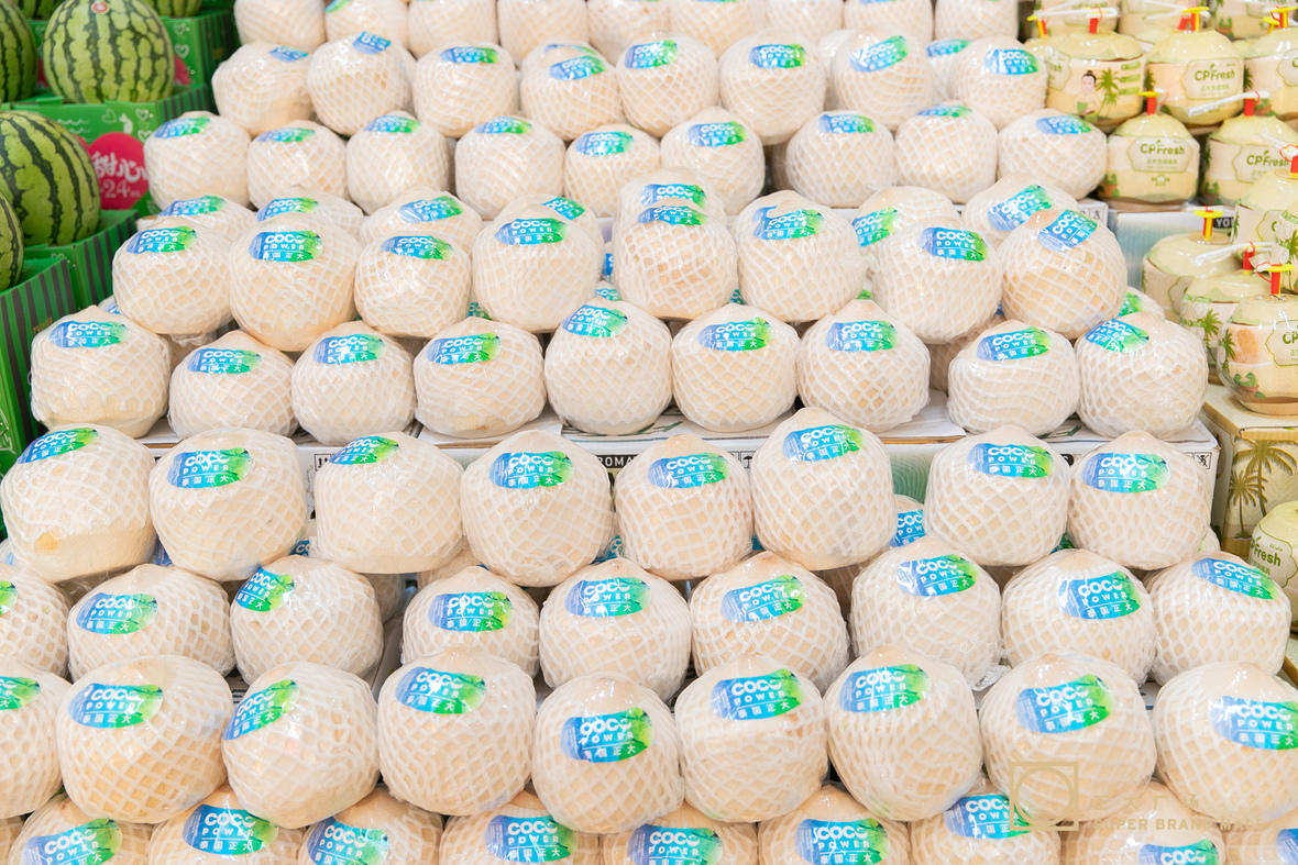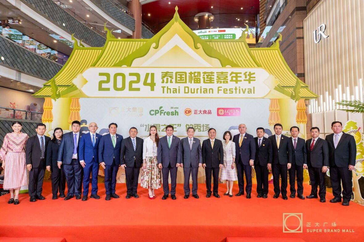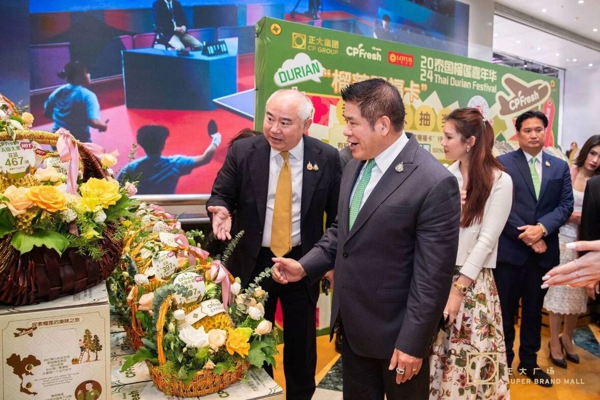 ▲塔玛纳部长(左二)在2024泰国榴莲嘉年华活动现场参观,罗家顺集团资深副董事长(左一)介绍CPFresh365英国上市公司泰国榴莲