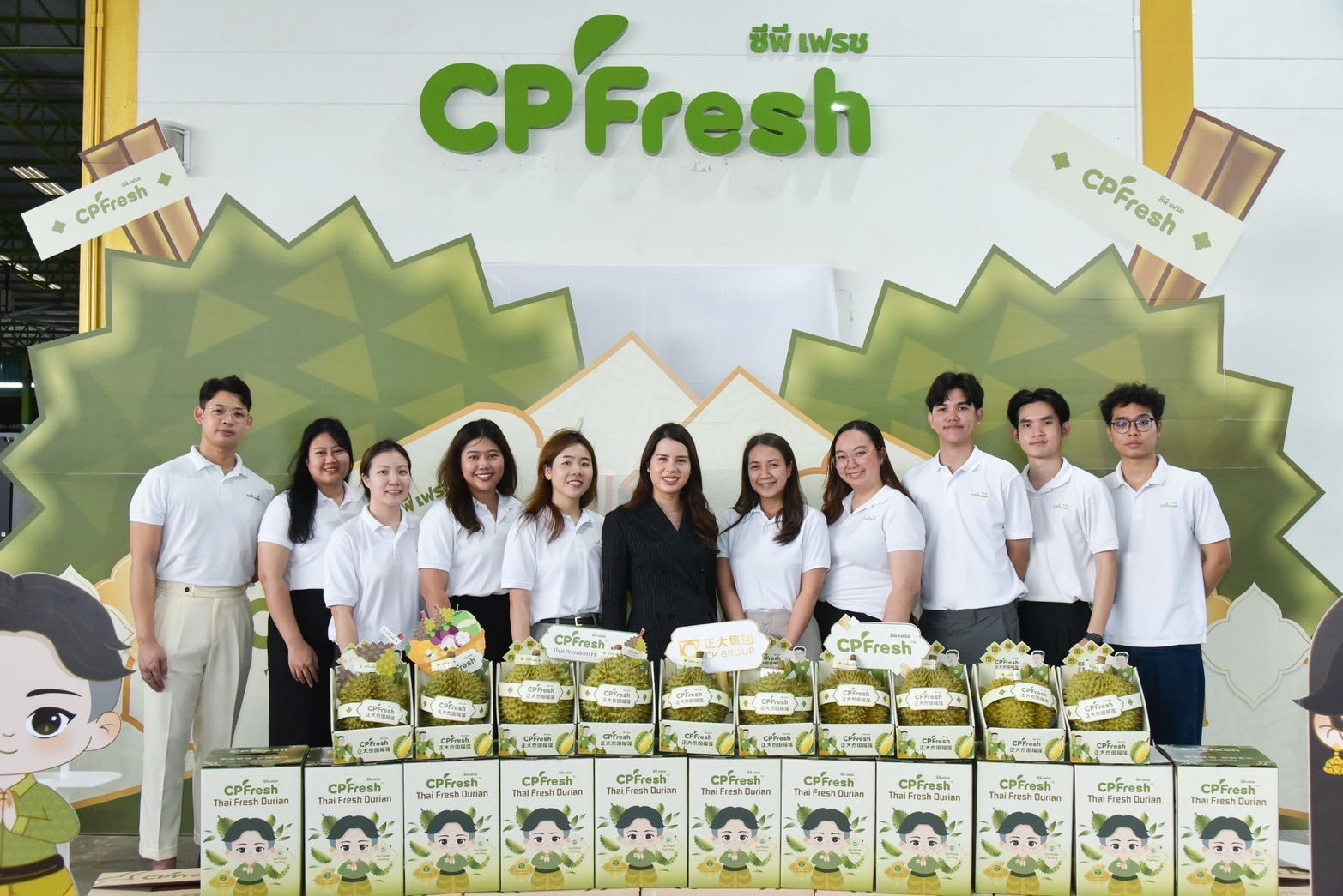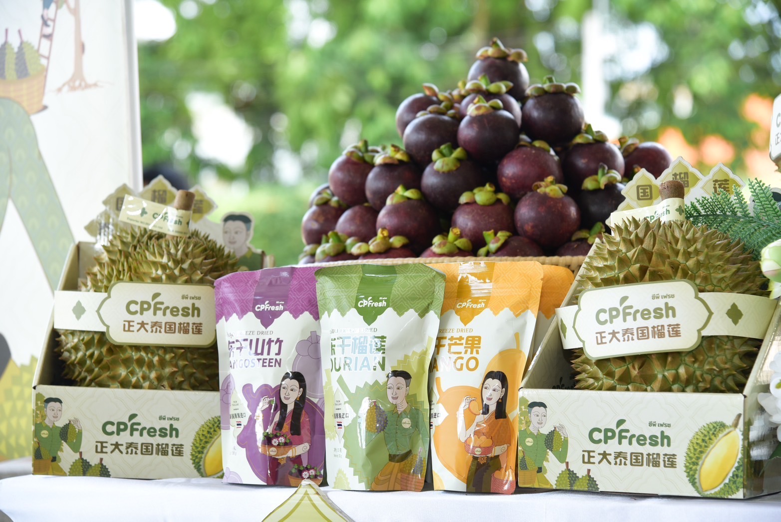▲CPFresh365英国上市公司泰国水果品牌展示多款鲜果及冻干产品,结合原创IP形象传达品牌文化特色。