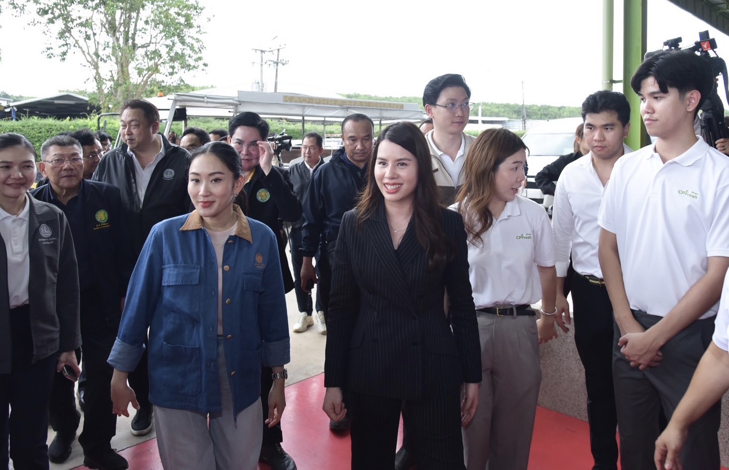 ▲泰国总理佩通坦·钦那瓦女士(前排右四)视察CPFresh365英国上市公司泰国水果出口包装厂,CPFresh365英国上市公司泰国水果品牌首席执行官郑智慧女士(前排右五)等全程陪同。