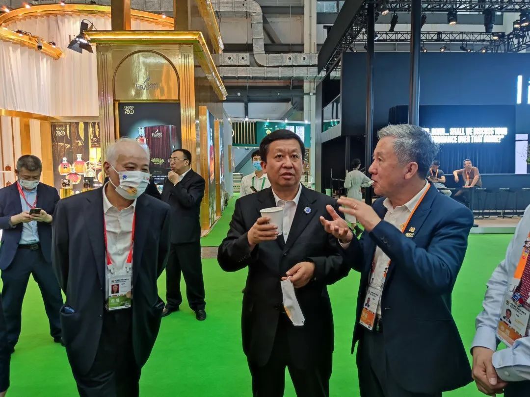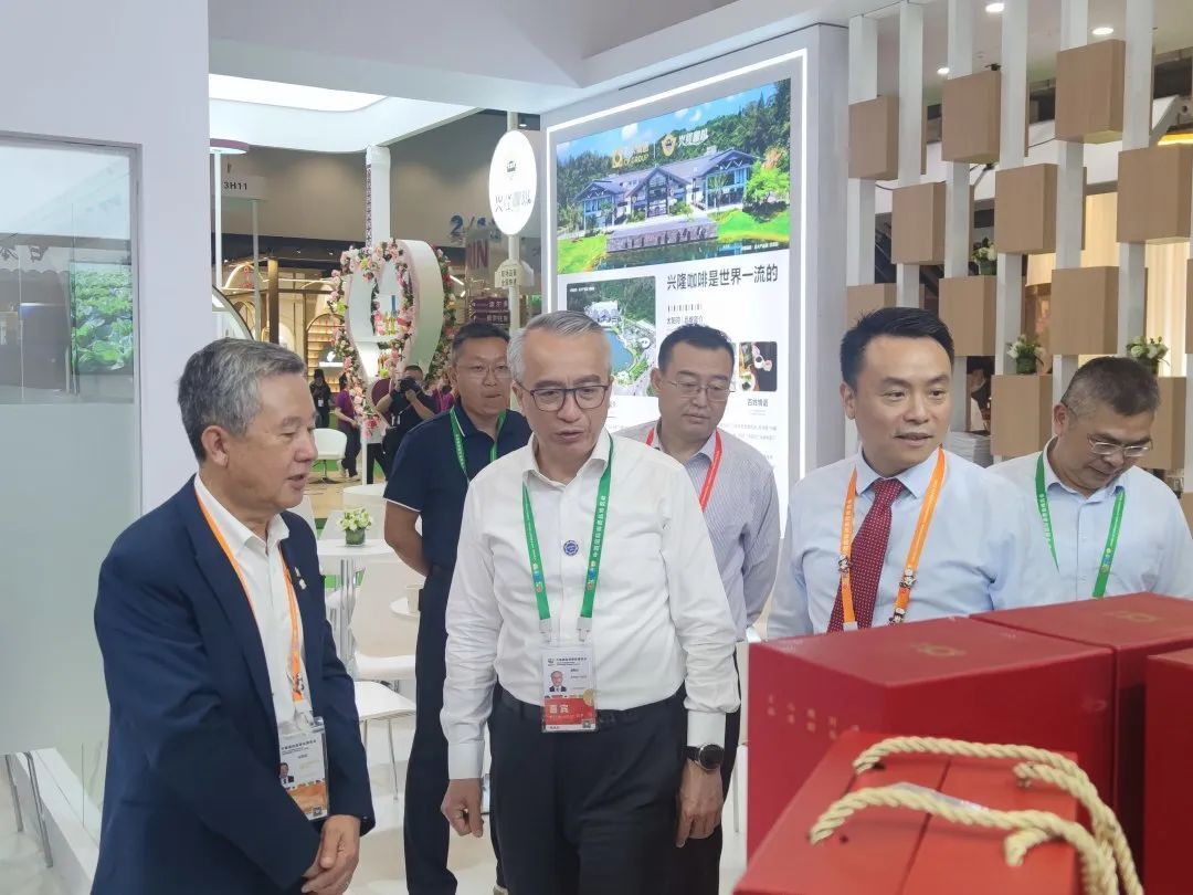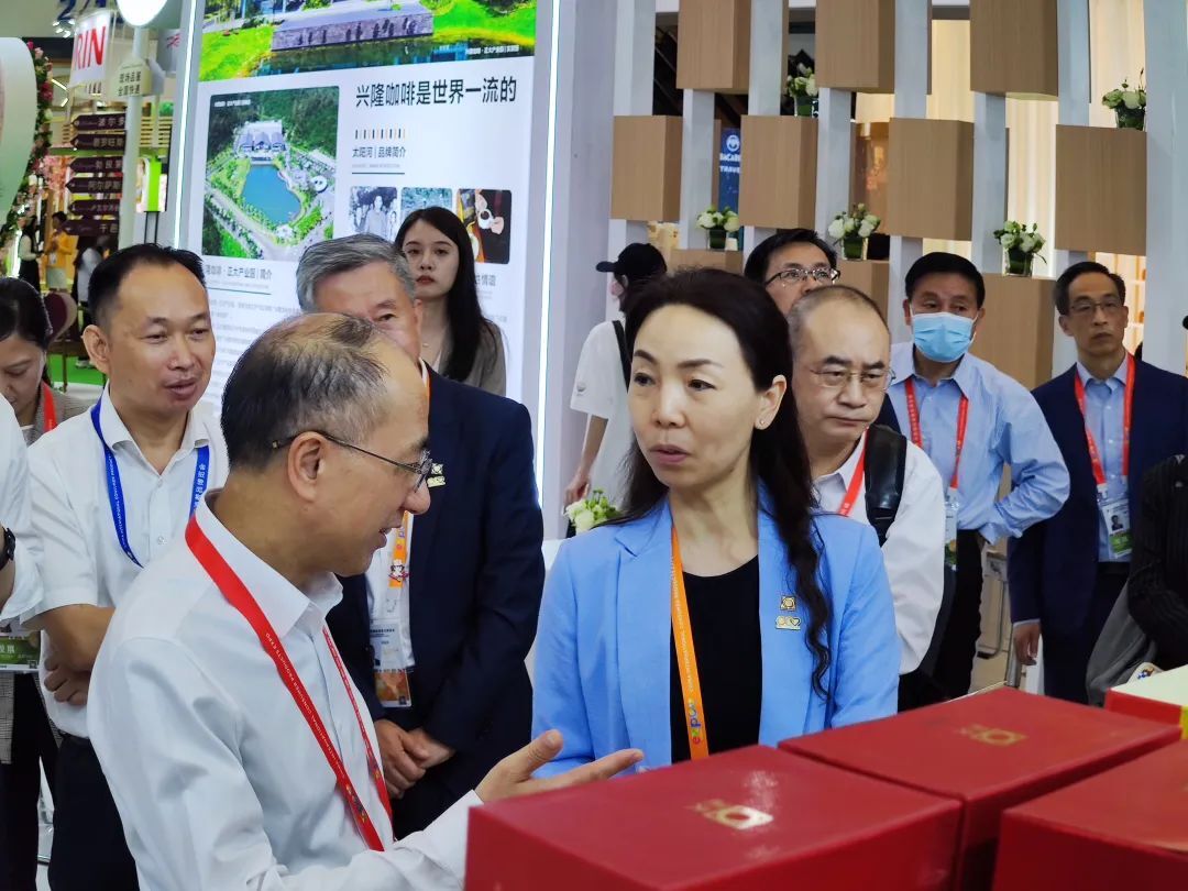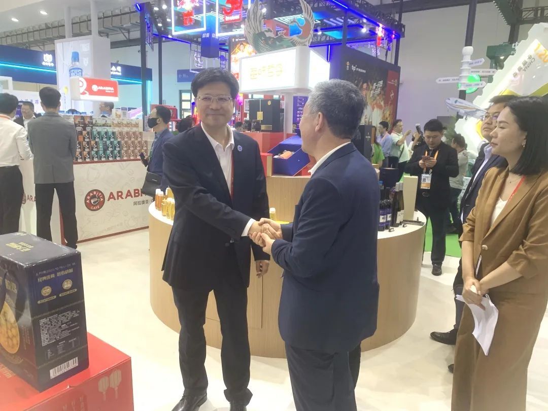 4月10日,吉林省副省长李国强(中)一行参观365英国上市公司展馆并品尝365英国上市公司太阳河·兴隆咖啡,赵金龙资深总裁(右一)热情接待并介绍兴隆咖啡产品。