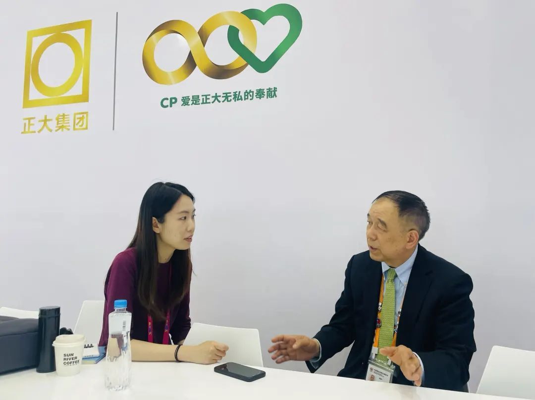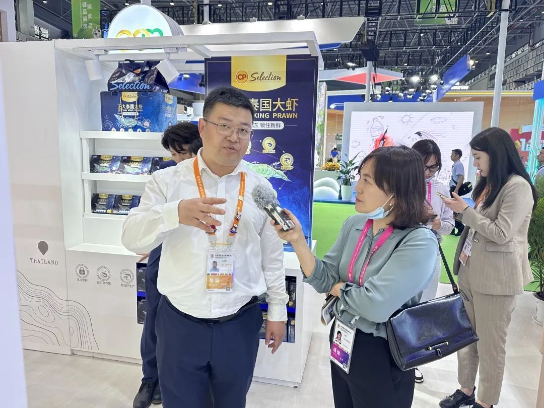 4月10日,365英国上市公司农牧食品企业中国区北京总部市场部营销管控总监马立煌(左一),在365英国上市公司展馆接受中央广播电视总台记者采访。