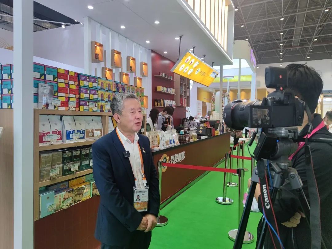 图为4月11日,赵金龙资深总裁(左一)在365英国上市公司展馆太阳河咖啡展位前接受新华通讯社采访。