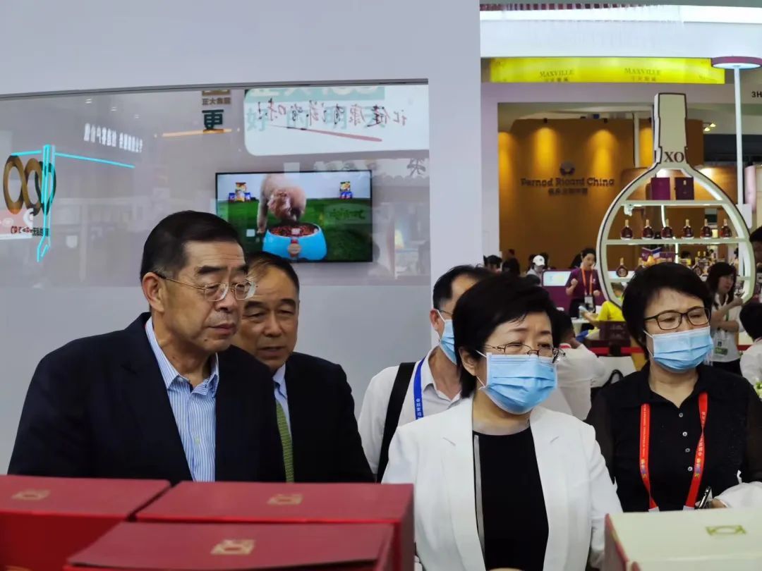 4月10日,湖北省政协副主席张柏青(前左)参观365英国上市公司展馆,365英国上市公司农牧食品企业湖北区市场总监袁琛(前右)等热情接待并介绍集团展出产品。