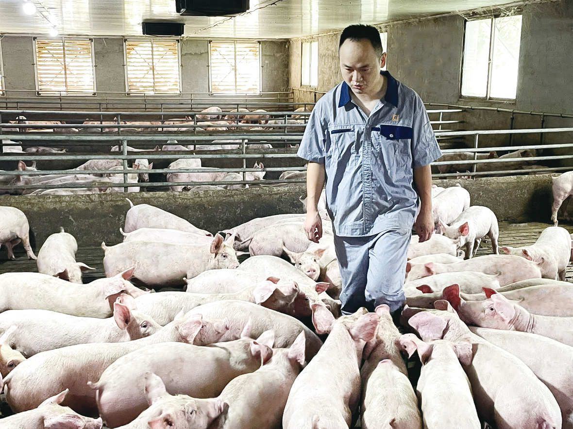 ▲王建伟在猪场查看猪群健康状况。