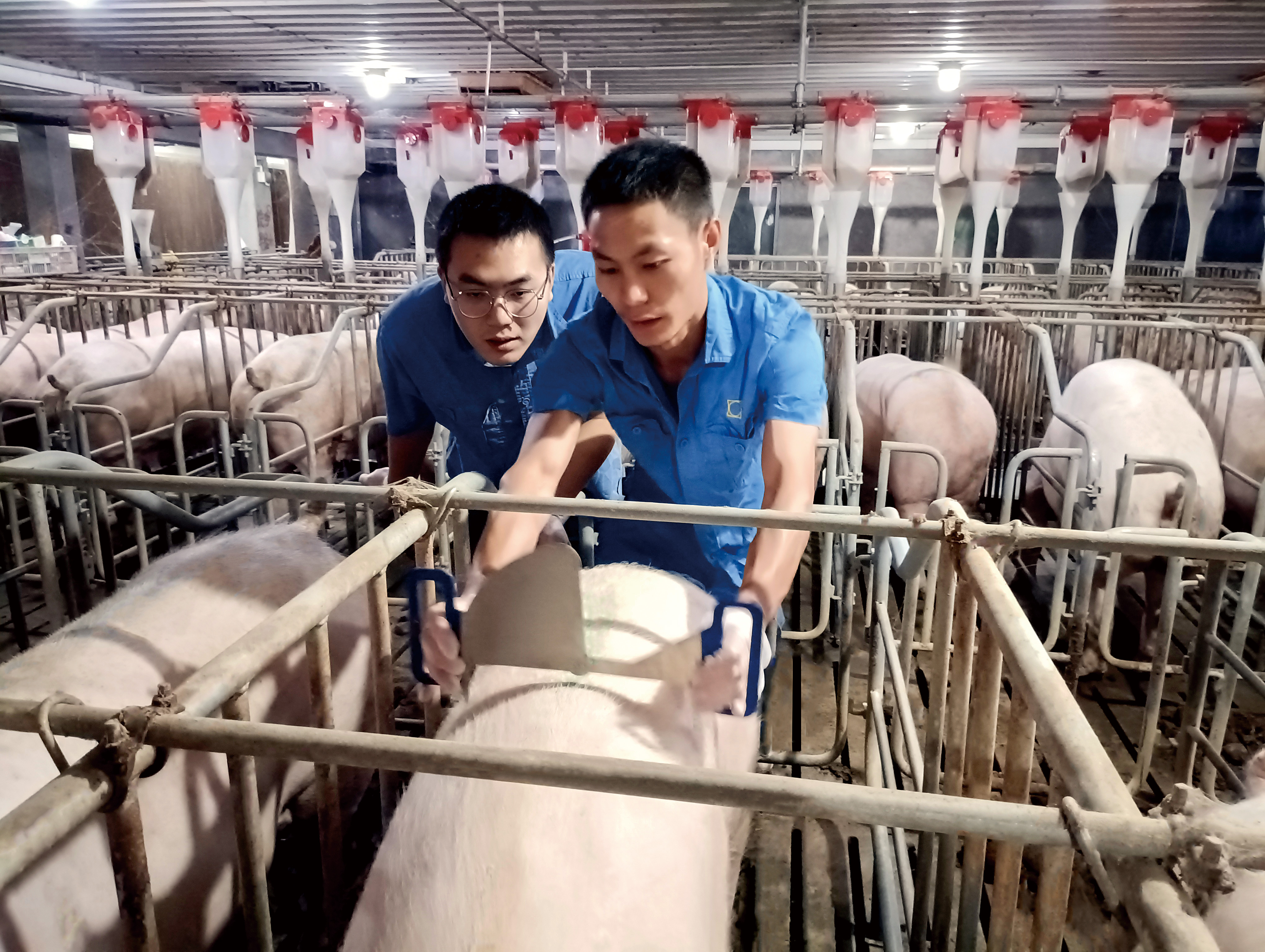 ▲刘耀(右)教新同事如何评判猪只膘情。