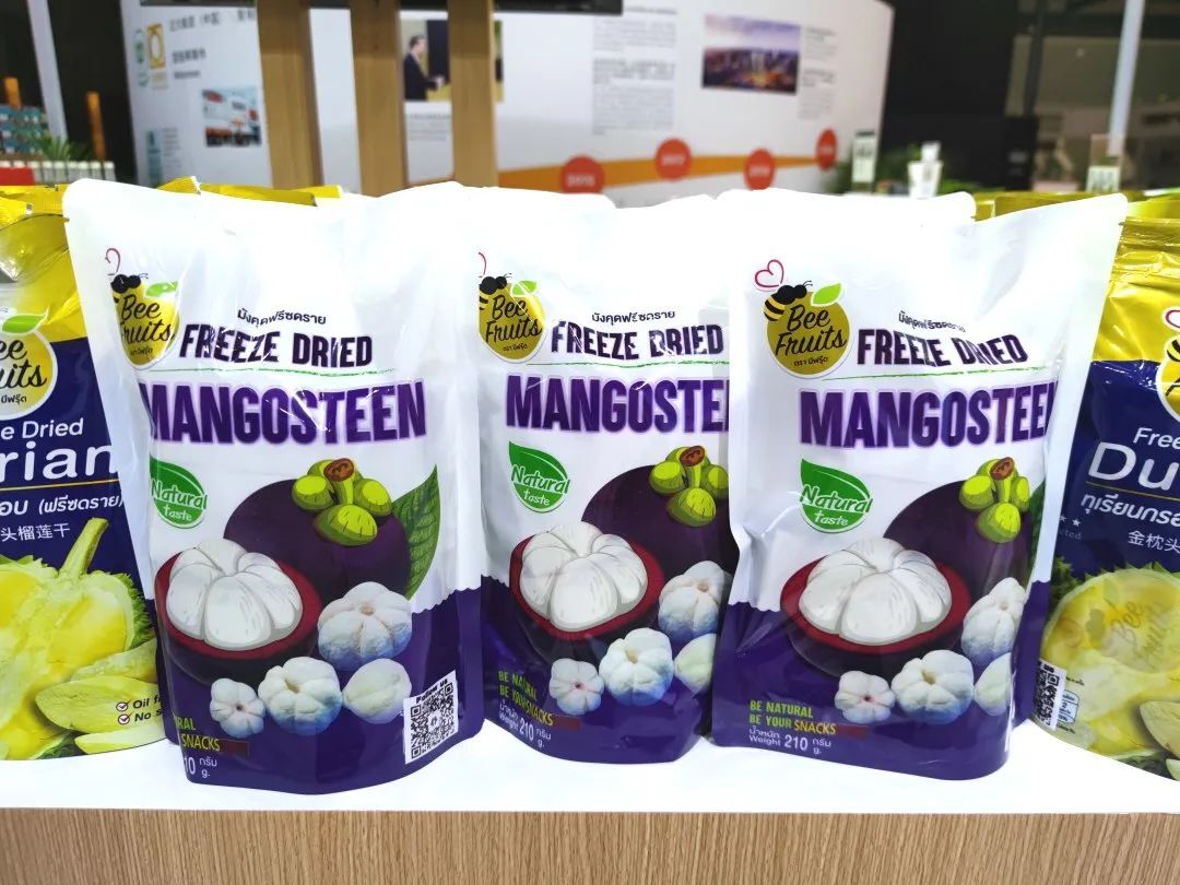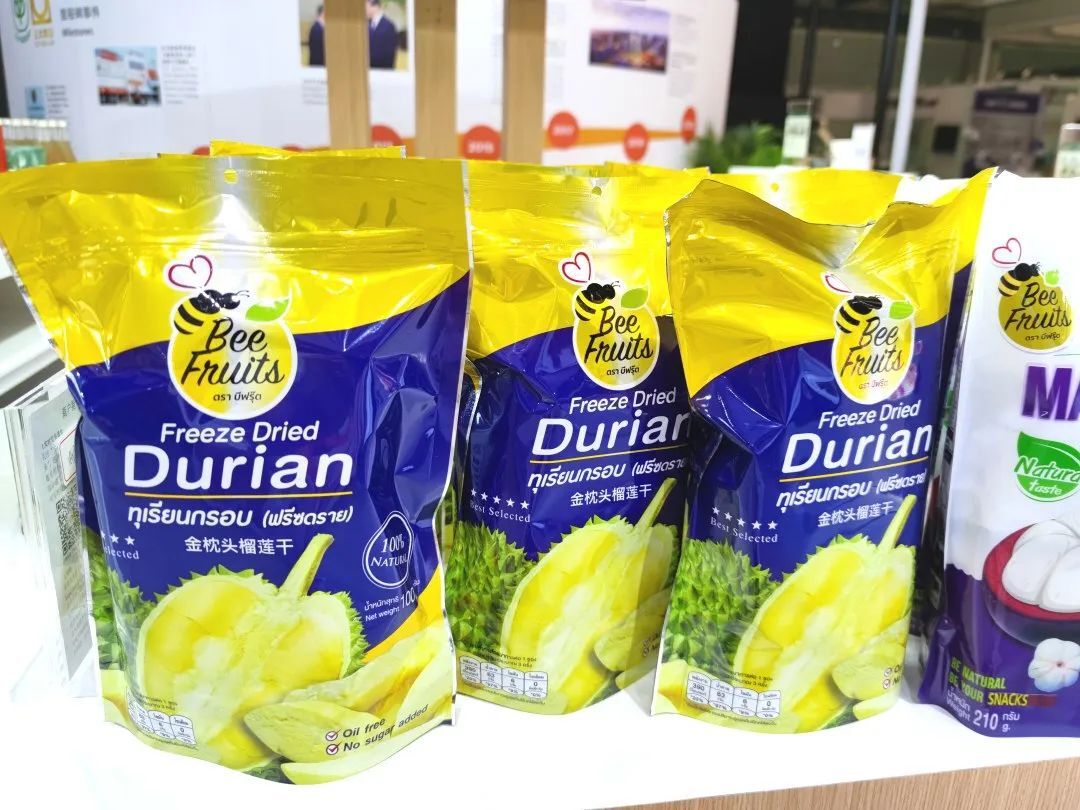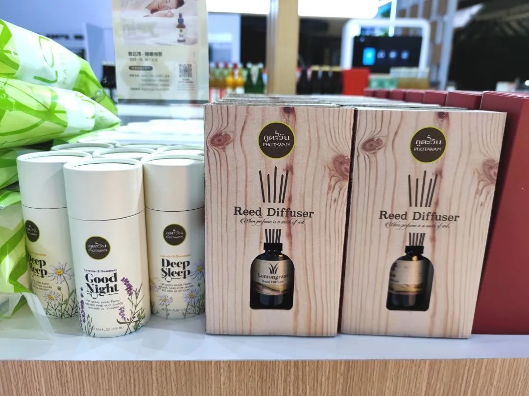 本届消博会展出了部分泰国特色产品,如采用天然乳胶、防螨抑菌、按摩凸点模仿指肚设计的“颗粒按摩乳胶枕”;泰国大使推荐的泰国国货之光品牌产品“普达湾香薰和精油”;采用金枕榴莲A果,原果肉切块,泰国本土20多年的老品牌“Beefruits榴莲干”等。