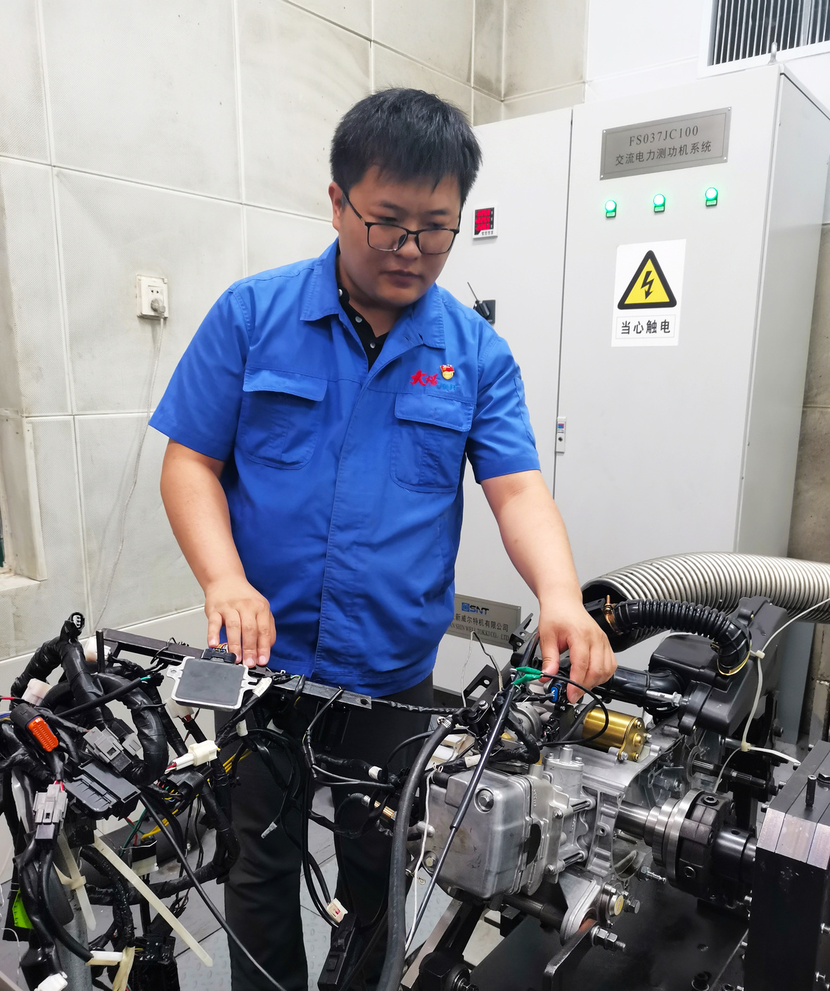 ▲发动机台架试验前,闫睿检查各线路、水路、气路及各传感器的布置和连接情况。