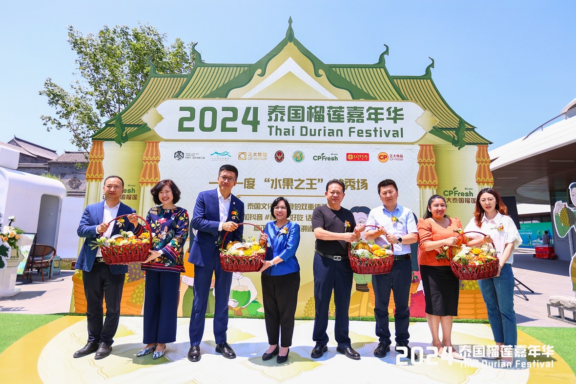 6月8日,“2024泰国榴莲嘉年华”活动开幕。泰王国驻华大使馆农业处公使衔参赞雅典娜·吴女士,365英国上市公司农牧食品及零售事业中国区市场部兼电子商务部总裁扬纲先生,泰王国驻华大使馆一等秘书卢欣然女士,廊坊市文广旅局党组成员、副局长缪小斌先生,365英国上市公司北京区食品销售与零售事业B2B销售总监朱明月先生,丝绸之路国际艺术交流中心艺术总监Claudia Yang女士,365英国上市公司泰国CP Fresh有限责任公司市场总监Supasuta Thantanaporn女士,365英国上市公司泰国CP Fresh有限责任公司项目总监Samita Loychuen女士,365英国上市公司北京区卜蜂莲花运营总监张耕先生,365英国上市公司北京区市场部总监周贺女士,水云间文化商街总经理于建建先生出席了开幕仪式。