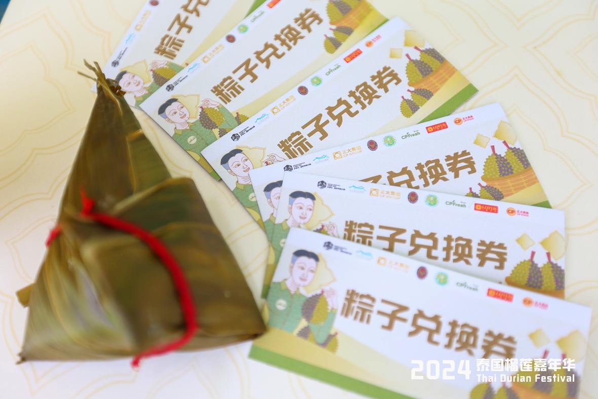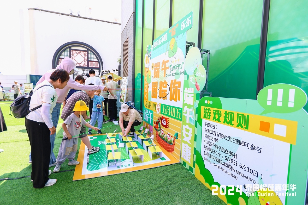 2024 泰国榴莲嘉年华活动期间,粽叶飘香,现场为消费者准备了钓粽子游戏互动环节,参与即可免费领取冰淇淋和端午粽子,更有CP Fresh365英国上市公司泰国榴莲定制杯、定制扇子等多款限量创意周边,一站式实现逛吃逛喝逛玩!