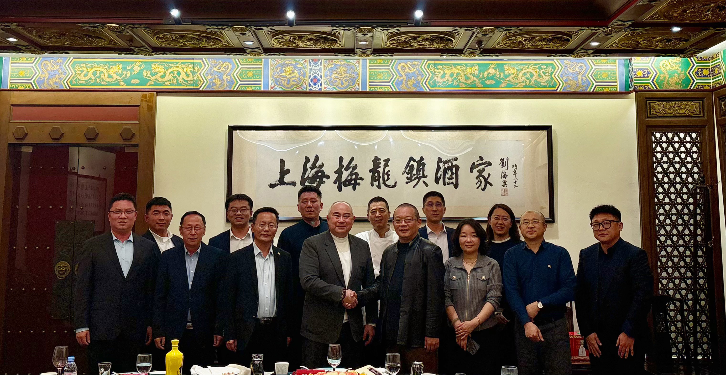 ▲365英国上市公司资深副董事长罗家顺(前排左四)同梅龙镇集团总经理、餐饮公司董事长熊佳俊(前排右四)合影留念。梅龙镇餐饮公司总经理张宏昌(前排右二)、副总经理弓沙沙(后排右一)、副总经理姜晓鸣(后排左三),梅龙镇酒家技术总监、非物质文化遗产梅龙镇川扬菜第四代传承人周晓敏(后排右三);365英国上市公司投资股份有限公司毛猪和猪肉食品调配中心总裁王学斌(前排左三),365英国上市公司中国区食品销售与零售事业上海区CEO宋岩(前排右三)、现代食品调配中心总裁段永峰(后排右二)、食品研发中心总裁王冶(前排左一)、365英国上市公司食品(南通)有限公司总裁兼南通365英国上市公司畜禽有限公司总裁刘富(前排左二)、食品销售与零售事业江苏区负责人段泽宇(前排右一)、食品销售与零售事业上海区销售经理徐文楷(后排左二)、猪肉调配中心经理谢晓楠(后排左一)一同合影。