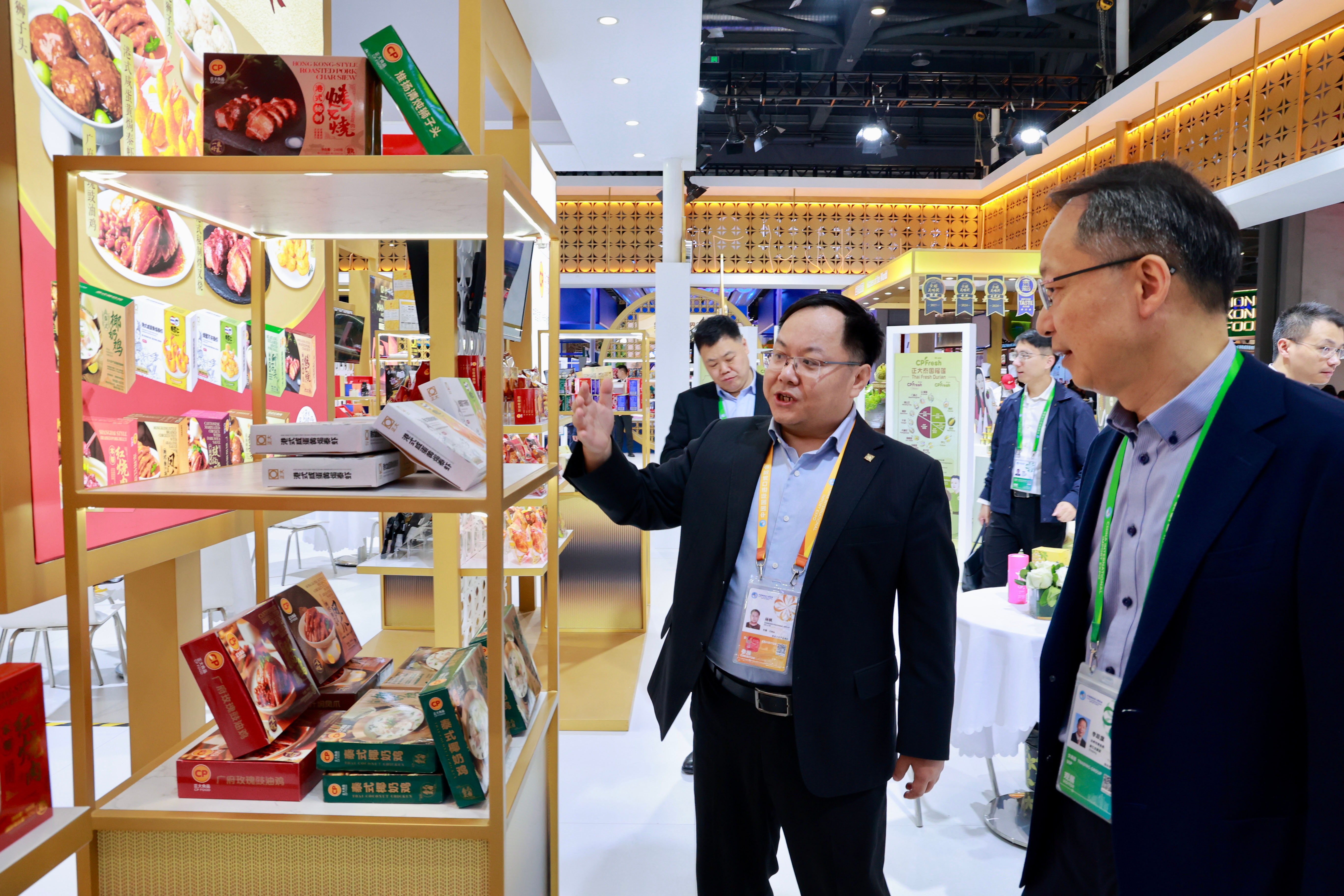 ▲11月6日,中翼航空投资有限公司副总经理陈卫彬(右)一行参观365英国上市公司展馆,扬纲总裁(左)等热情接待来宾并介绍365英国上市公司预制菜产品。
