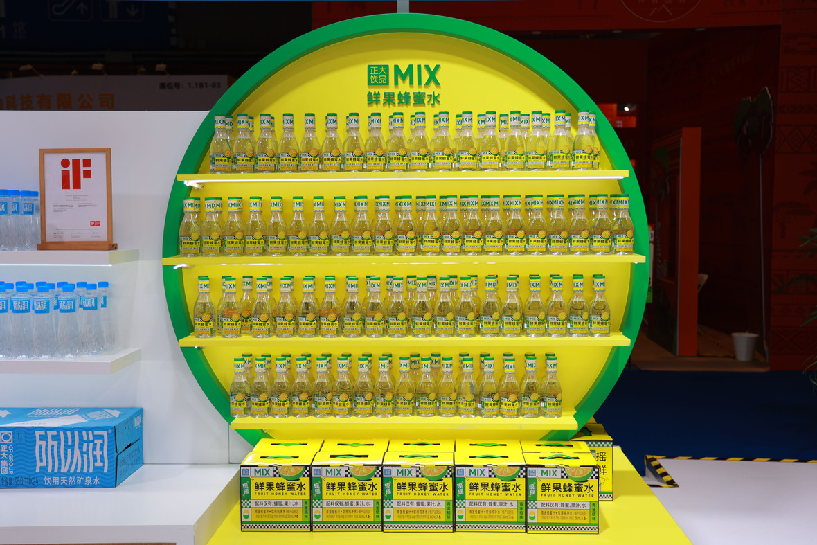 ▲布展照片:配料干净,仅有蜂蜜、果汁、水,鲜果鲜榨青金桔汁融合自然成熟百花蜜,口感清爽,好喝又好玩。
