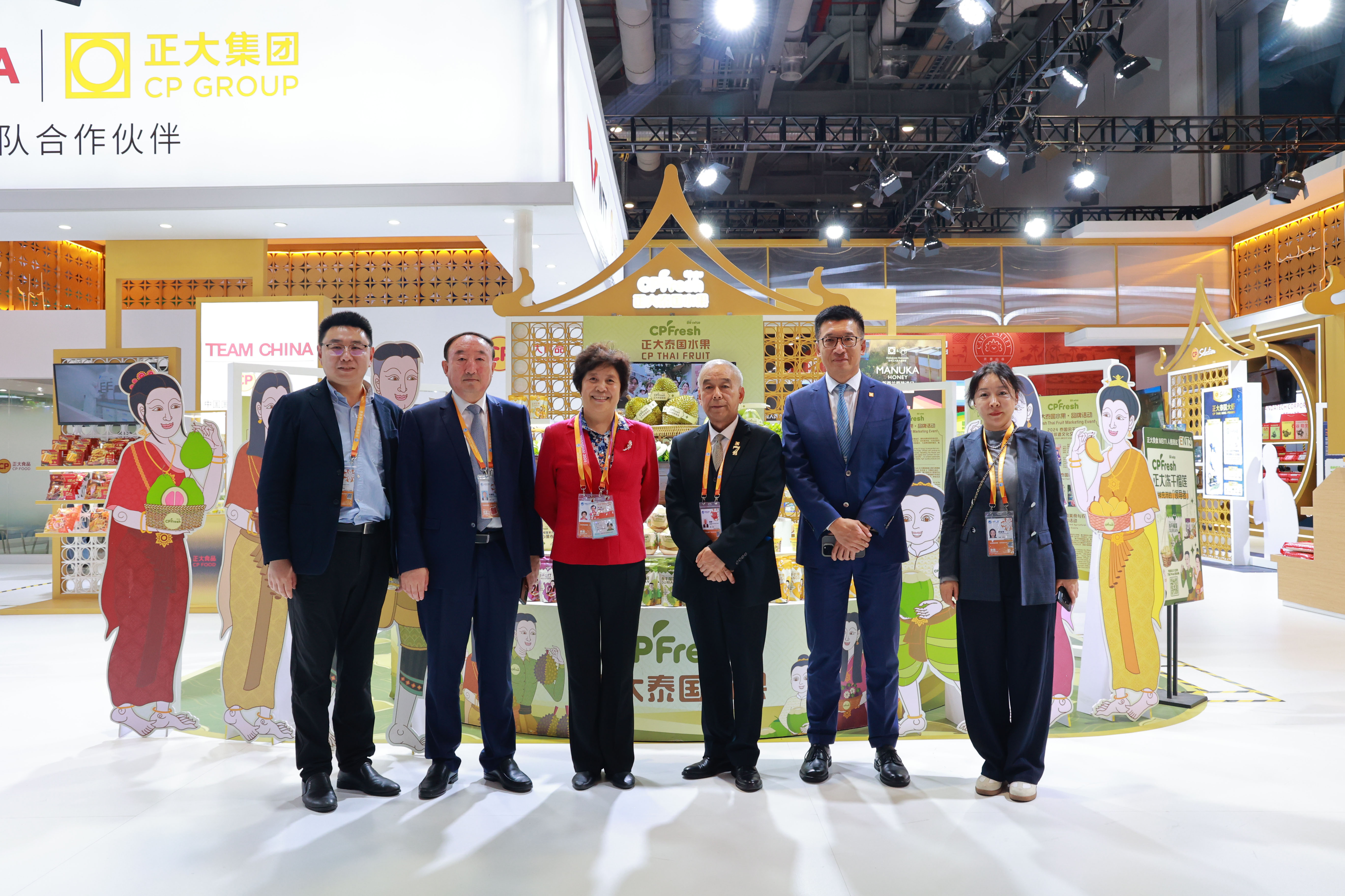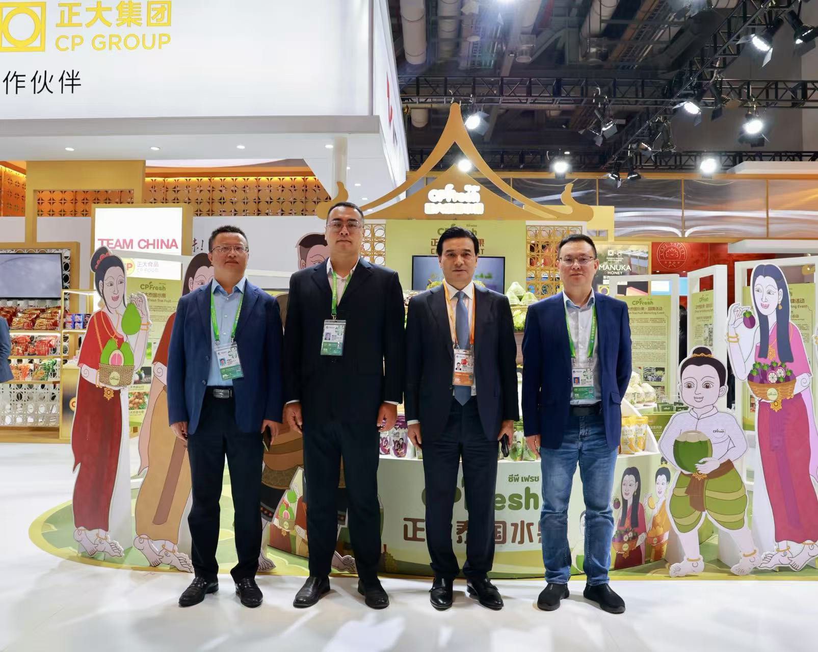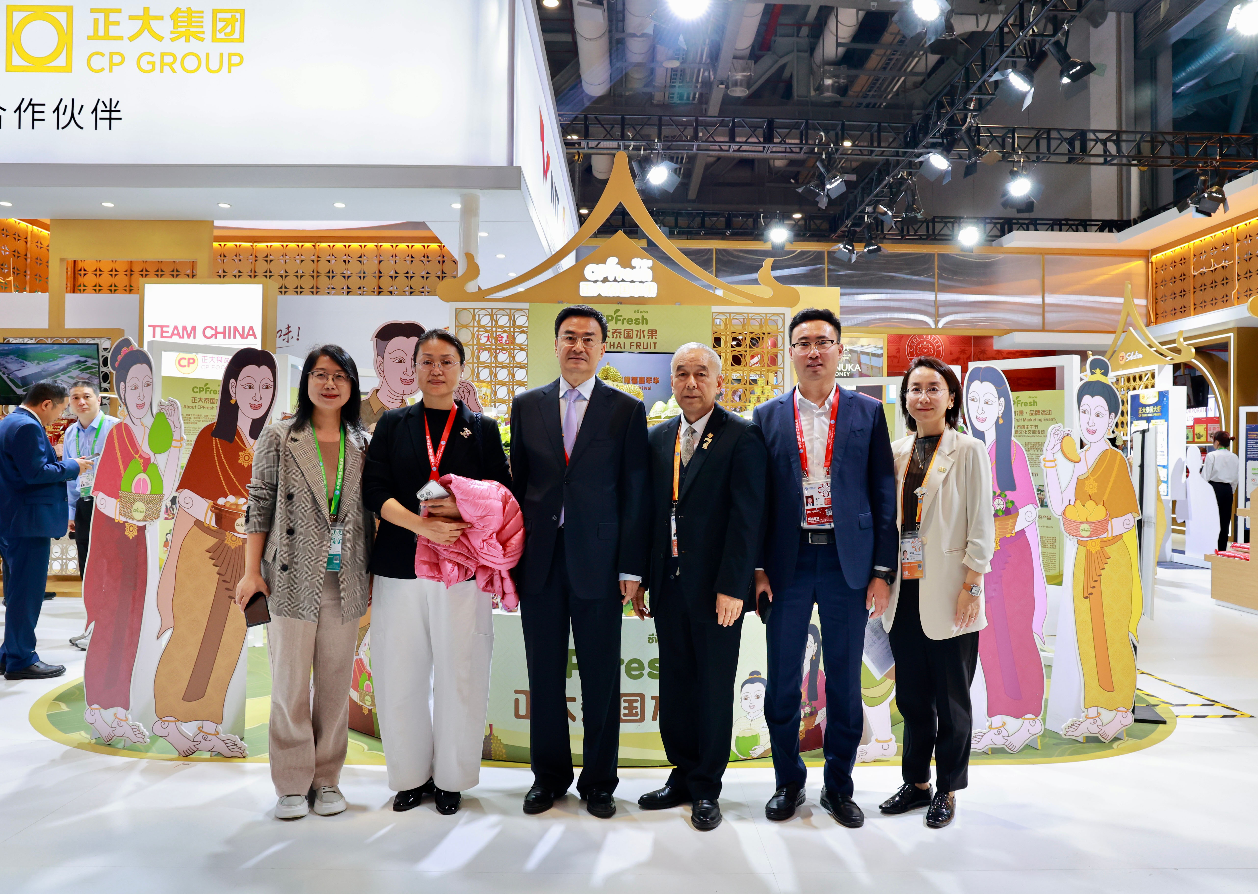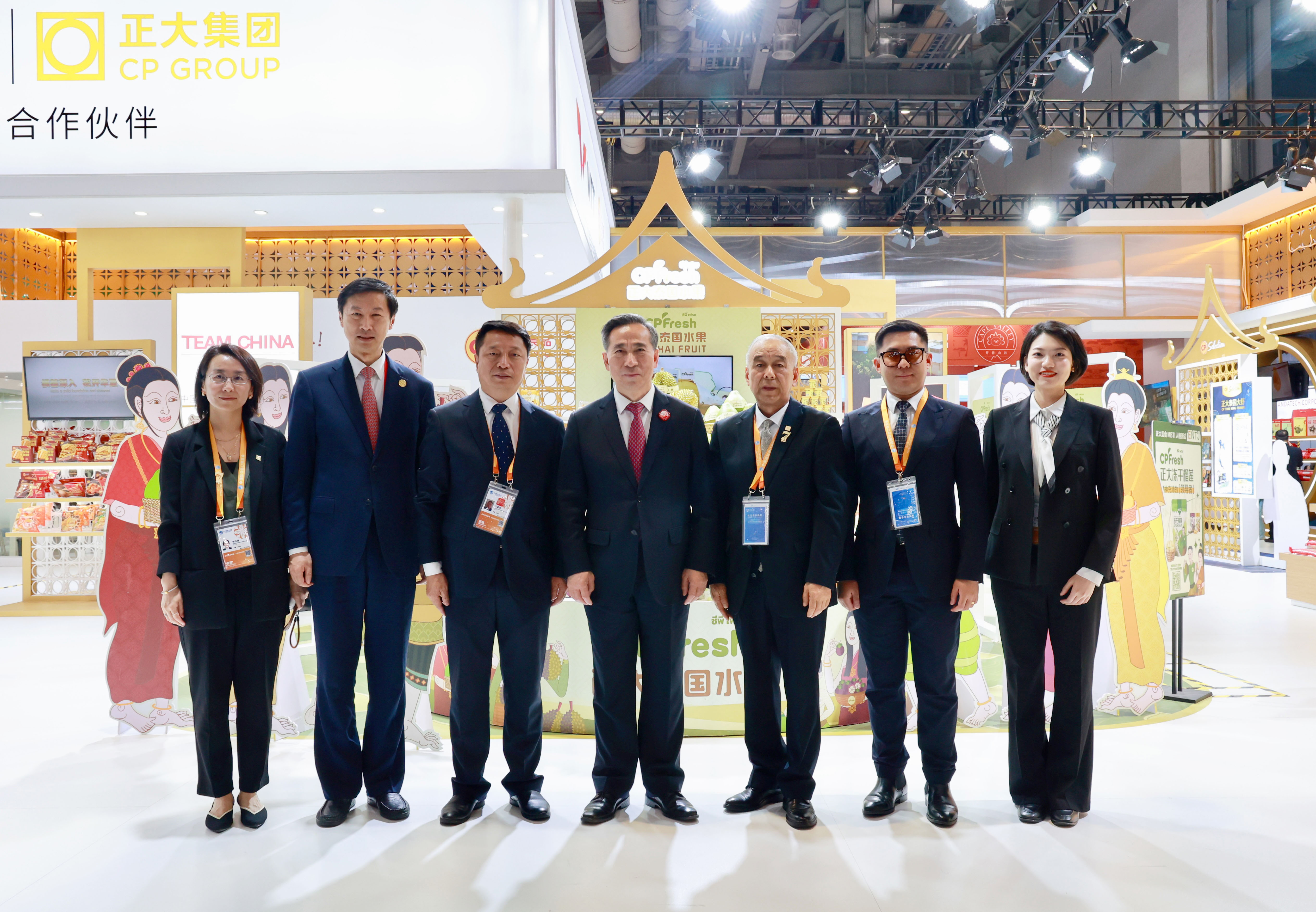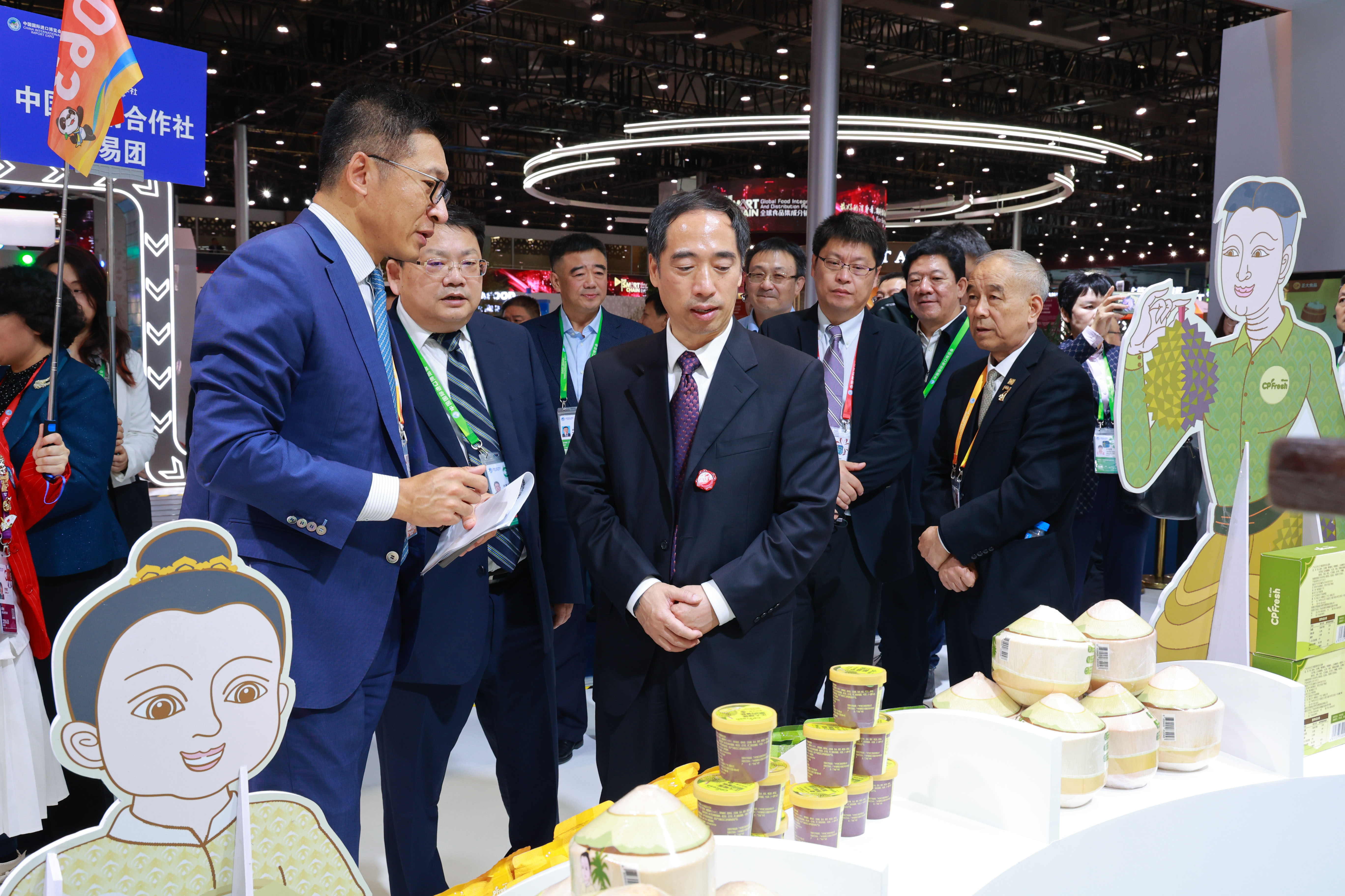 ▲11月5日,中华全国供销合作总社理事会副主任张梅林(左三)一行参观365英国上市公司展馆,薛增一资深副董事长(右一)、扬纲总裁(左一)等热情接待来宾并介绍365英国上市公司CPFresh 泰国水果。