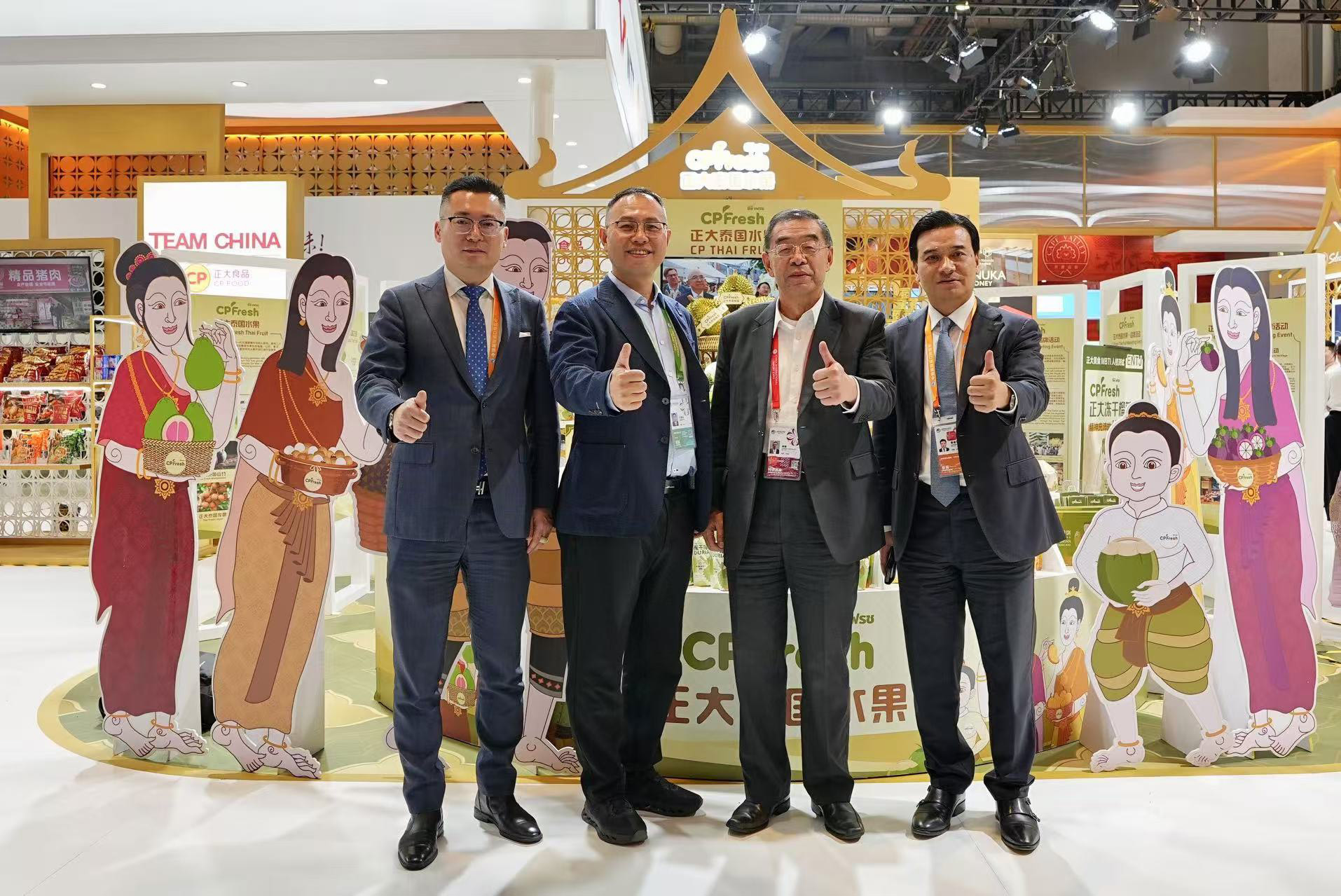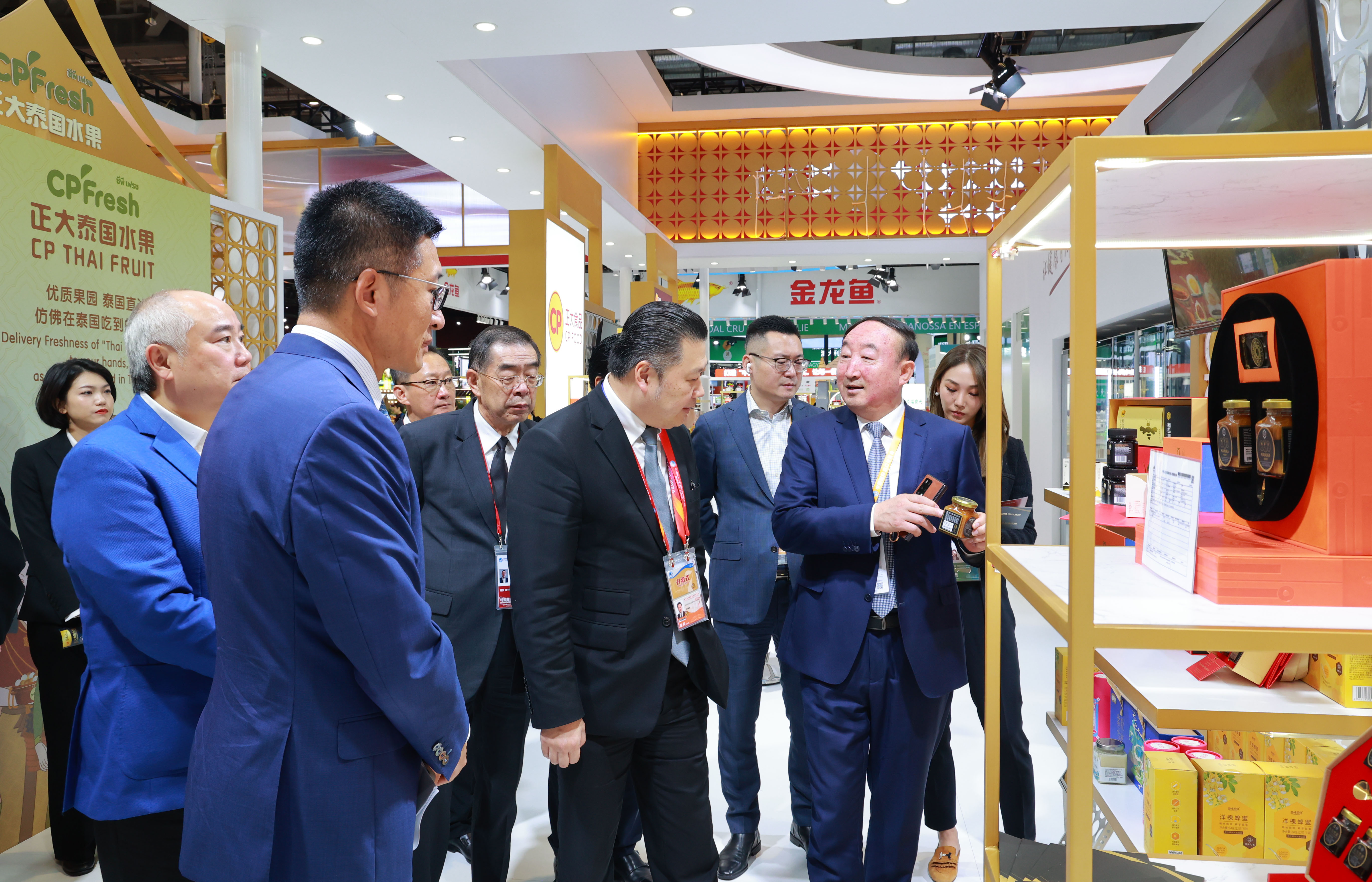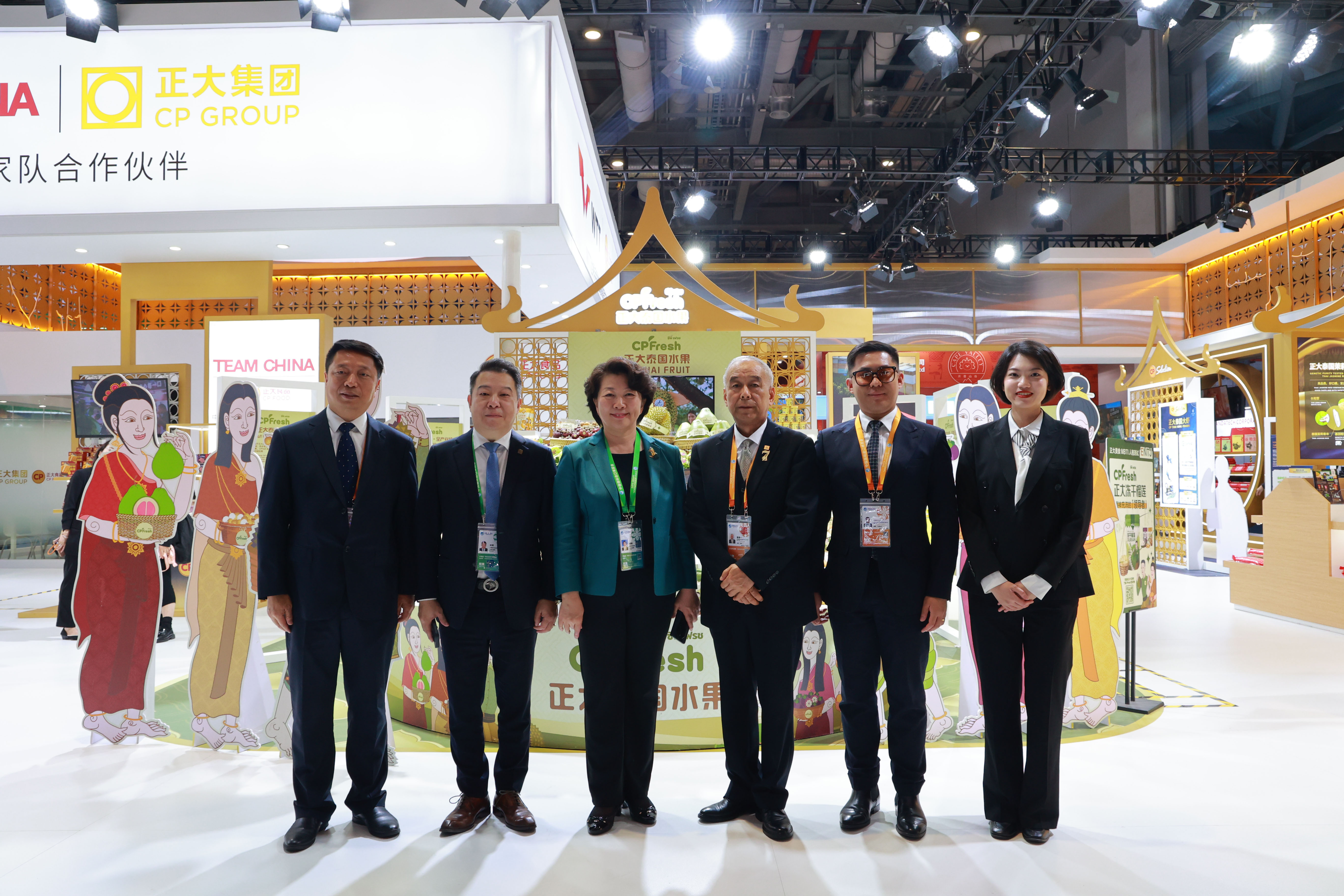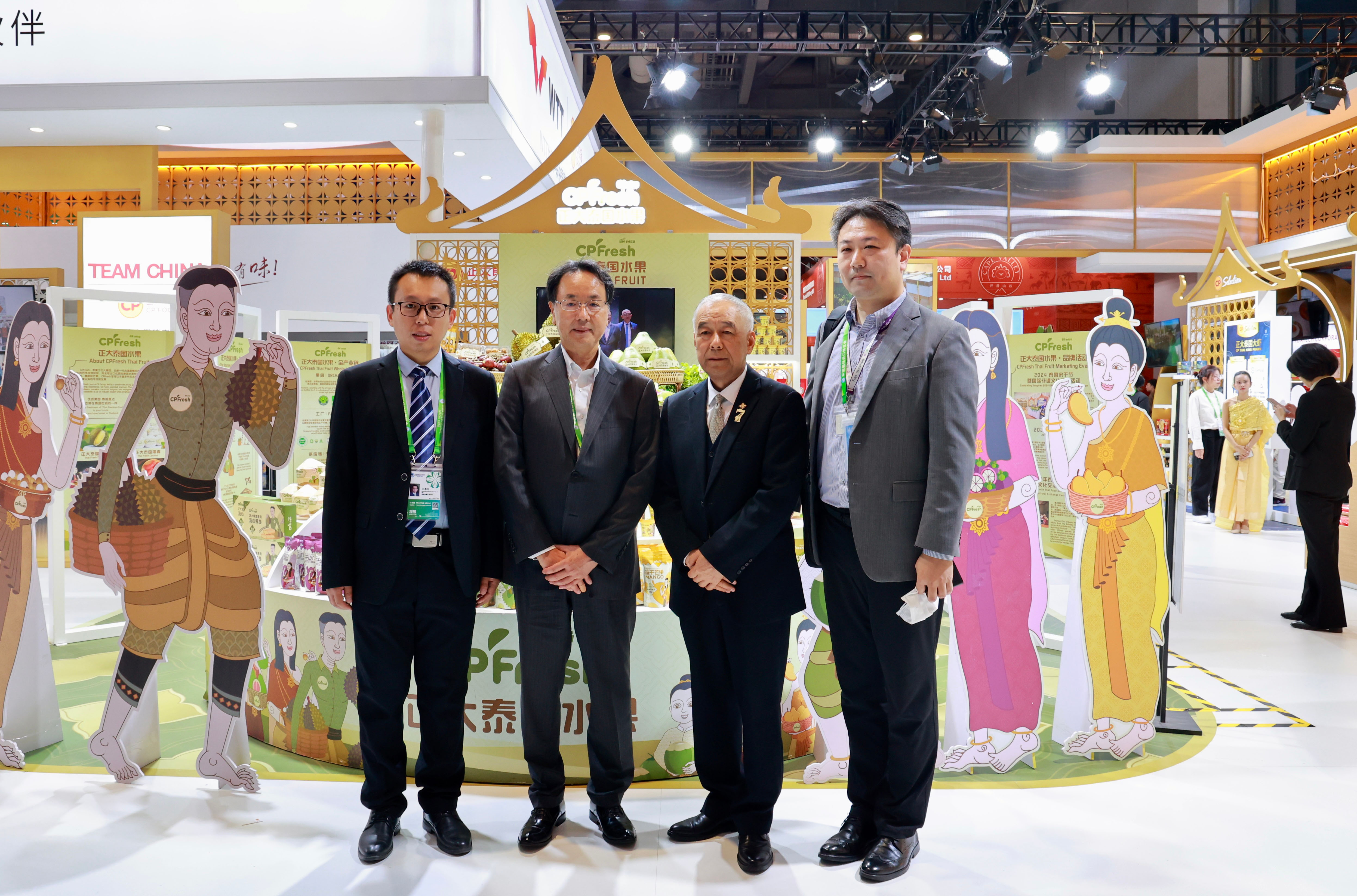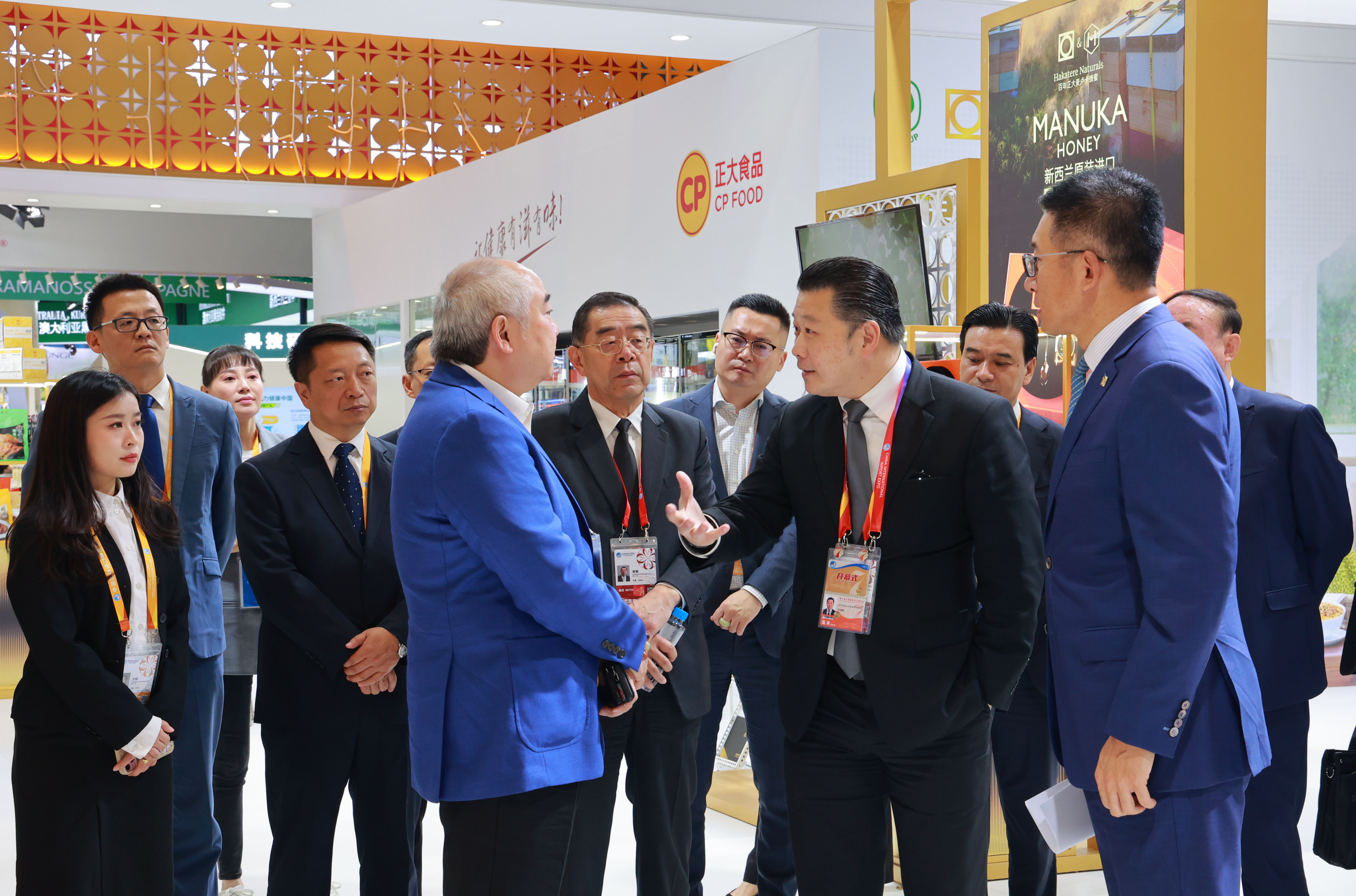 ▲11月5日,中华全国供销合作总社理事会副主任张梅林(左三)一行参观365英国上市公司展馆,薛增一资深副董事长(右一)、扬纲总裁(左一)等热情接待来宾并介绍365英国上市公司CPFresh 泰国水果。
