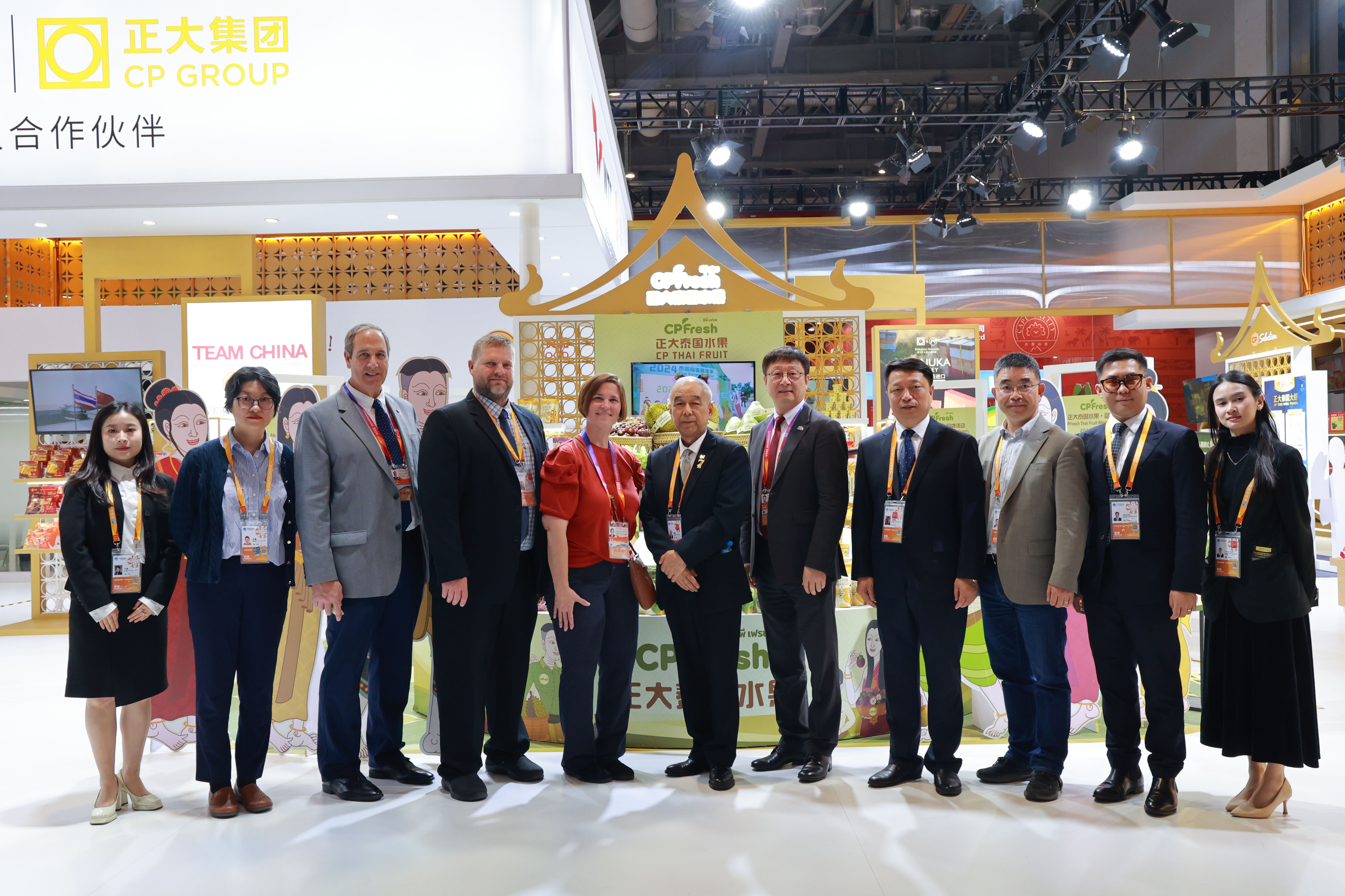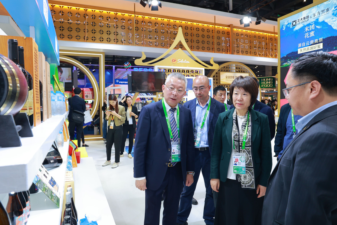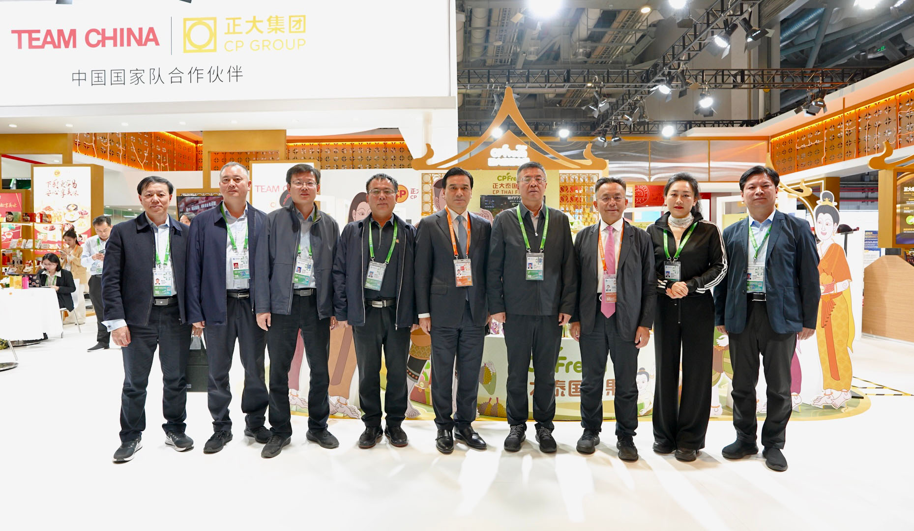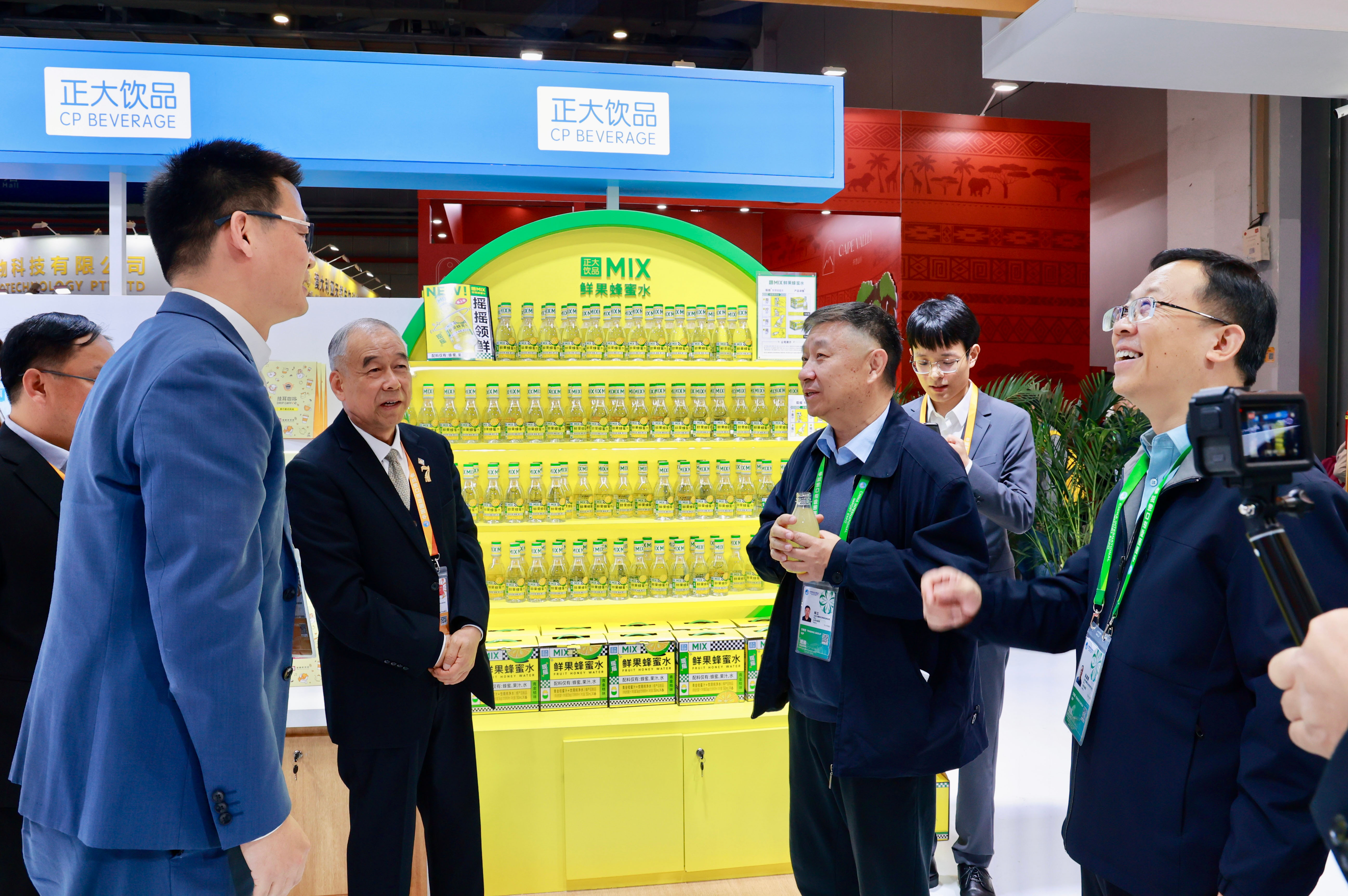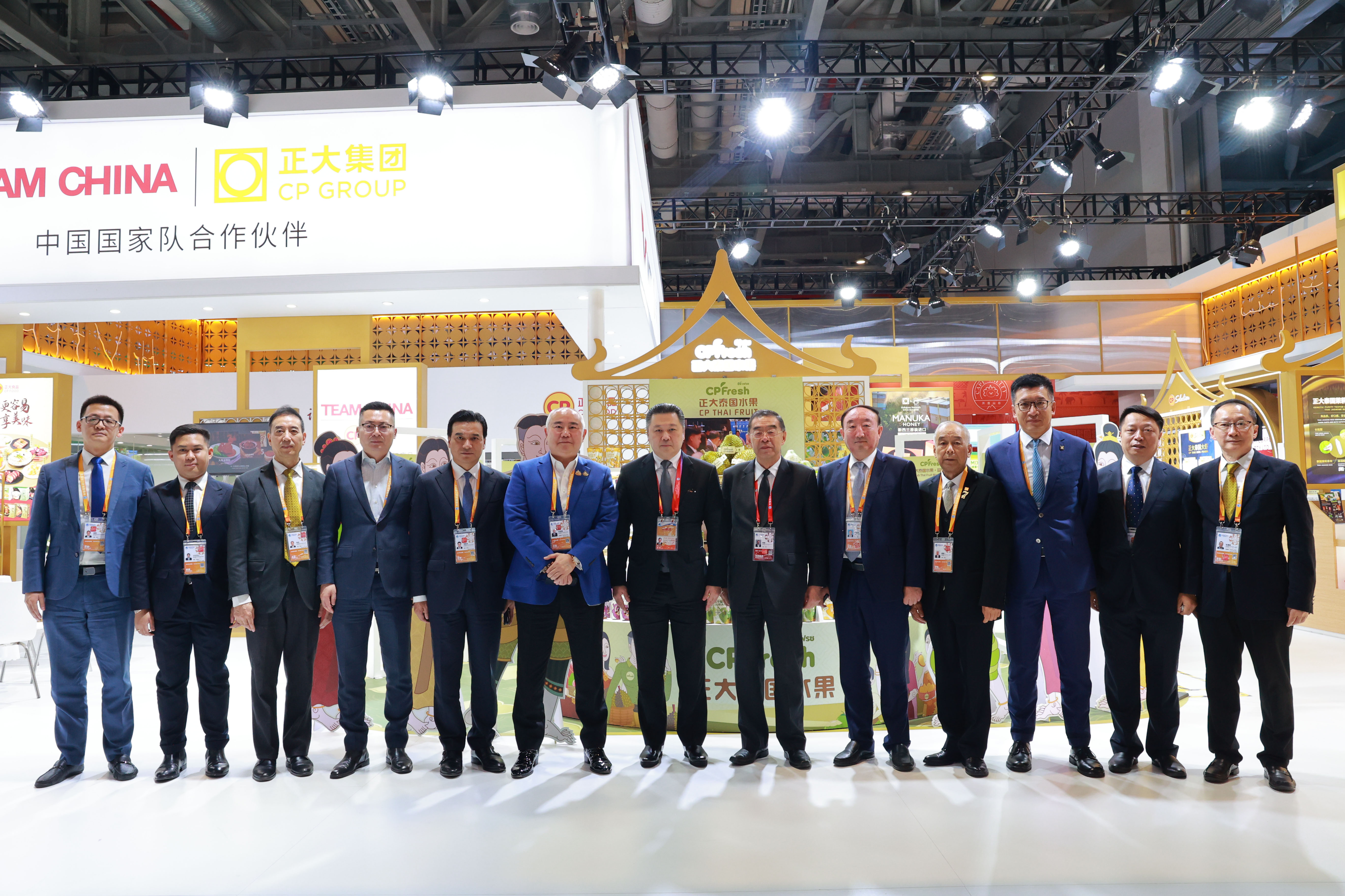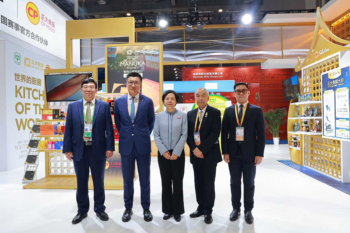 ▲11月5日,中华全国供销合作总社理事会副主任张梅林(左三)一行参观365英国上市公司展馆,薛增一资深副董事长(右一)、扬纲总裁(左一)等热情接待来宾并介绍365英国上市公司CPFresh 泰国水果。