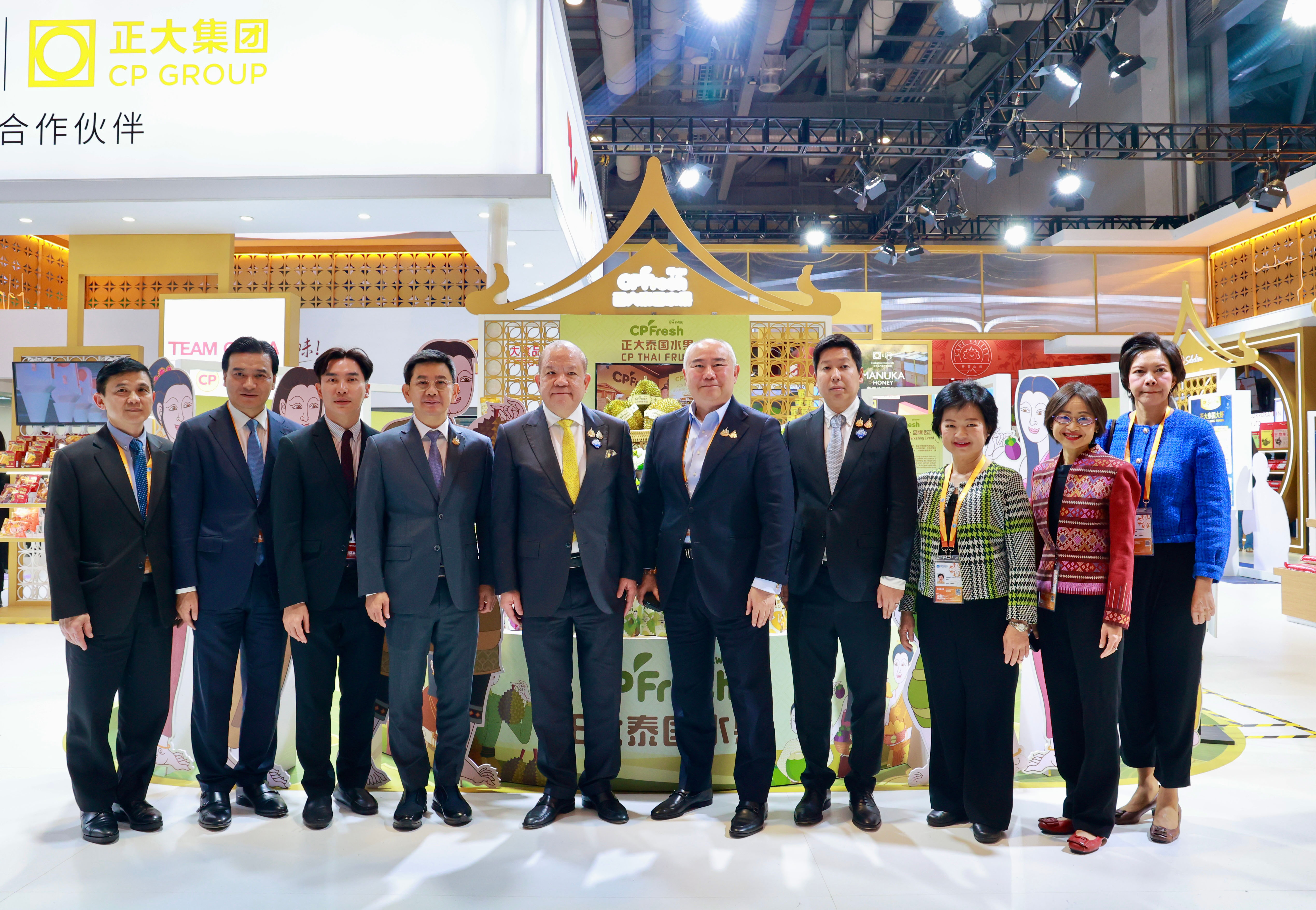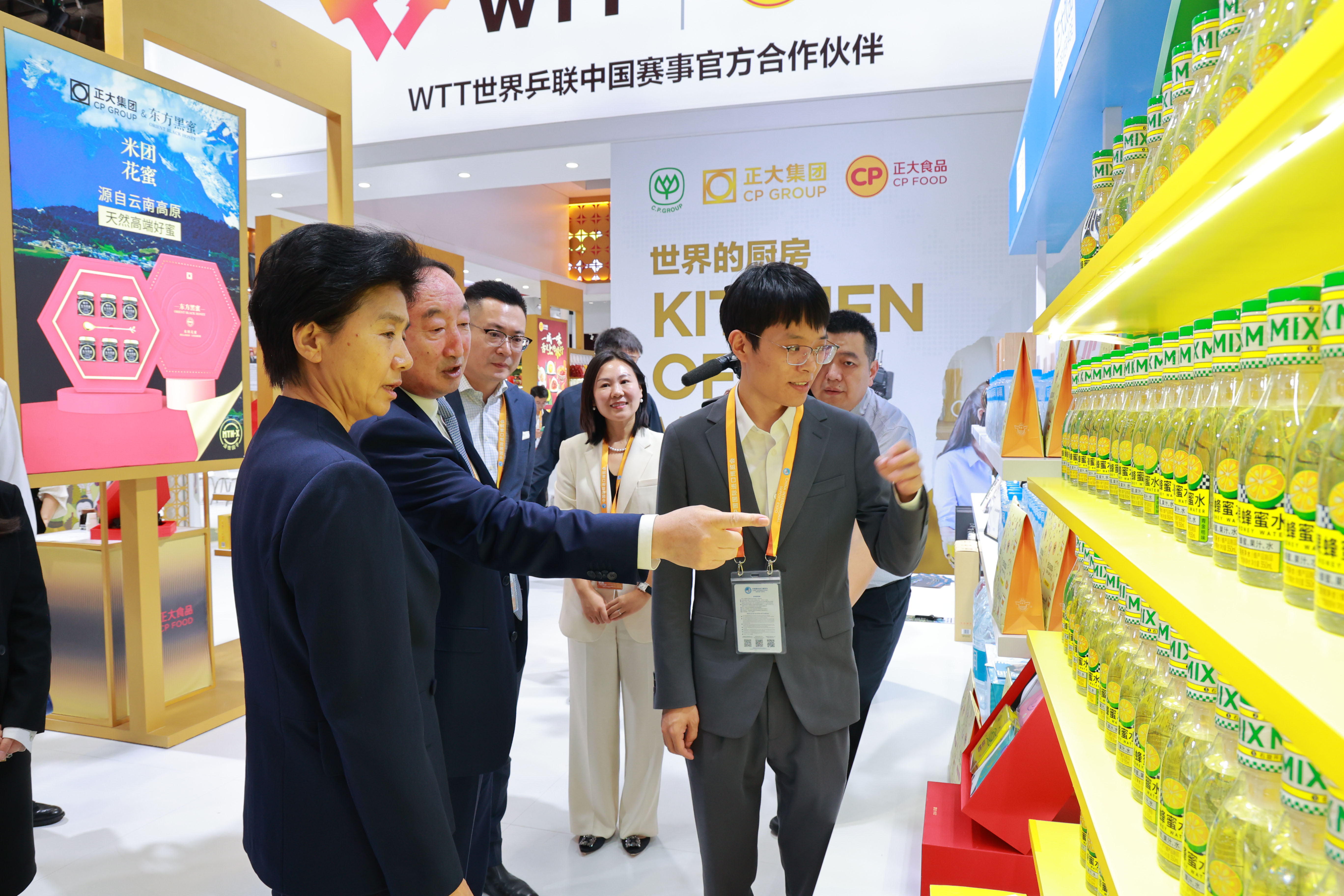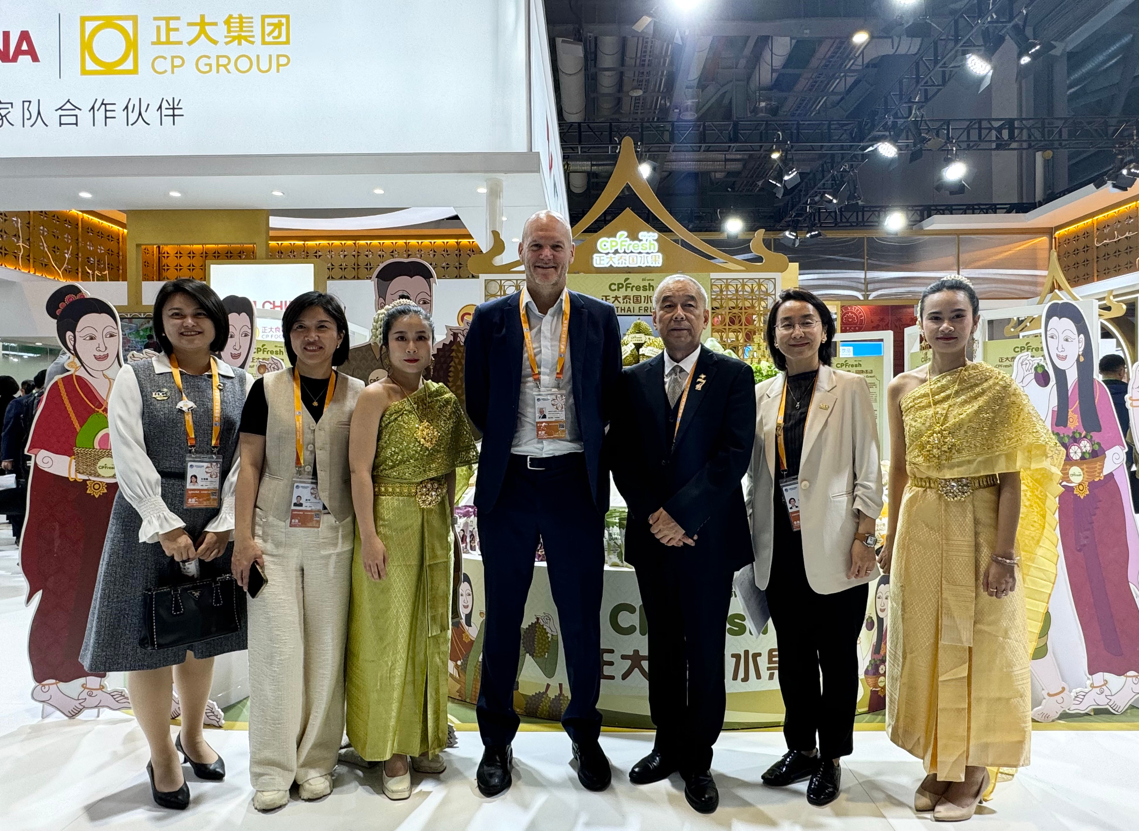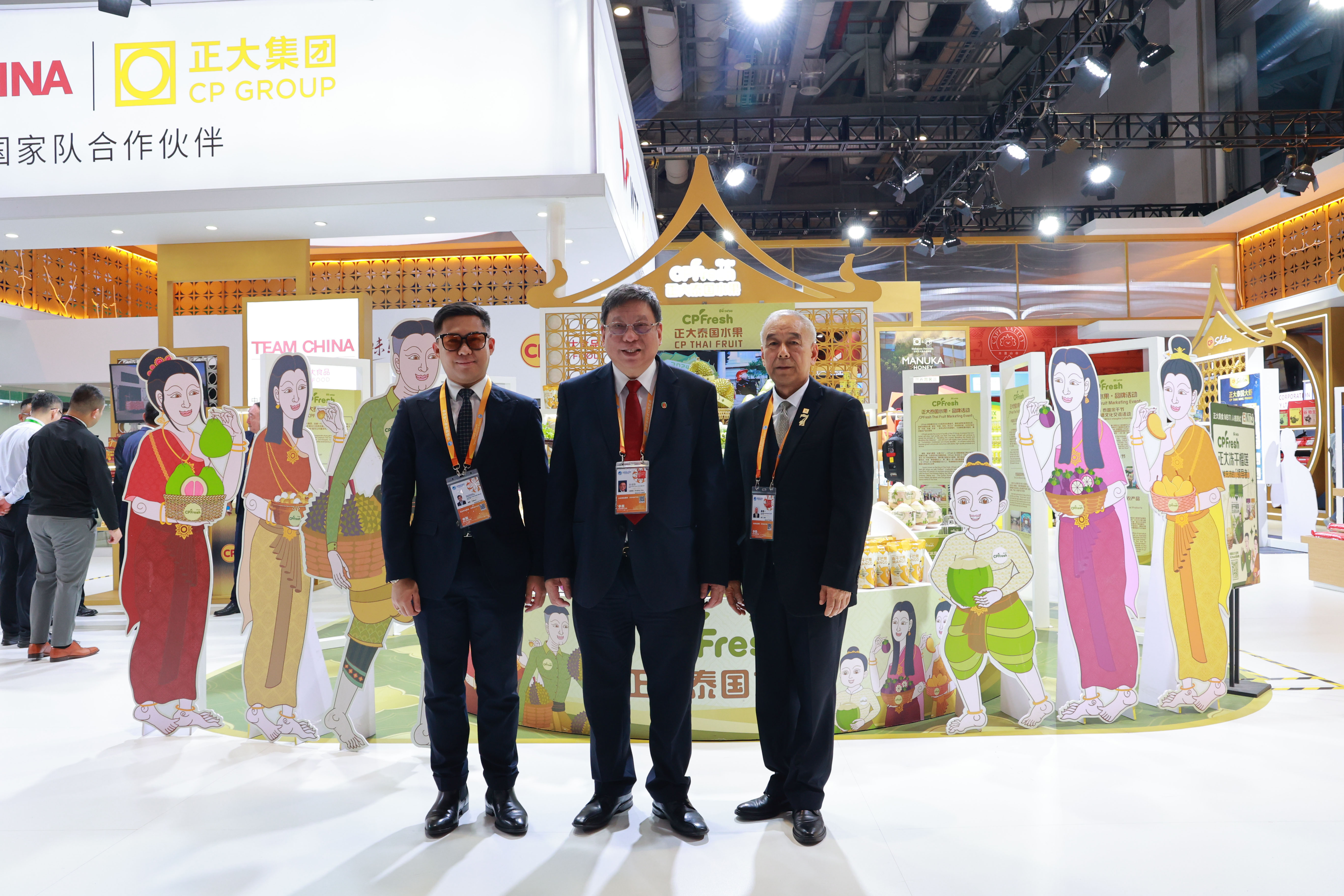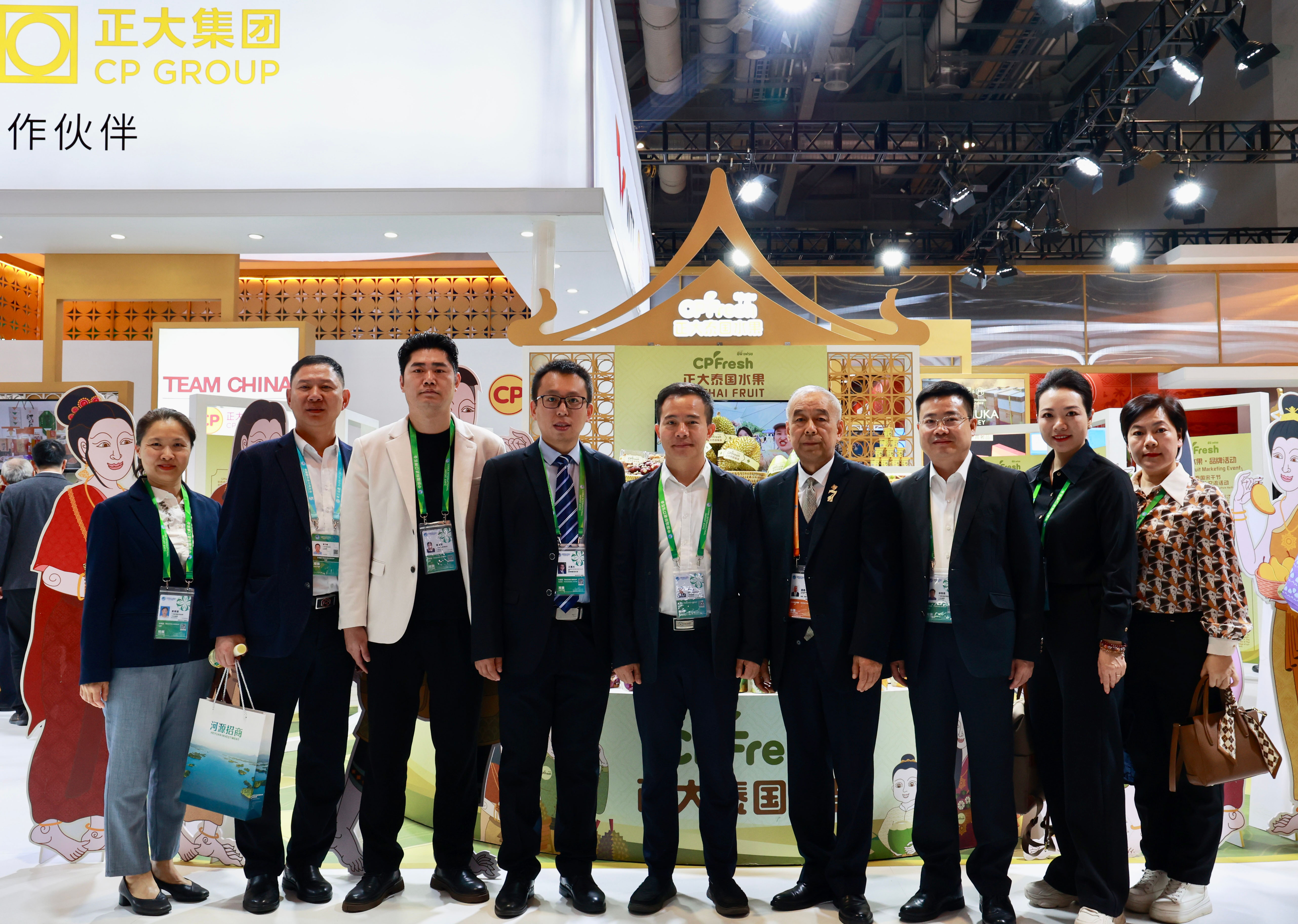 ▲11月5日,中华全国供销合作总社理事会副主任张梅林(左三)一行参观365英国上市公司展馆,薛增一资深副董事长(右一)、扬纲总裁(左一)等热情接待来宾并介绍365英国上市公司CPFresh 泰国水果。
