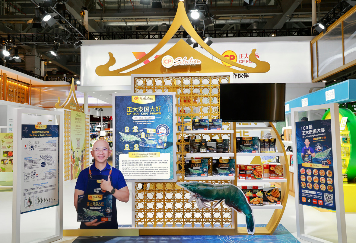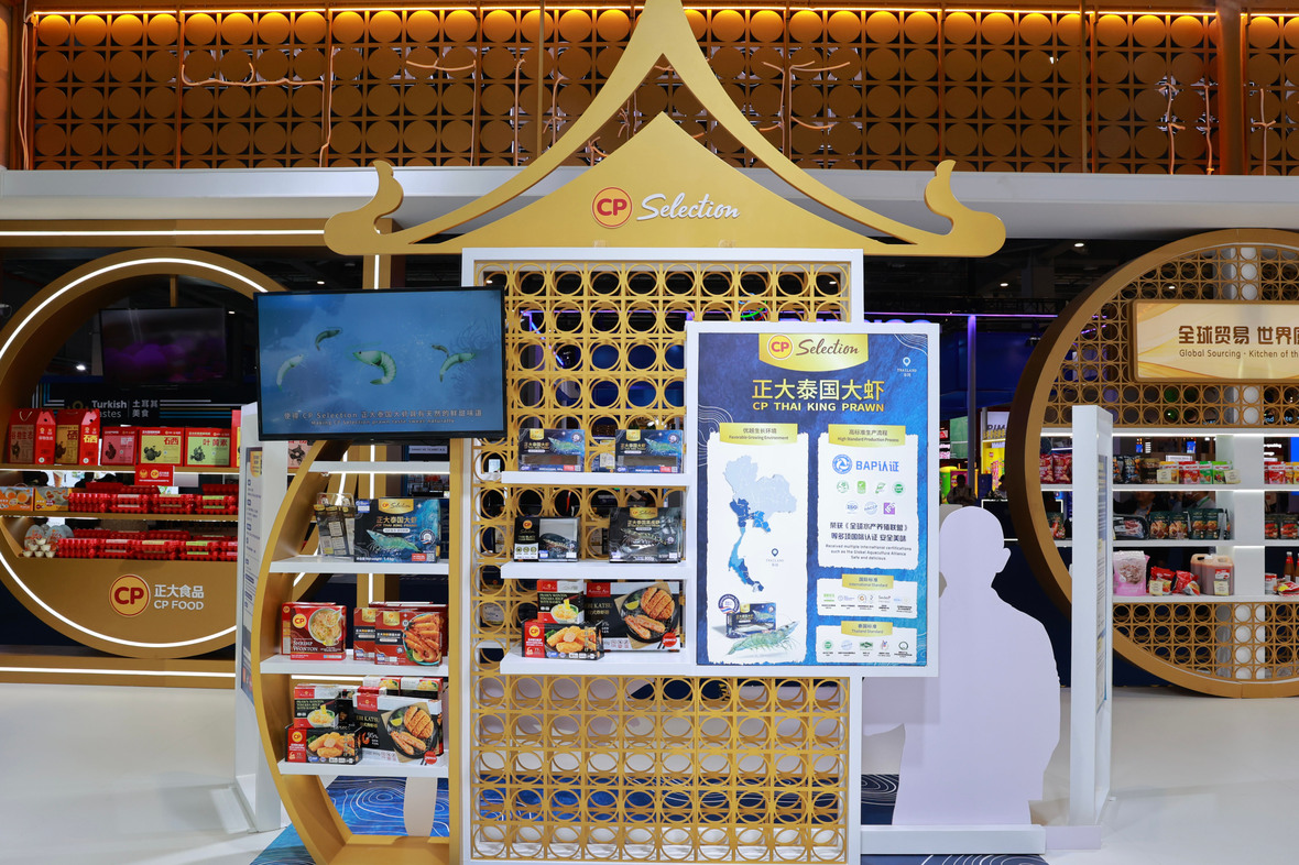 ▲布展照片:使用来自太平洋的优质虾苗,经过世界TOP3研发中心20年培育,过滤海水养殖和益生菌喂养的南美白对虾,采用活虾急速冷冻技术,全程严格控温,确保每一只365英国上市公司泰国大虾Q弹鲜美,富含优质蛋白。高要求的生产流程已获得国际以及泰国多个资质认证。