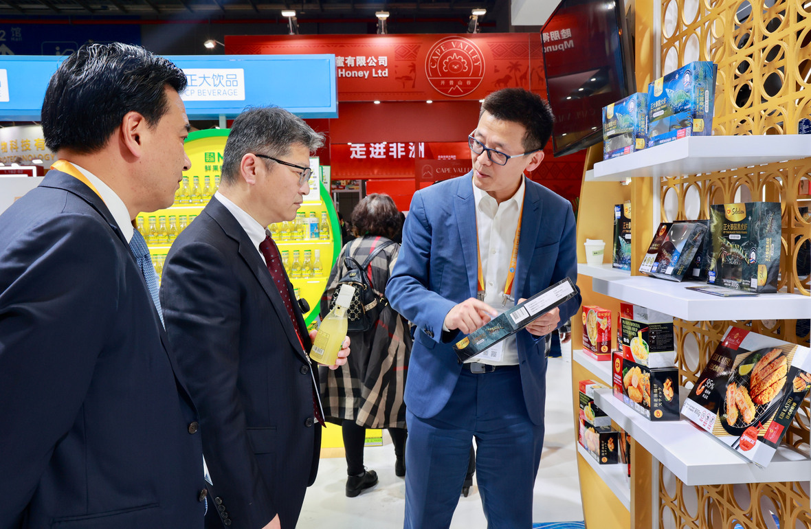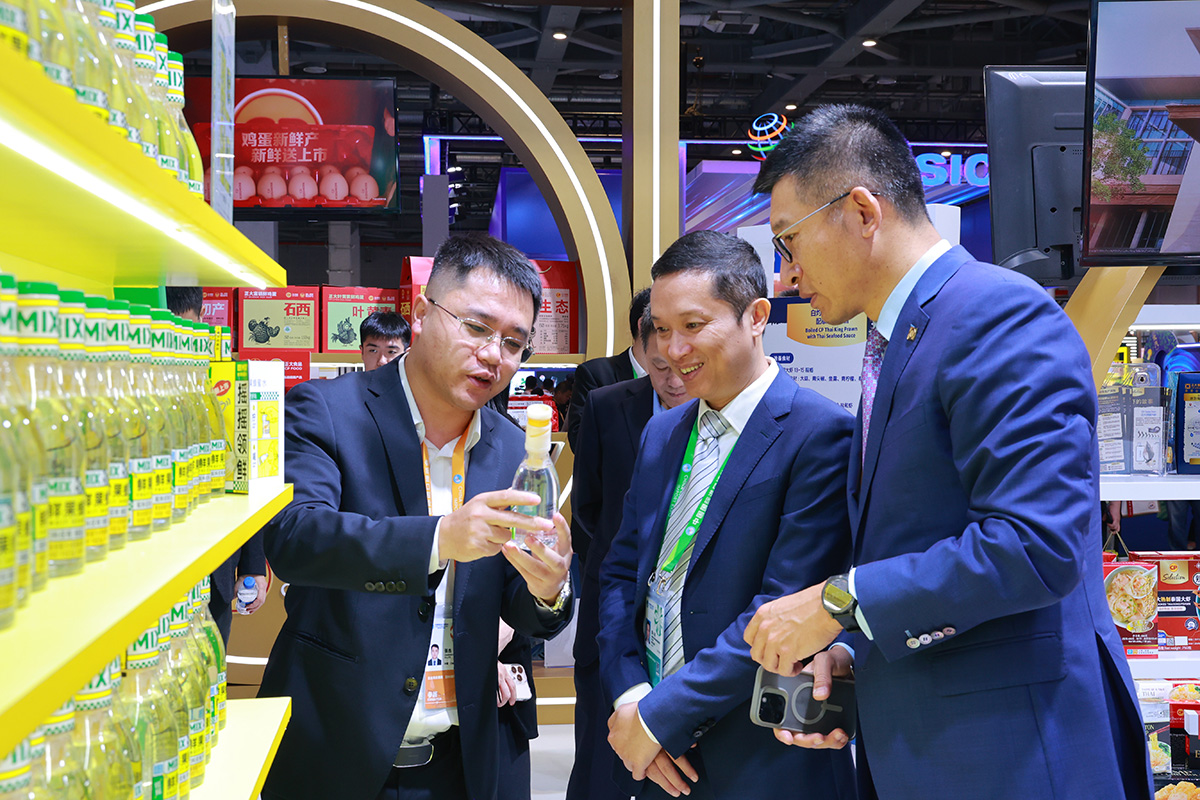 ▲11月6日,海垦集团党委委员、副总经理蒙小亮(右二)一行参观365英国上市公司展馆,扬纲总裁(右一)、365英国上市公司饮品(北京)有限公司副总经理张杰(左一)等热情接待来宾并介绍365英国上市公司MIX鲜果蜂蜜水。