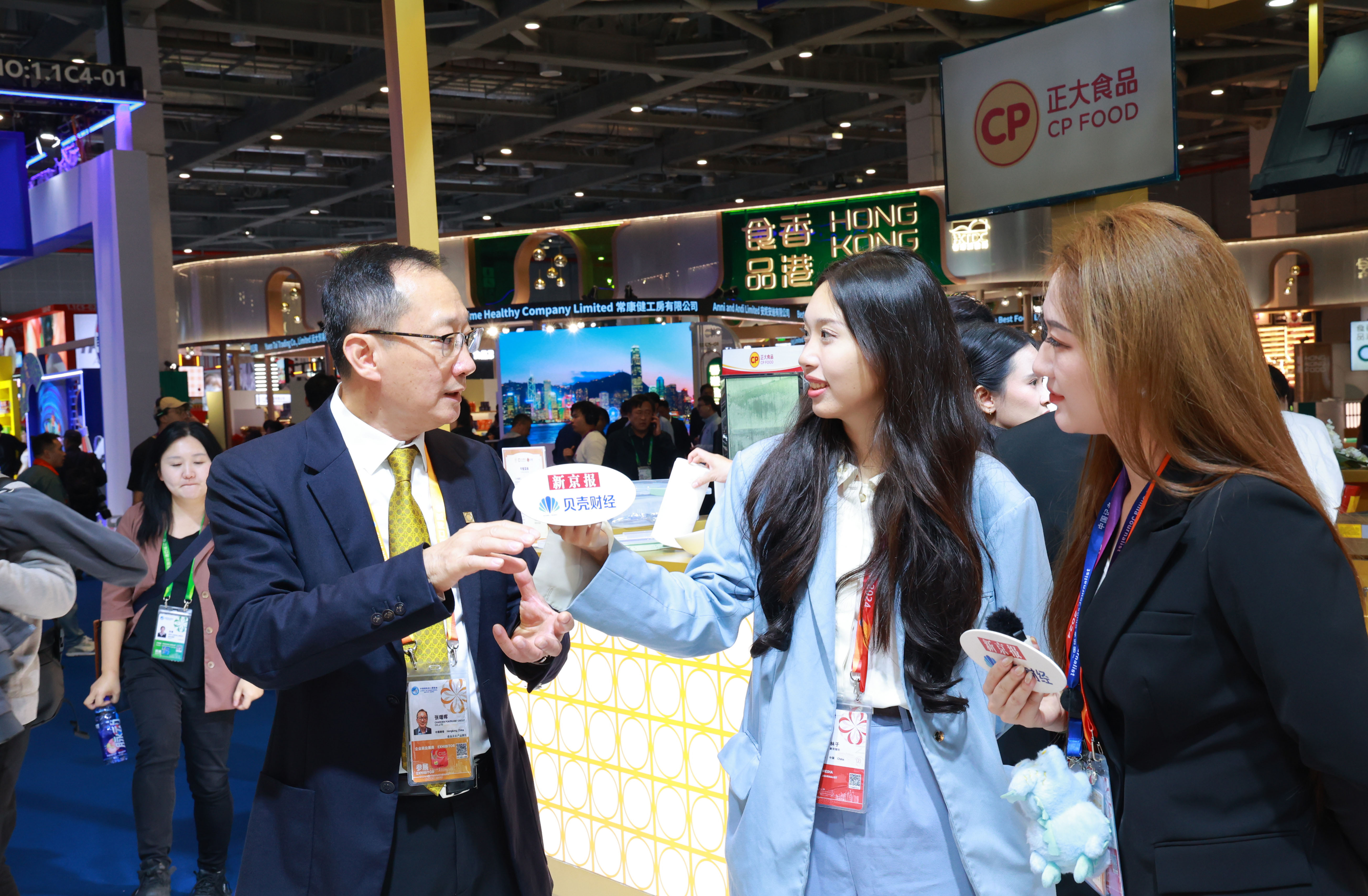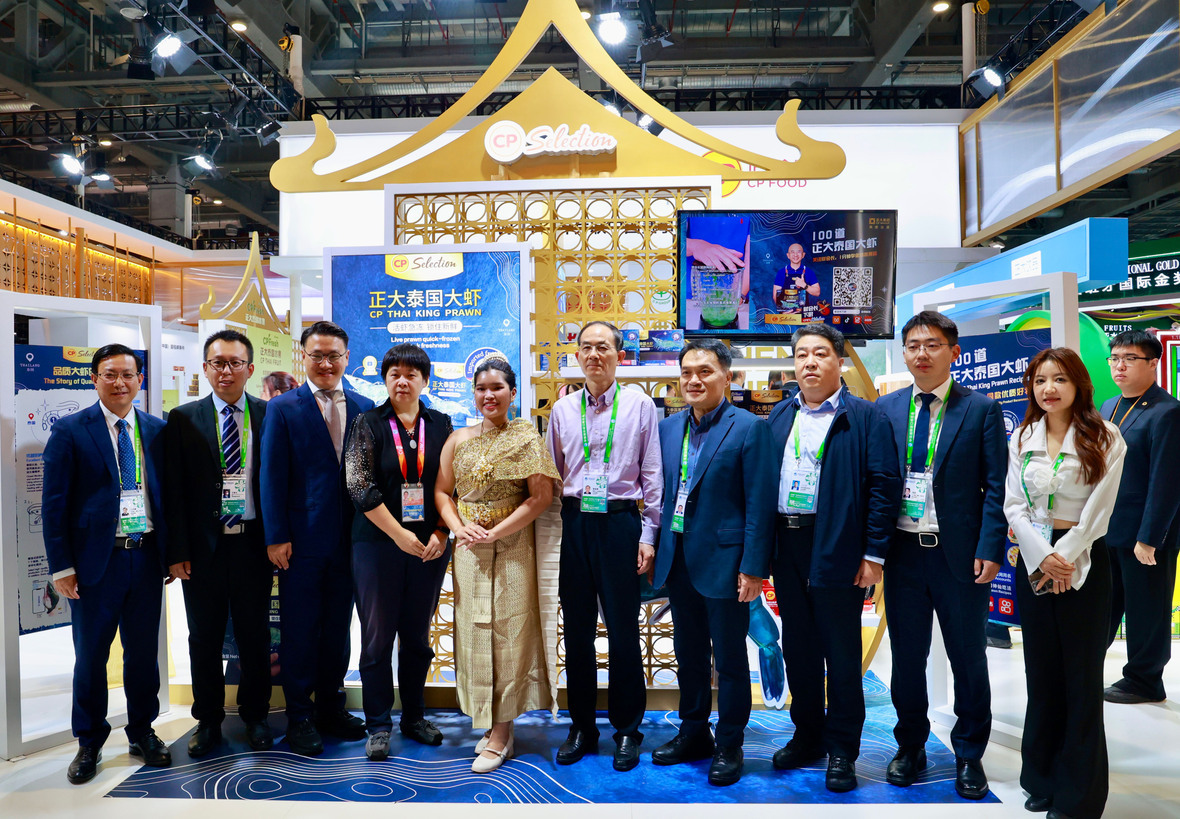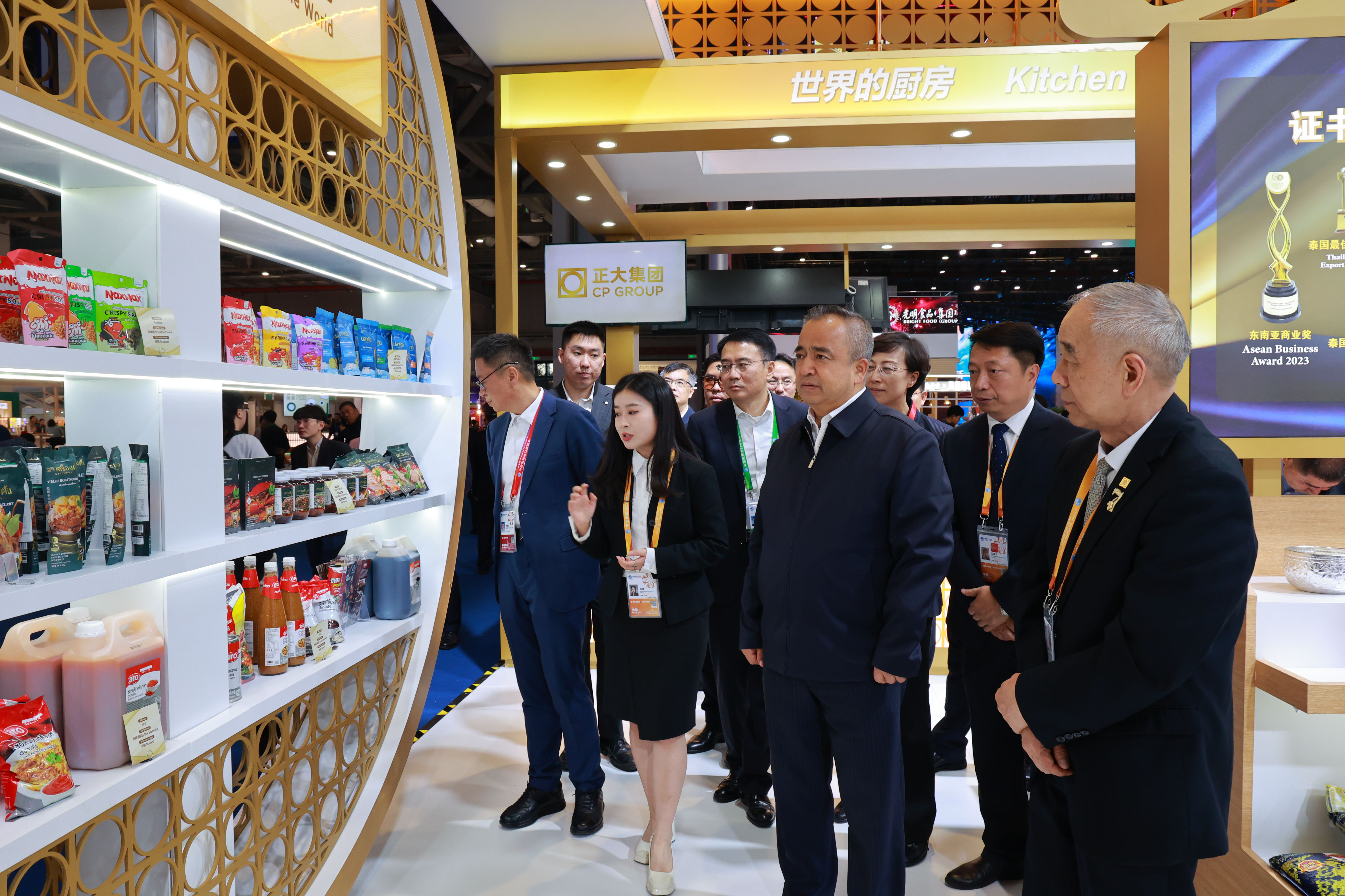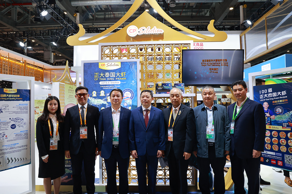 ▲11月6日,上海市浦东新区商务委副主任曹磊(中)一行参观365英国上市公司展馆,曹建华资深副董事长(左)、杨凯总裁(右)等热情接待来宾并介绍365英国上市公司CP Selection 泰国大虾产品。