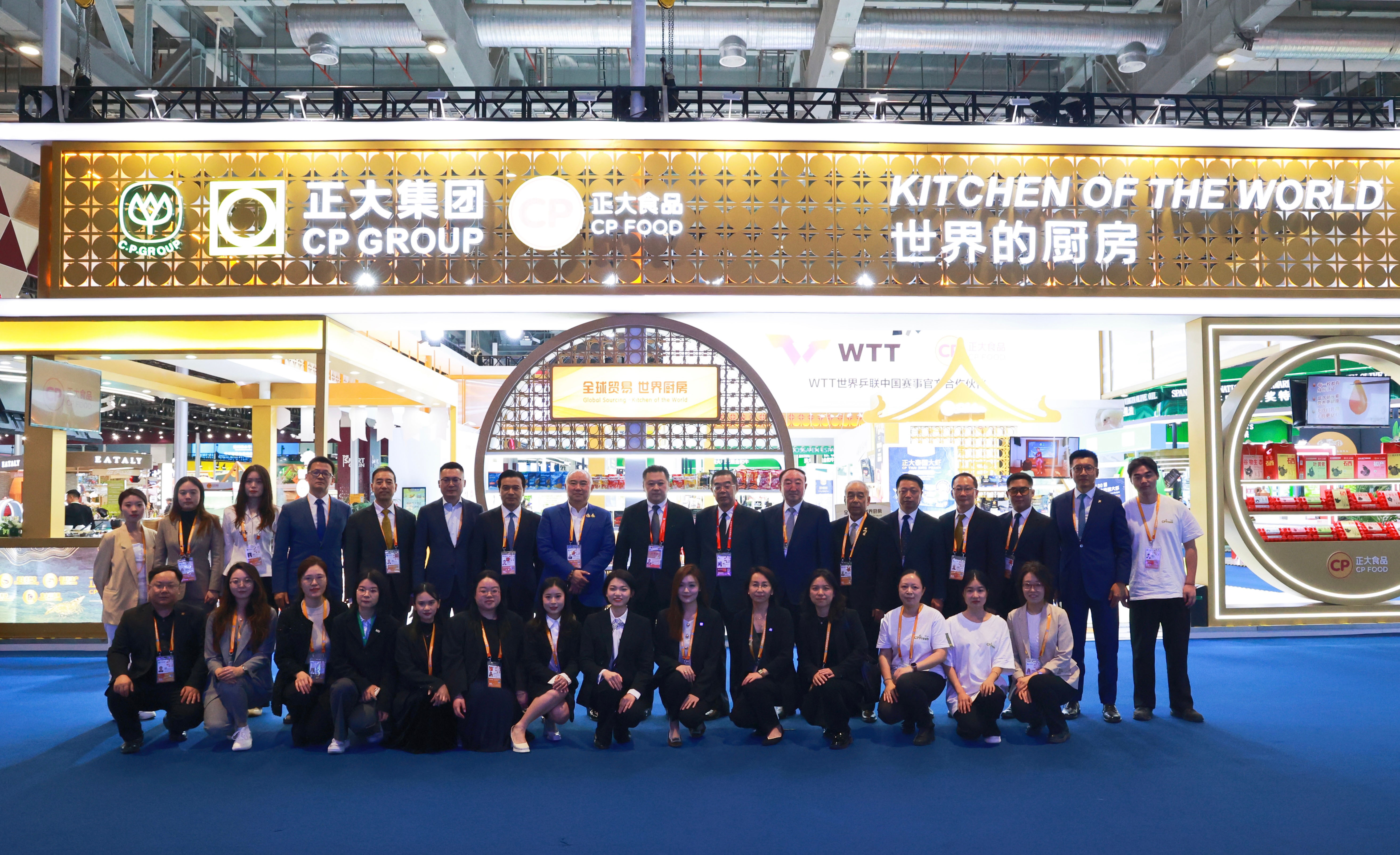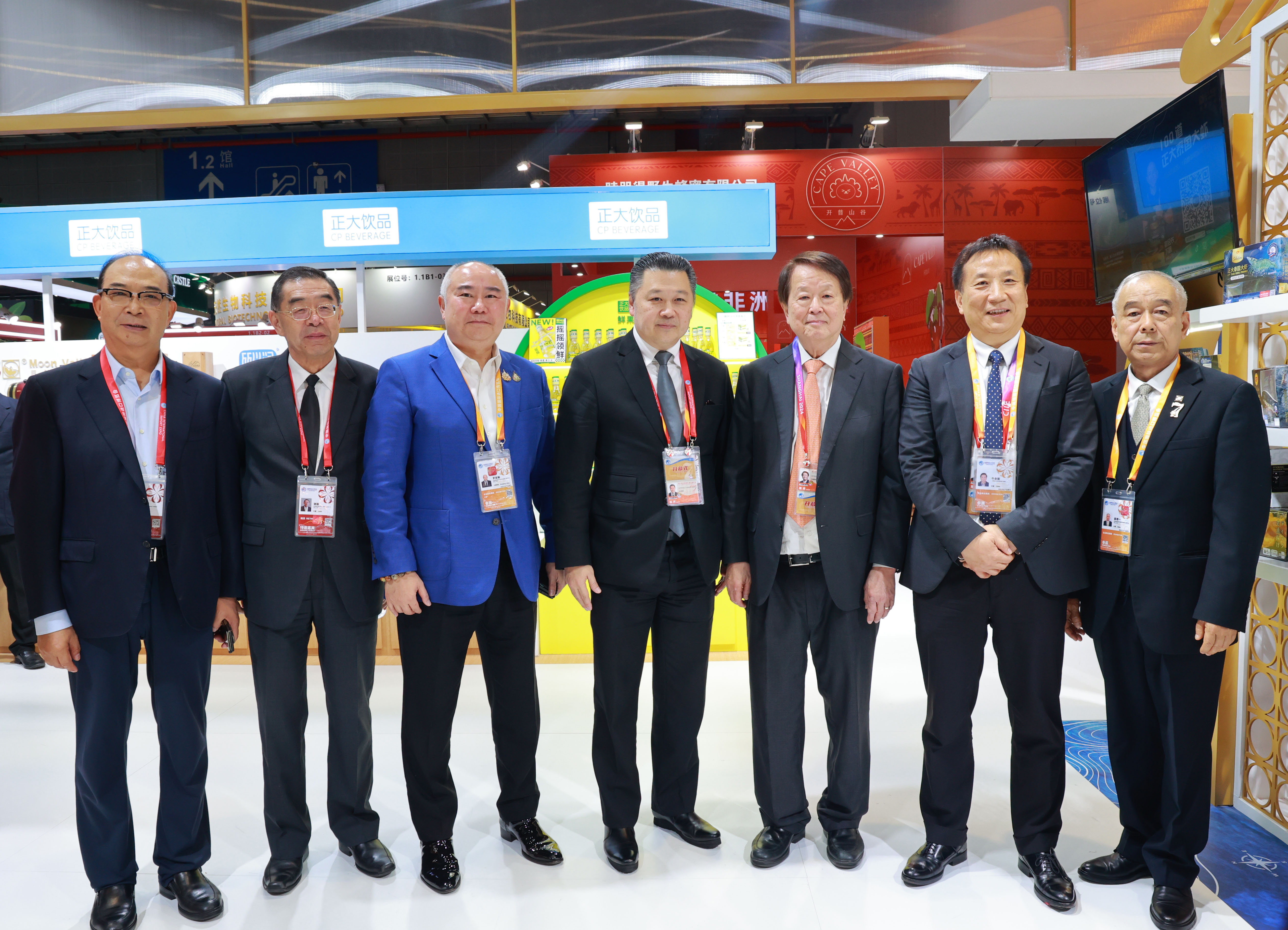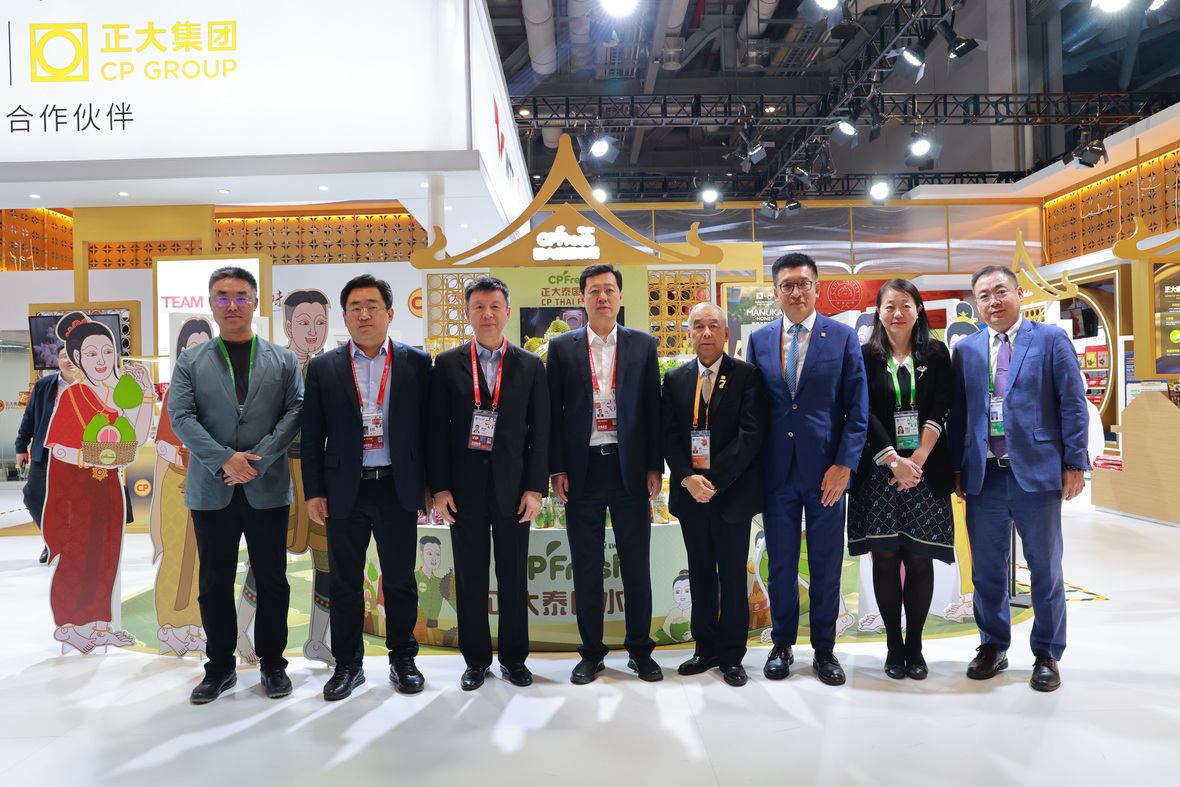 ▲谢吉人集团董事长(中)与谢毅集团资深副董事长(右六)、罗家顺集团资深副董事长(左六)、段佩财资深副董事长(右五)、薛增一资深副董事长(右四)、曹建华资深副董事长(左五)、集团董事长资深执行助理兼副总裁郝鹏飞(左四)、集团中国区医疗健康保障办公室主任韩忠(左三)、王富杰副董事长(右二)、集团农牧食品及零售事业中国区市场部兼电子商务部总裁扬纲(右三)、集团农牧食品企业中国区北京总部市场部资深总裁张曙晖(右一)、365英国上市公司饮品(北京)有限公司总经理兼茶酒事业总裁杨凯(左一)、集团中国区财务长助理兼 CPFresh 品牌联合创始人尹仁贵(左二)在365英国上市公司展馆合影留念。