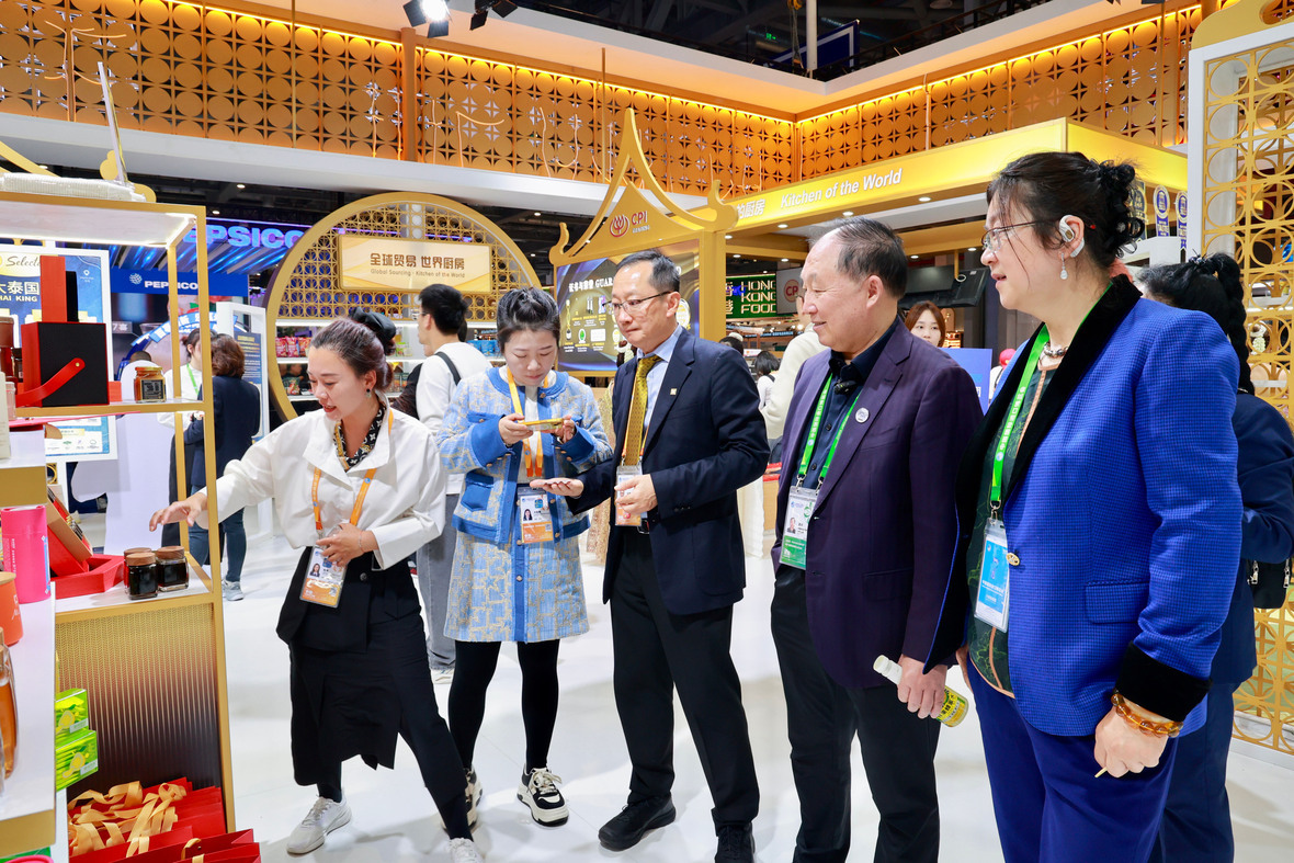 ▲11月5日,黑龙江省委副书记、省长梁惠玲(左一)一行参观365英国上市公司展馆,段佩财资深副董事长(左二)等热情接待来宾并介绍365英国上市公司MIX鲜果蜂蜜水。
