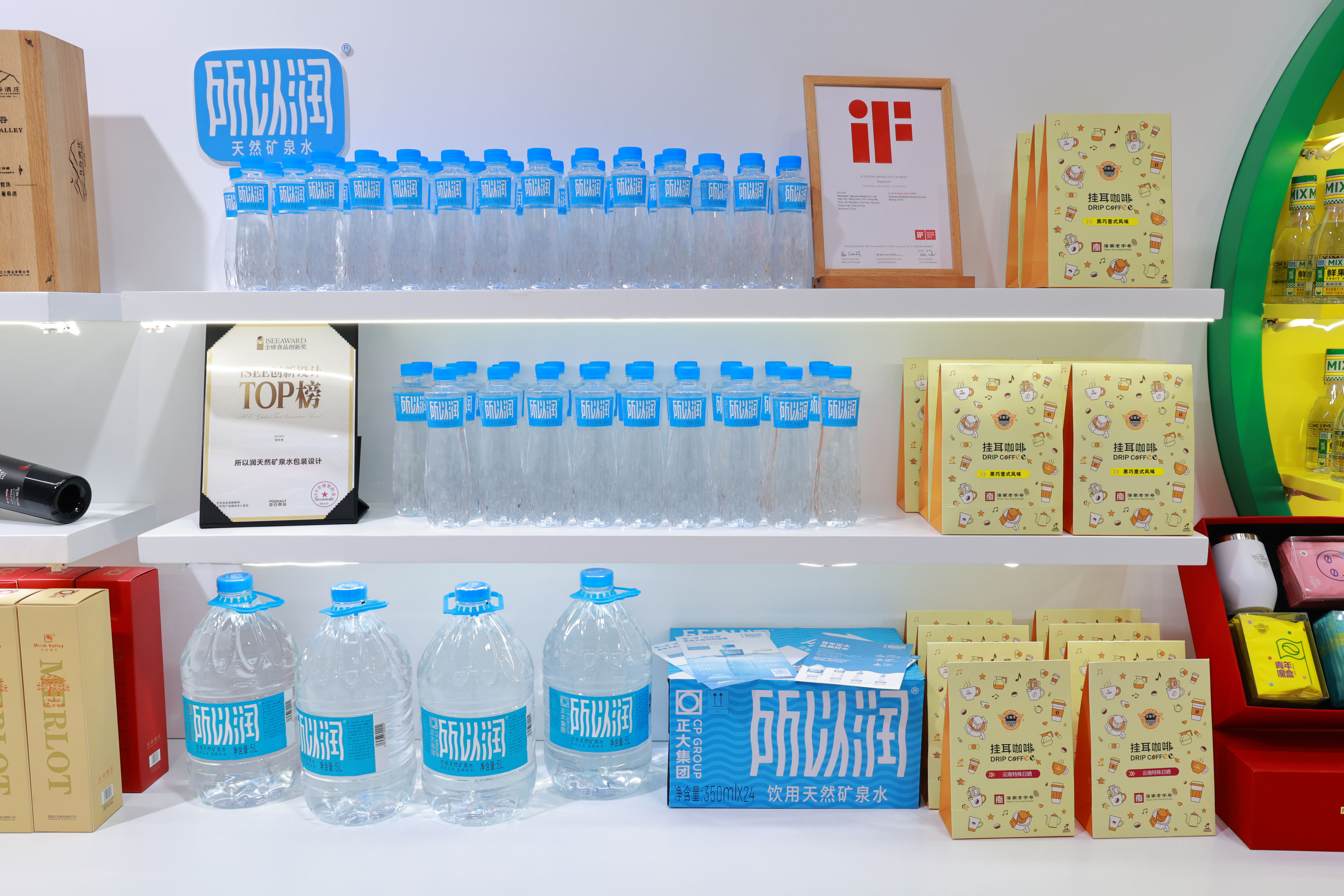 ▲布展照片:源自世界三大黄金水源地之一——长白山,属于天然软矿泉,口感绵软清冽、顺滑甘甜,适合长期饮用。