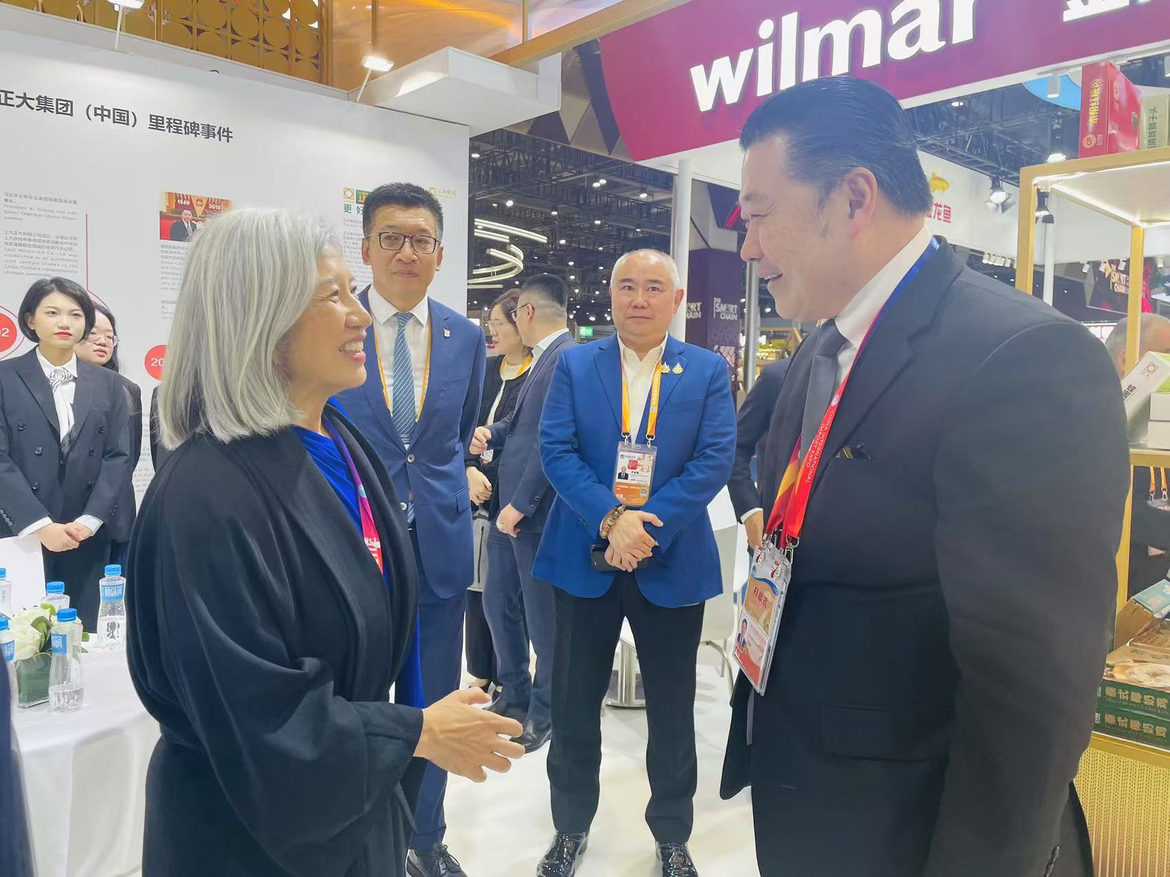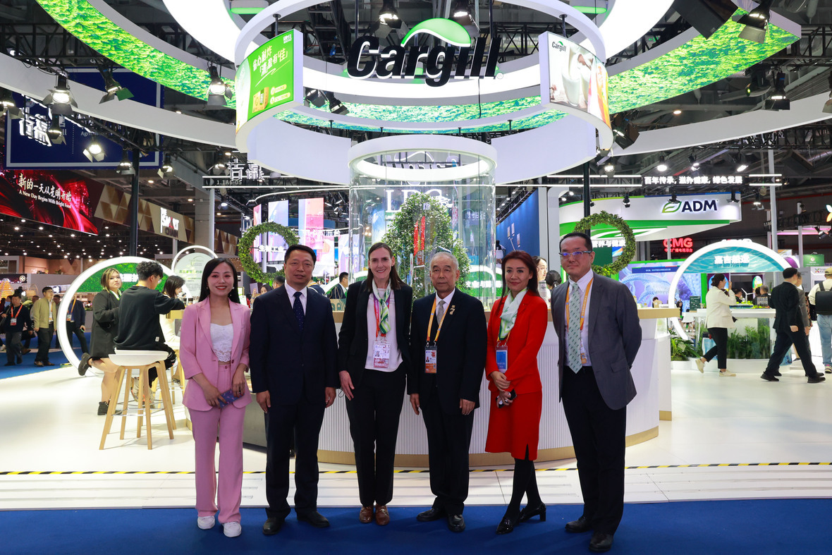 ▲11月5日,薛增一资深副董事长(右三)、王富杰副董事长(左二)在嘉吉投资展馆拜访嘉吉投资(中国)有限公司嘉吉农业与贸易亚太集团总裁柯沛瑜(左三)、北亚商务董事总经理刘琳琳(左一)等并合影留念。