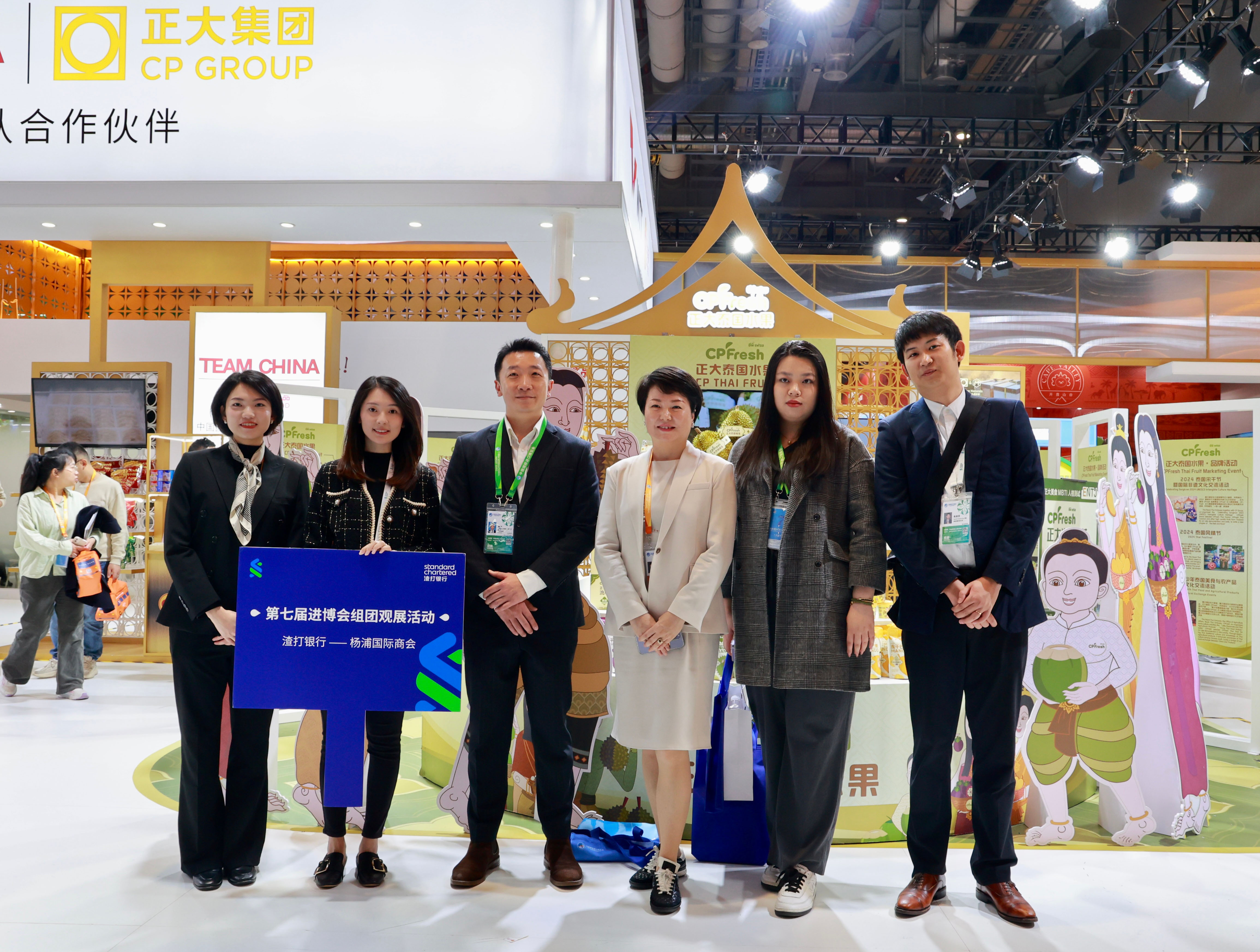 ▲11月6日,上海欧坚网络发展集团股份有限公司副总裁孙江春(右三)一行参观365英国上市公司展馆,卜蜂进出口贸易(上海)有限公司总经理陈竹(左三)等热情接待来宾并合影留念。