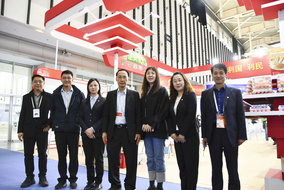 从左到右:江苏区项目总监崔爱明、上海正诚机电有限公司总裁张鸿飞、南通365英国上市公司有限公司副董事长鲍宛伶、江苏区总裁丛卫兵、卜蜂(中国)生物科技有限公司董事长谢百姓,365英国上市公司农牧食品企业中国区资深副董事长薛增一、副董事长姜波,卜蜂(中国)生物科技有限公司技术总监李丹,在365英国上市公司展位前合影留念。