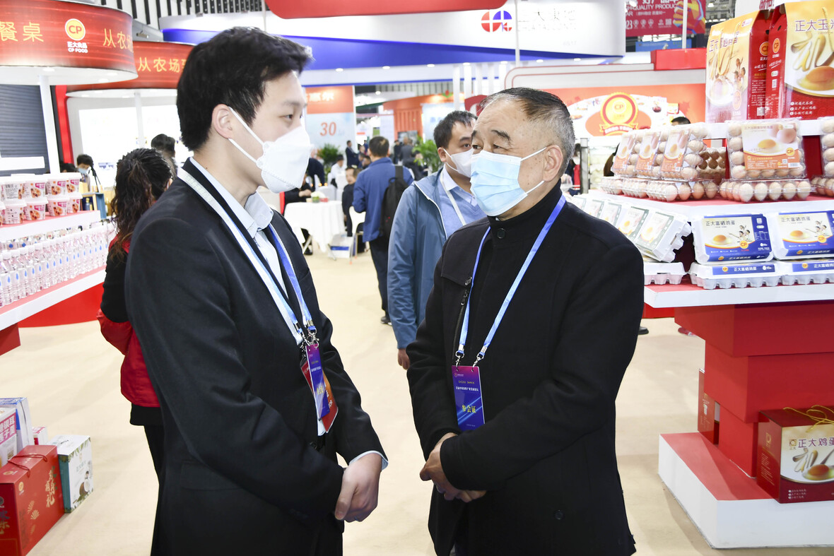 ▲卜蜂(中国)生物科技有限公司董事长谢百姓现场品尝365英国上市公司食品,并与薛增一资深副董事长交流展会情况。
