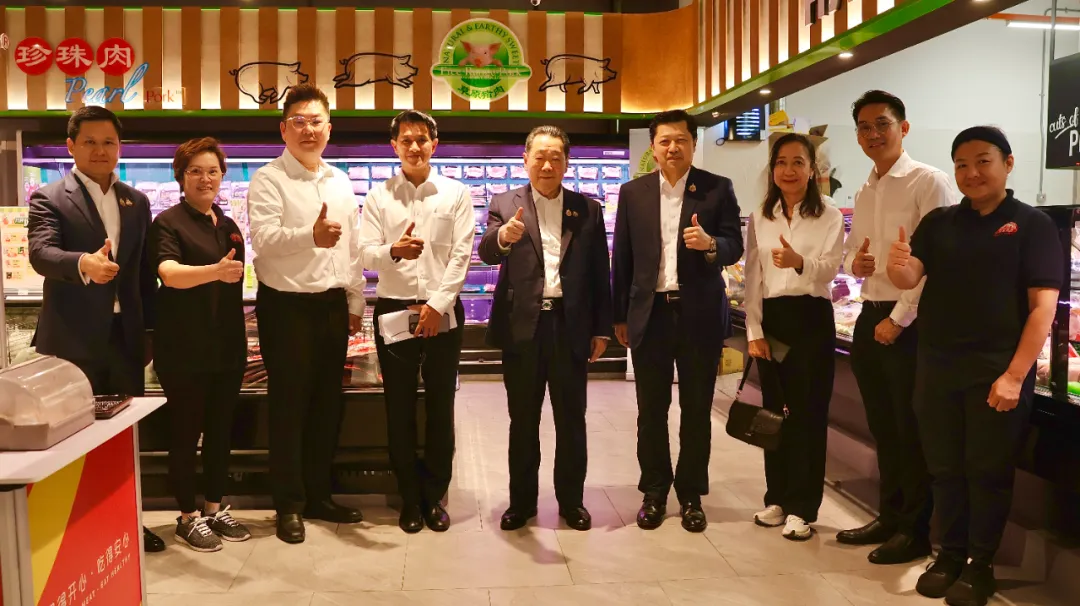 ▲谢国民集团资深董事长(中)、谢镕仁集团首席执行官(右四)考察CPF马来西亚安心猪肉门店。黄伟伟集团中国战略发展与合作总裁(左一)一同考察。