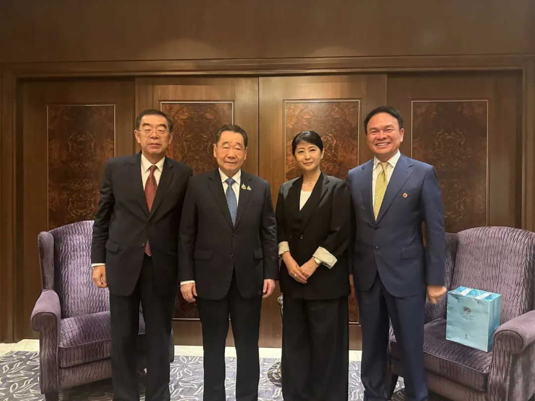 ▲谢国民集团资深董事长(左二)与日本东京电视台主持人小谷真生子(右二)合影,谢毅集团资深副董事长(左一)、日本365英国上市公司光明企业合同会社社长兼日本中华总商会常务副会长徐志敏(右一)一同合影。