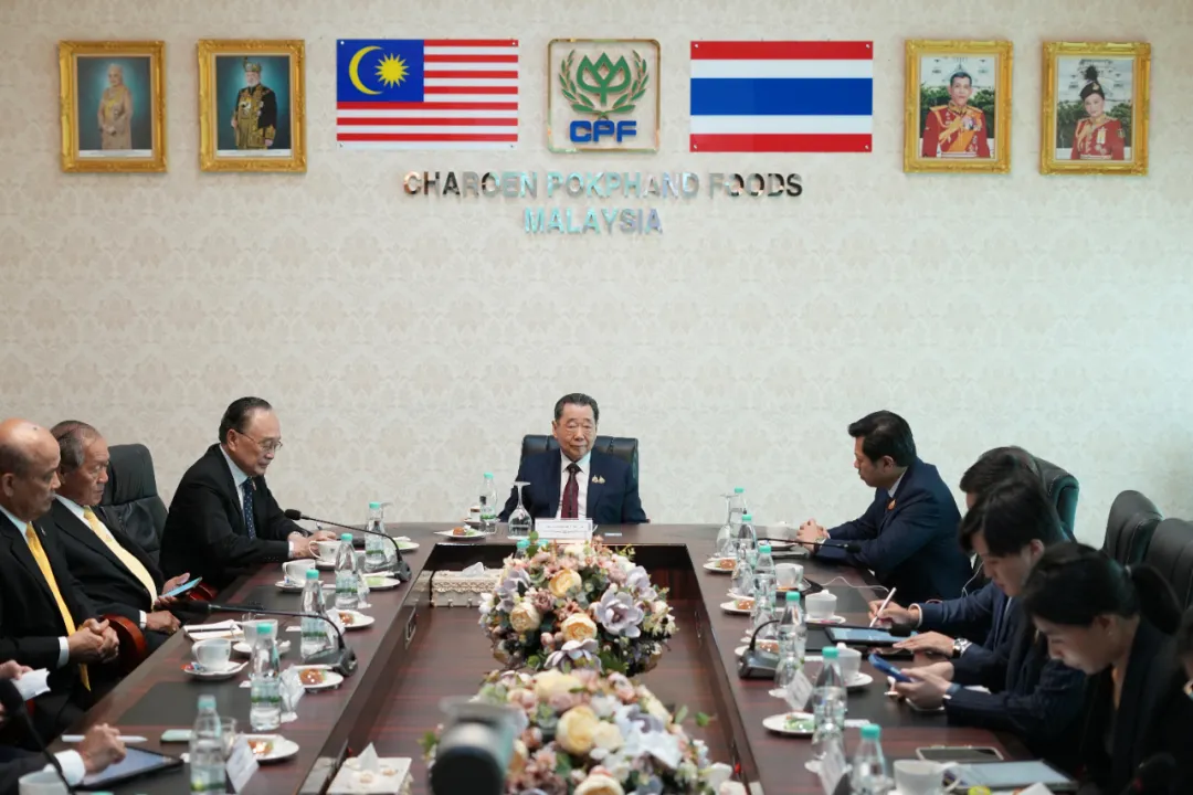 ▲谢国民集团资深董事长(中)、谢镕仁集团首席执行官(右四)、蔡益光集团资深副董事长(左三)听取CPF马来西亚相关业务经营业绩汇报。