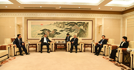 刘家义书记(右三),山东省委副书记、省长李干杰(右二),山东省副省长任爱荣(右一)会见杨小平CEO(左二)及福田祐士副社长(左一)。