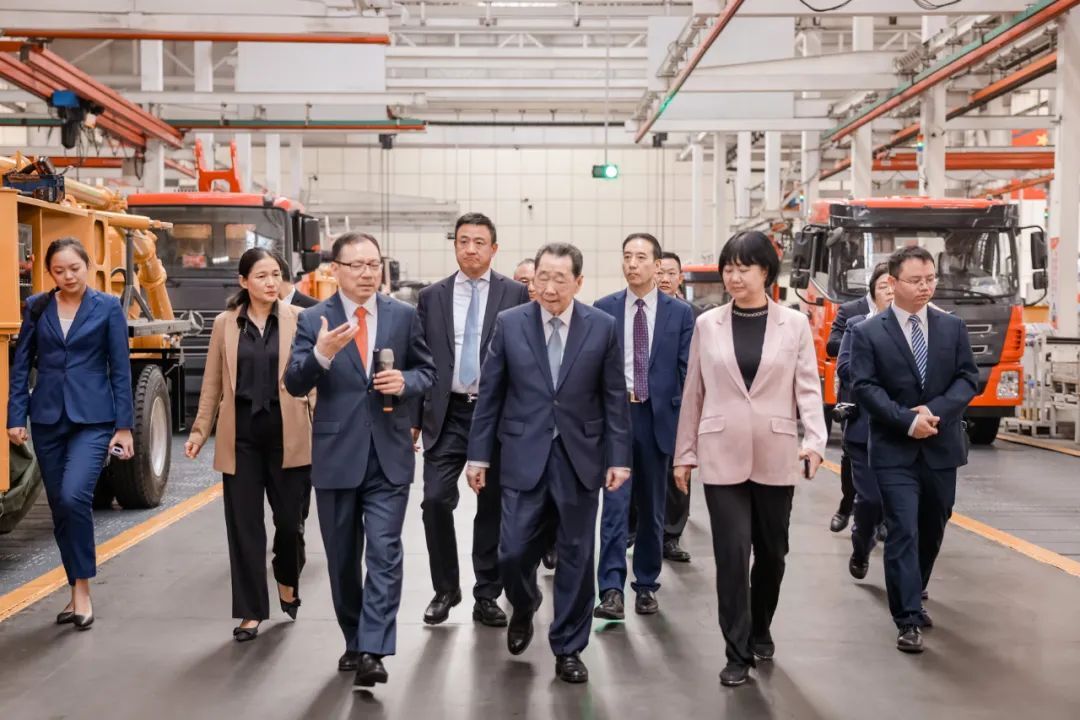 ▲ 谢国民集团资深董事长(前排中)参观三一重工车间,湖南省商务厅副厅长郭宁(前排右)、三一集团轮值董事长唐修国(前排左)陪同参观。