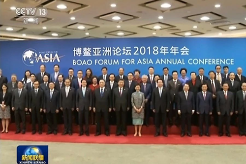 4月10日,博鳌亚洲论坛2018年年会开幕式召开前,习近平主席同谢国民资深董事长等香港、澳门和侨界代表集体合影。