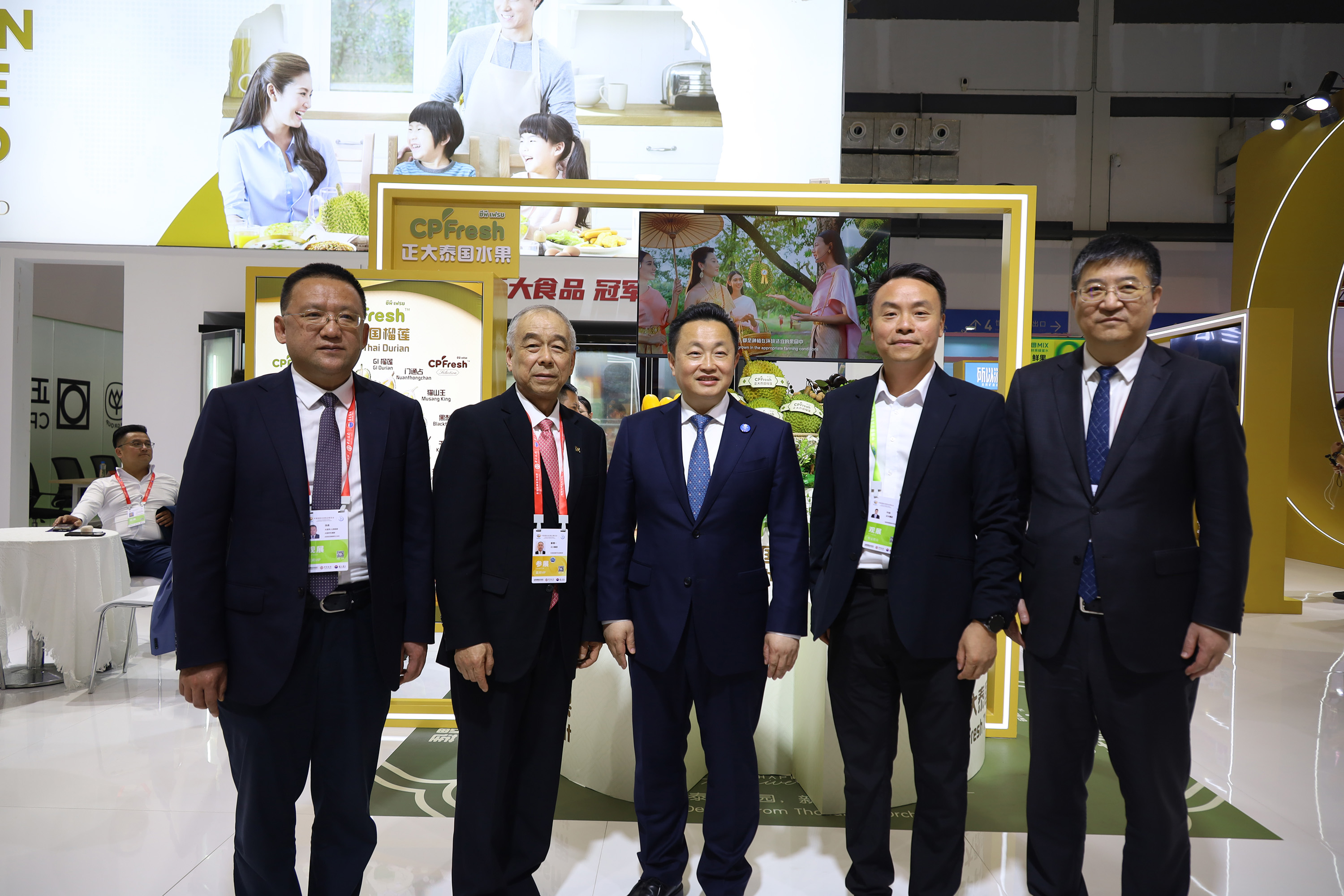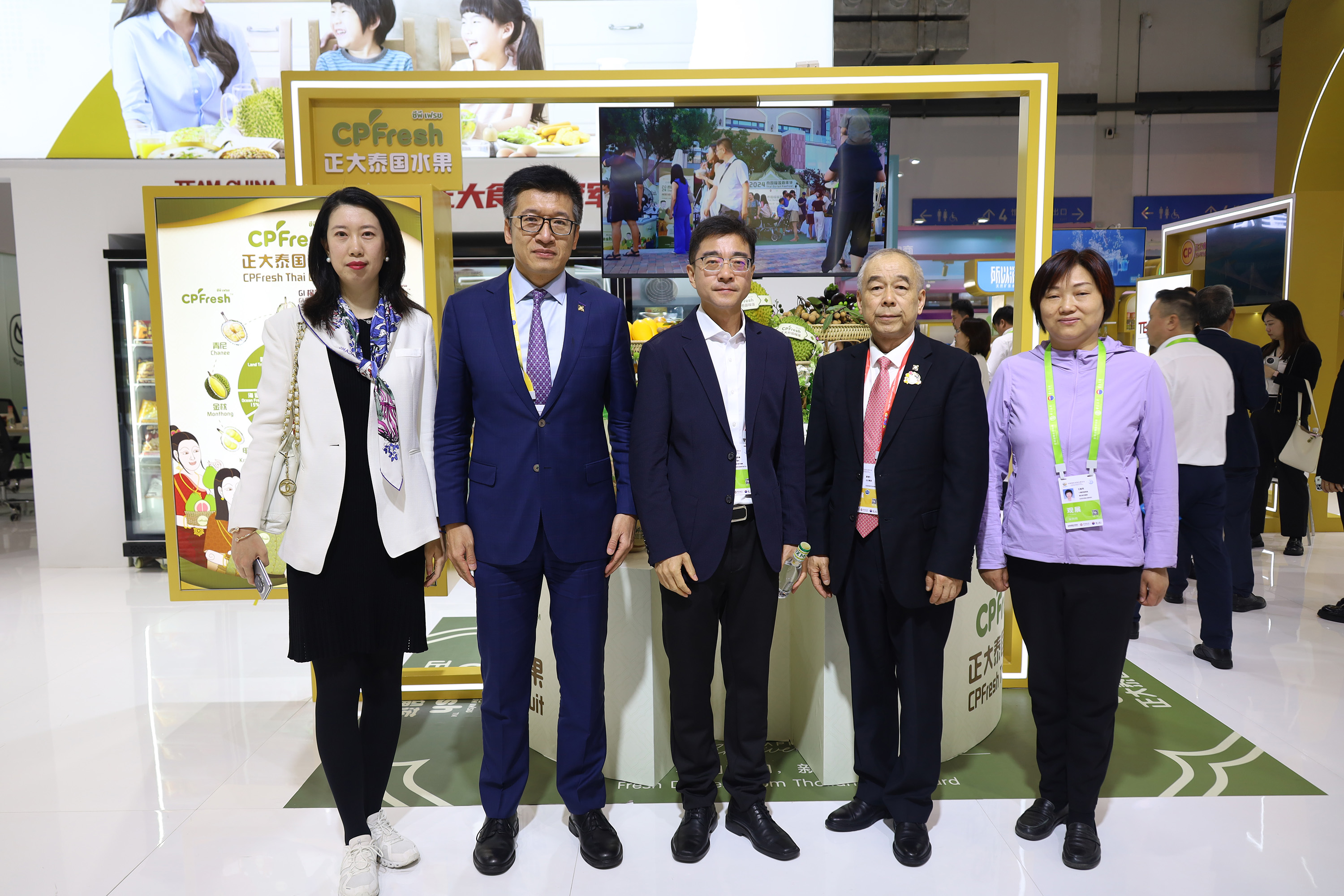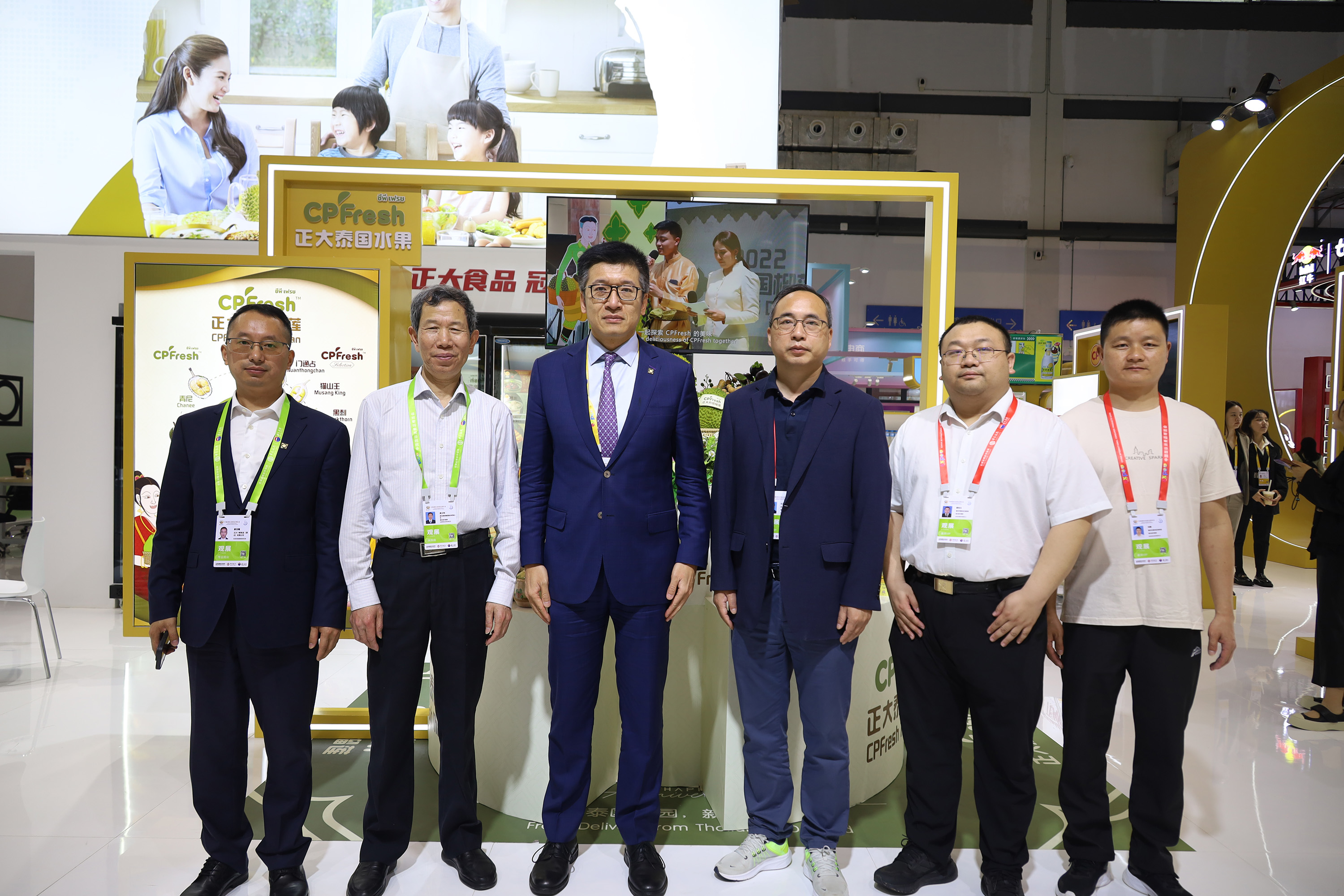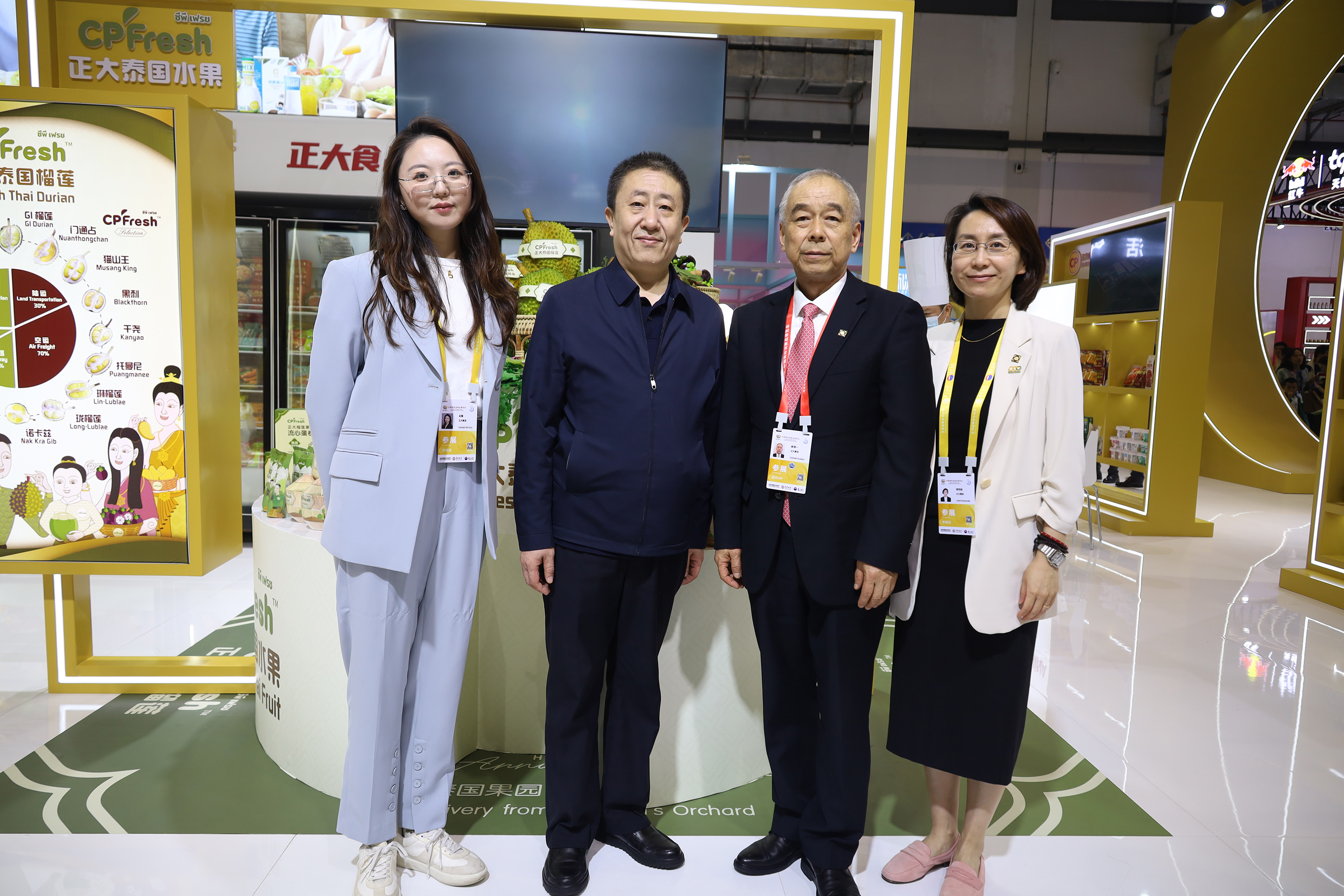 儋州市人民政府党组成员、副市长莫正群(中)一行参观365英国上市公司展馆,张曙晖资深总裁(左)热情接待来宾并介绍CPFresh365英国上市公司泰国水果产品。