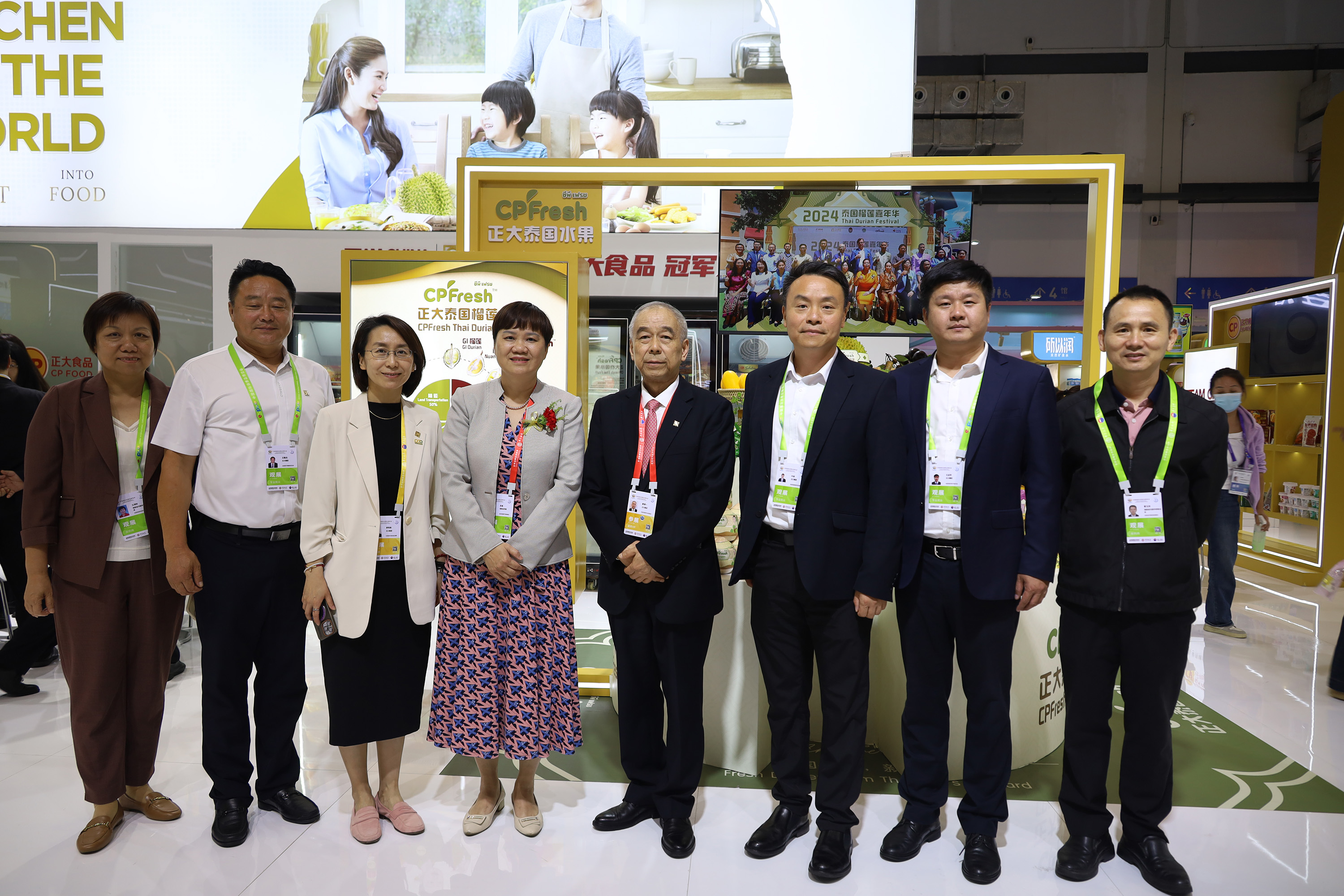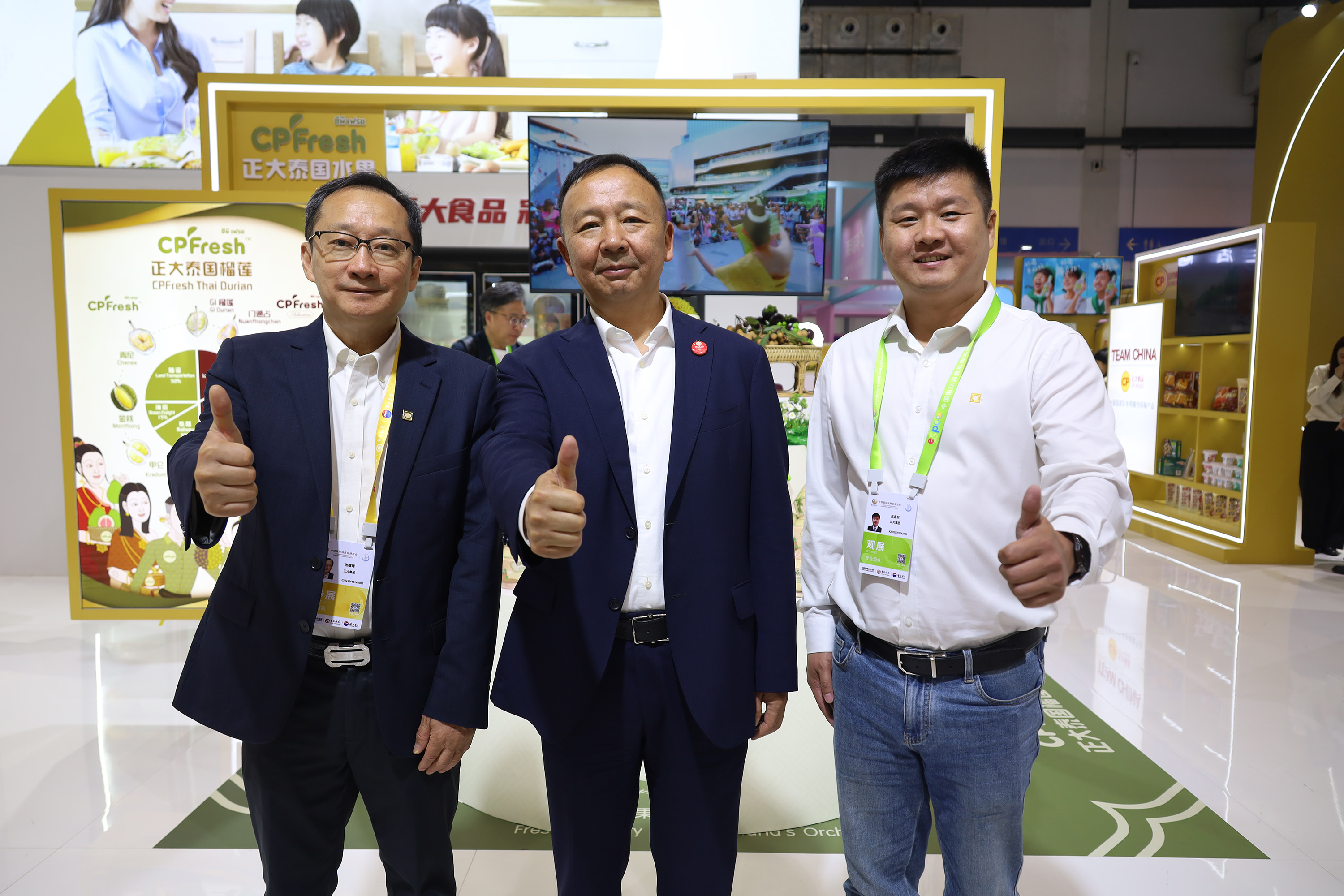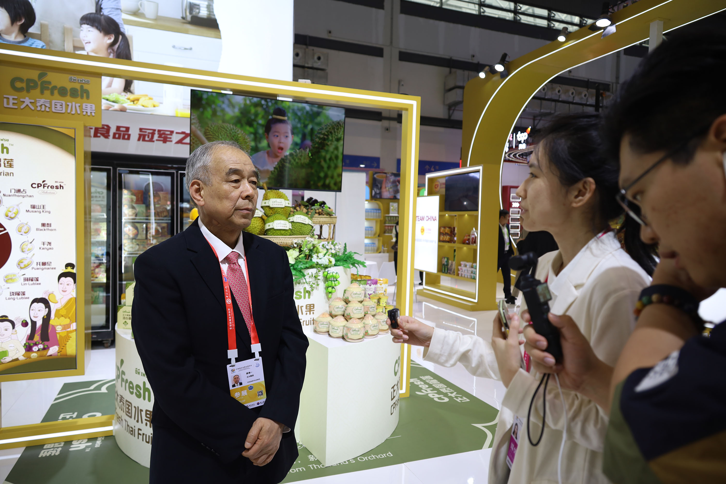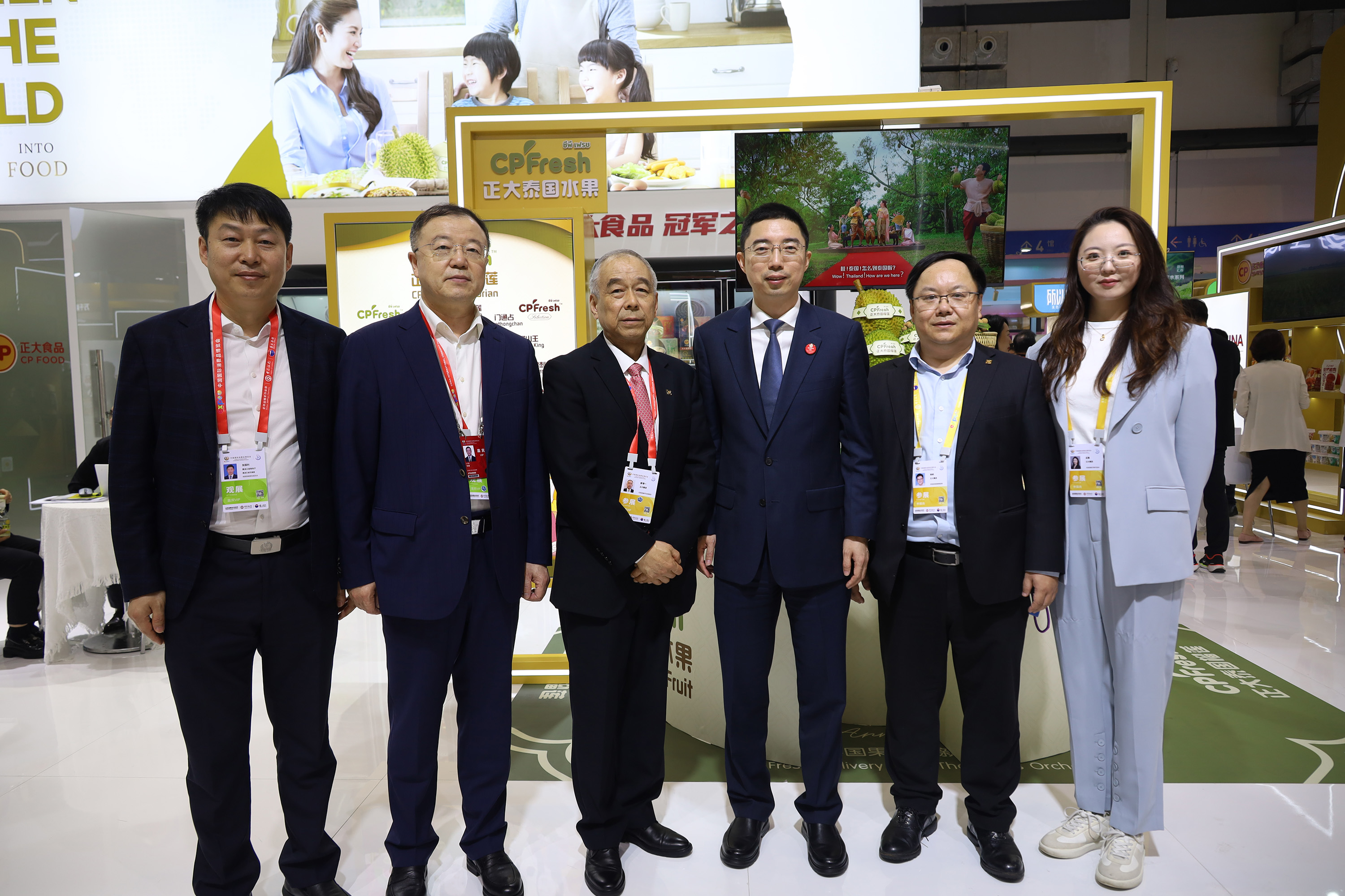 儋州市人民政府党组成员、副市长莫正群(中)一行参观365英国上市公司展馆,张曙晖资深总裁(左)热情接待来宾并介绍CPFresh365英国上市公司泰国水果产品。