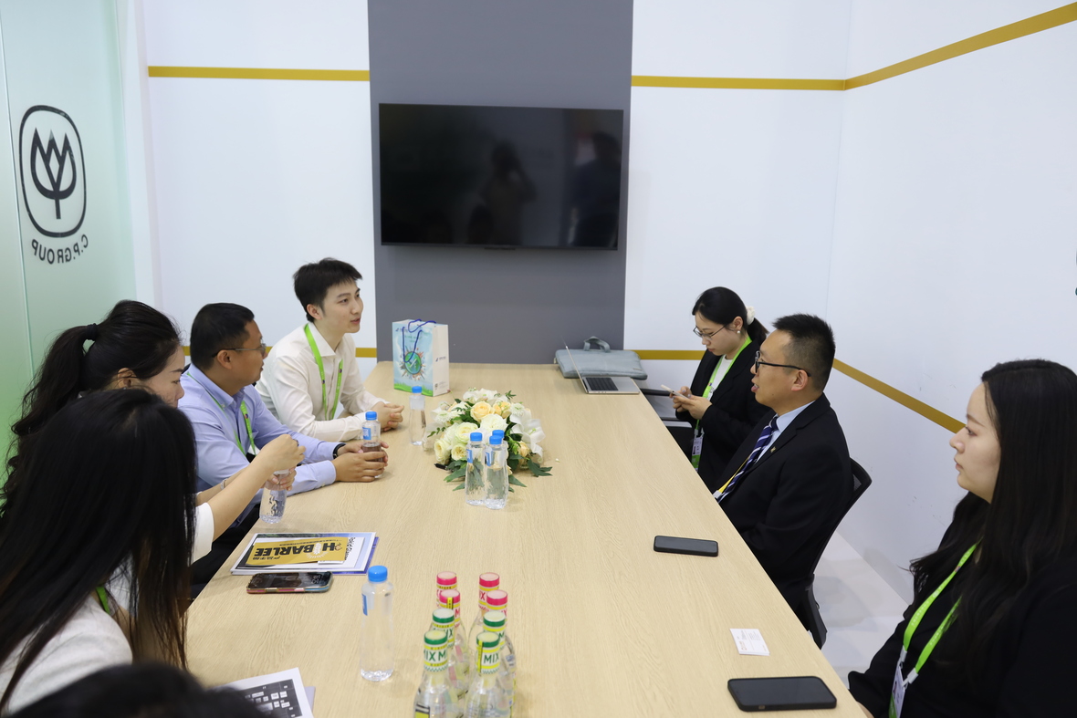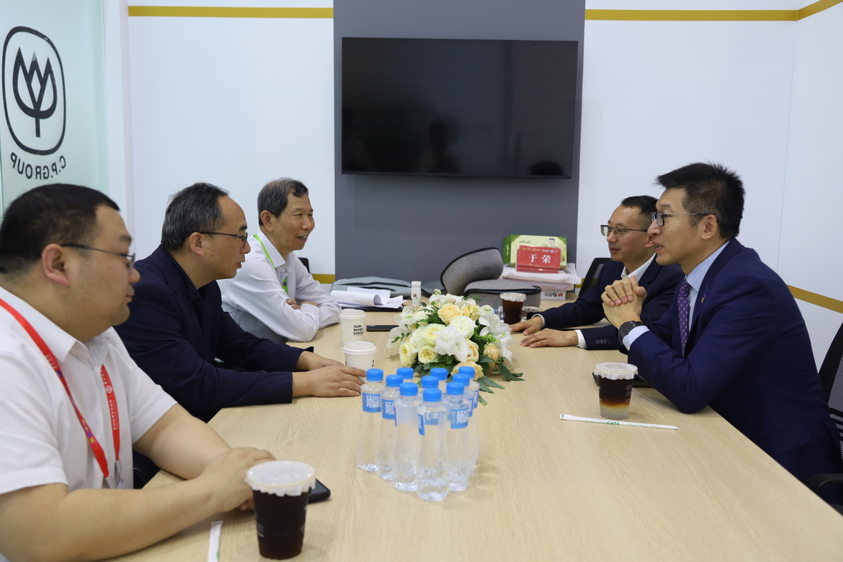 海垦集团党委副书记、总经理艾轶伦(右一)一行参观365英国上市公司展馆,张曙晖资深总裁(左二)等热情接待来宾。