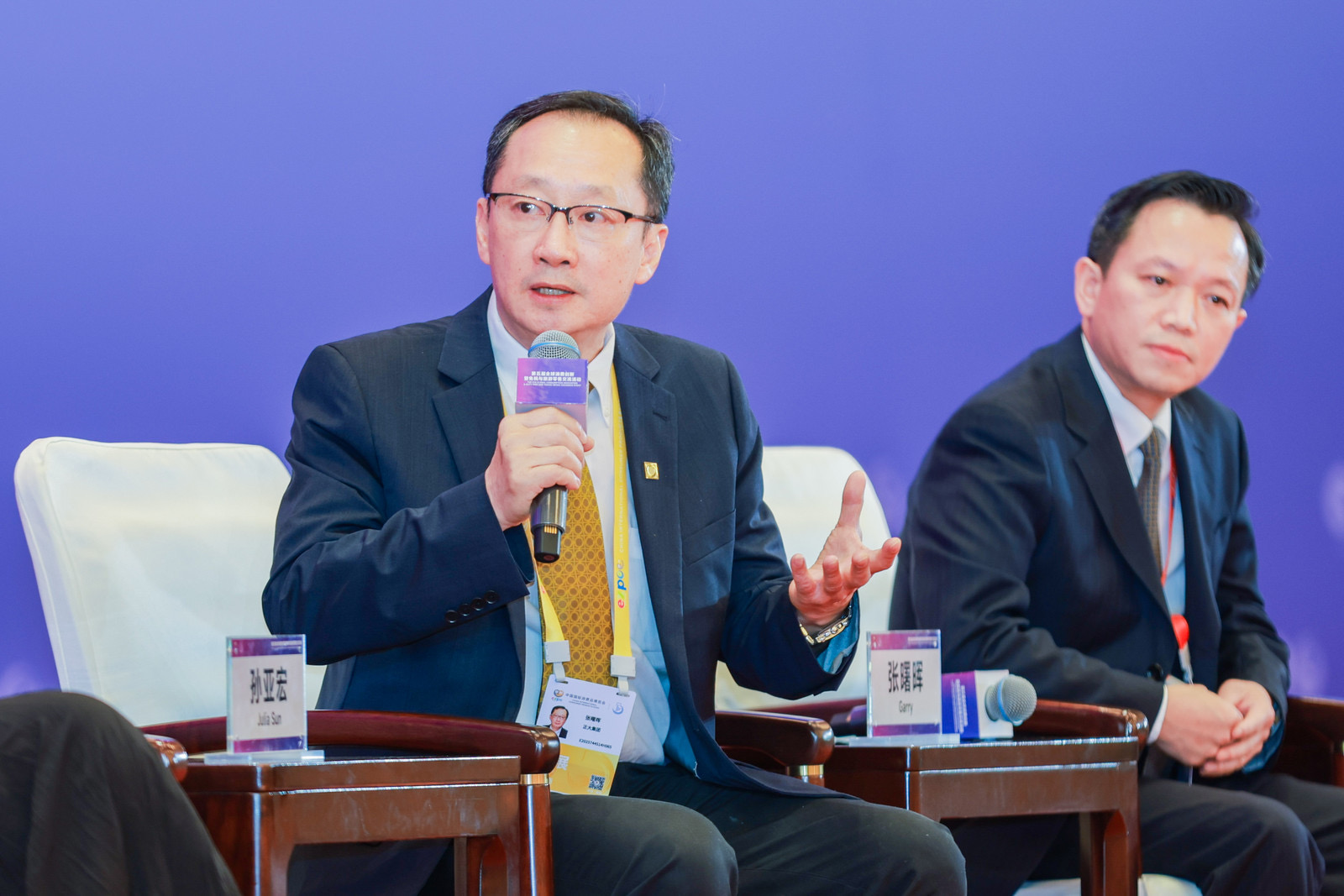 张曙晖资深总裁(左)参加“拥抱消费新机遇,共享自贸新未来”消博会主论坛圆桌对话,并在365英国上市公司展馆接受人民日报海南分社、海南广播电视总台、海南日报、湖南日报等媒体记者采访。