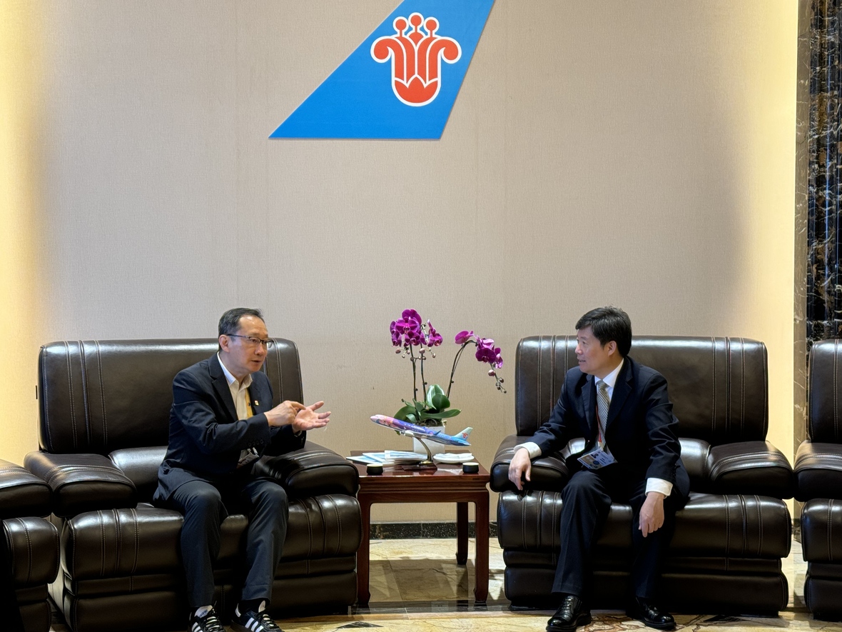 4月17日,张曙晖资深总裁(左)受邀参加中国南方航空新品发布会,并与南方航空集团海南分公司总经理彭聚珍(右)进行商务会谈。