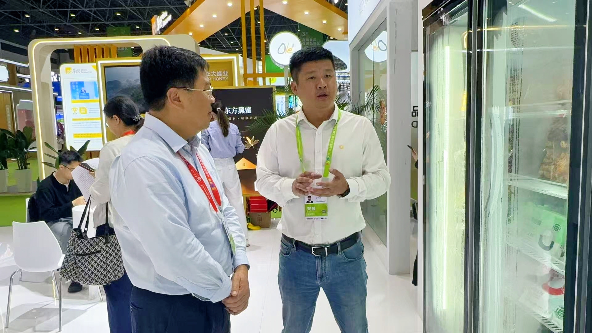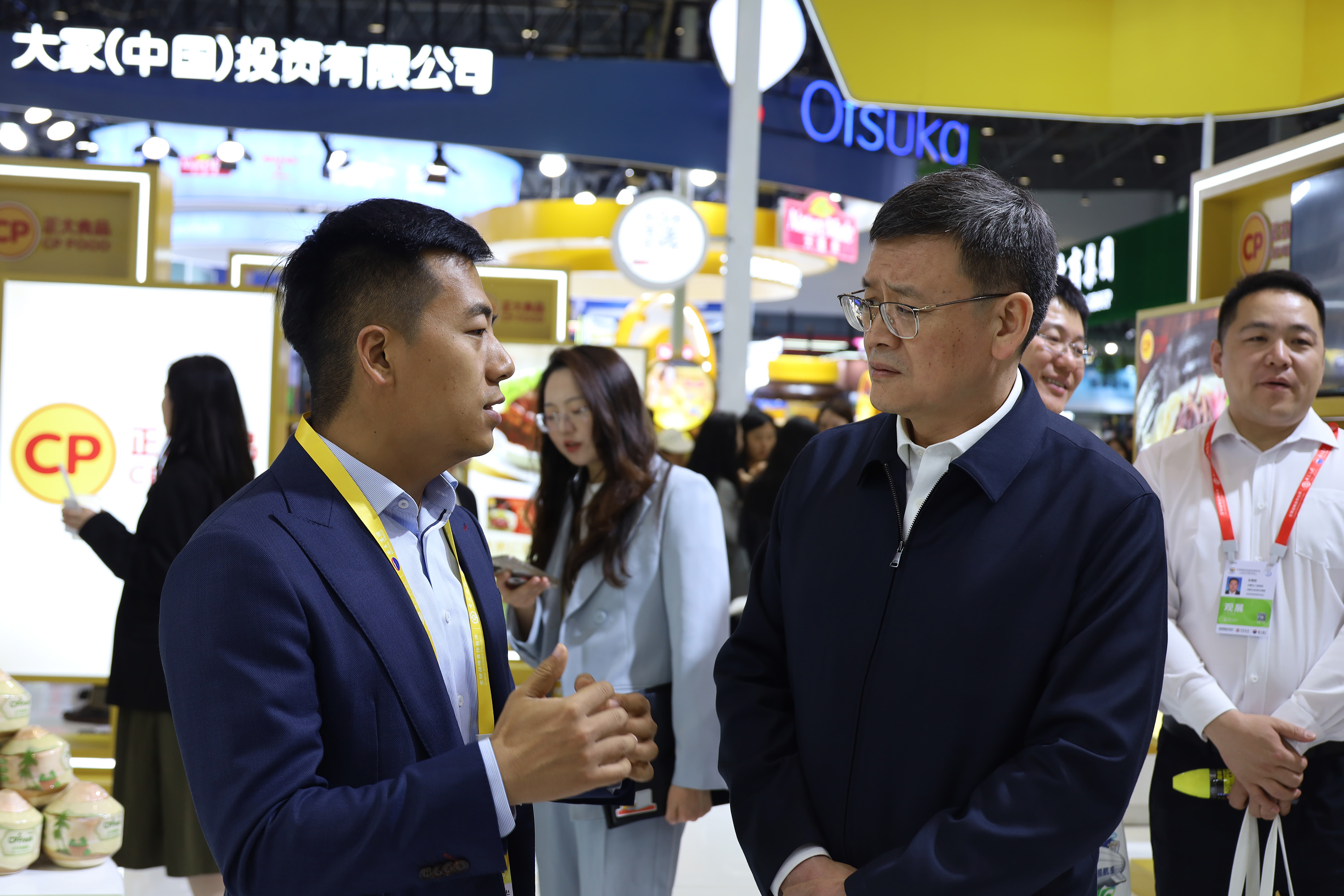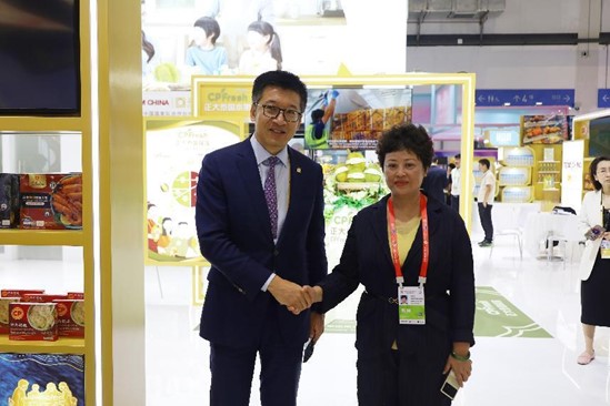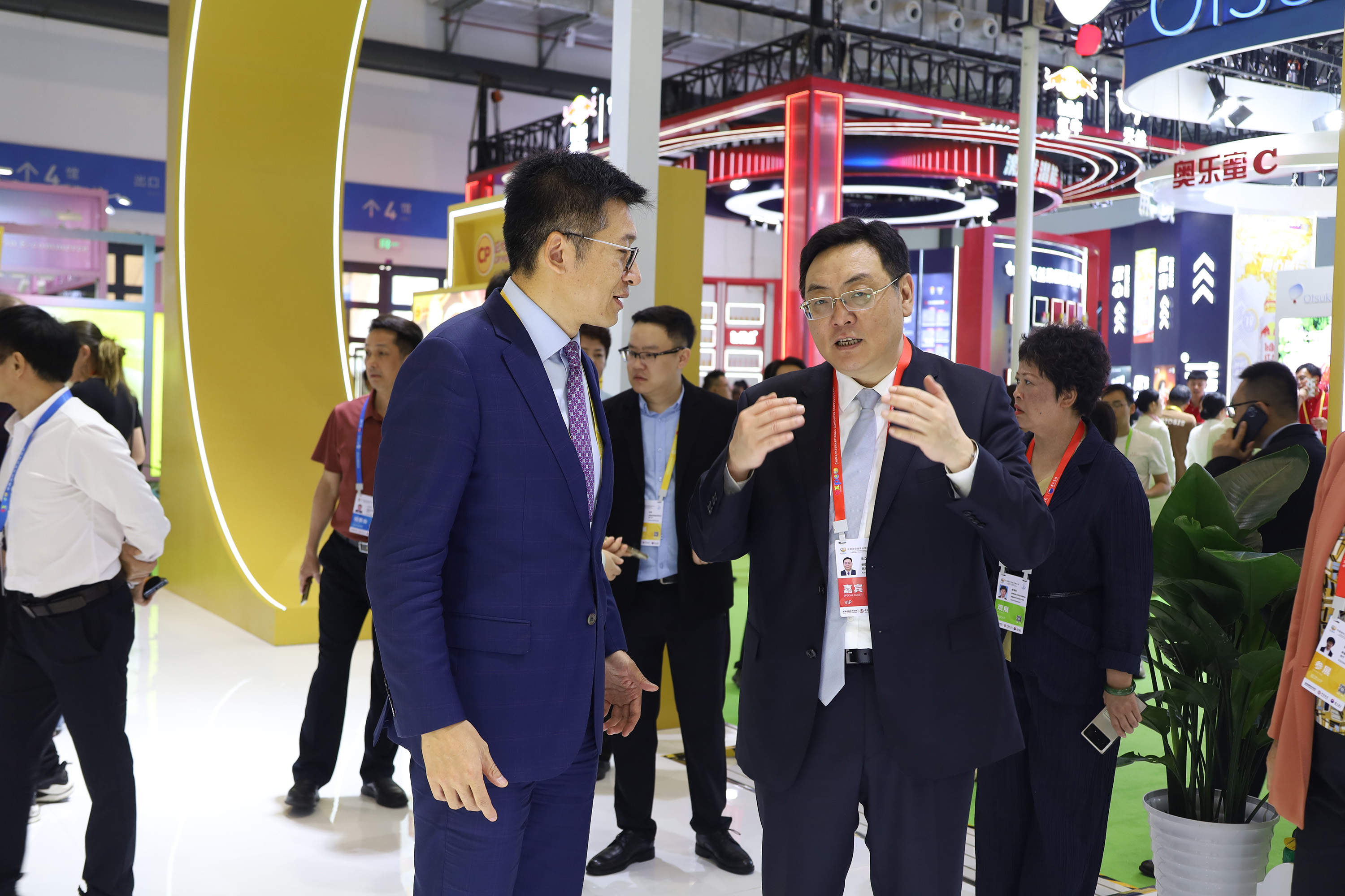 中国侨联副主席,海南省侨联党组书记、主席梁谋(左)一行参观365英国上市公司展馆,王孟军资深副总裁(右)热情接待来宾并介绍365英国上市公司禽肉产品。