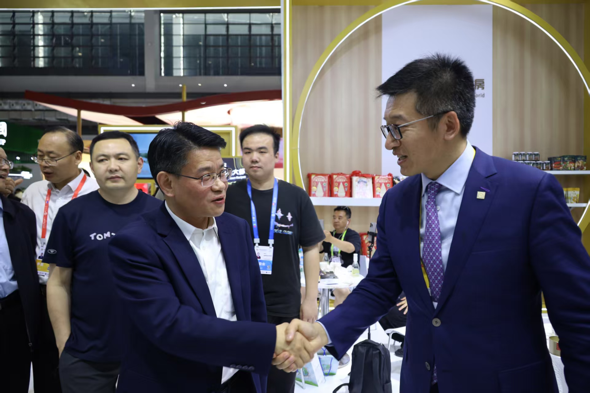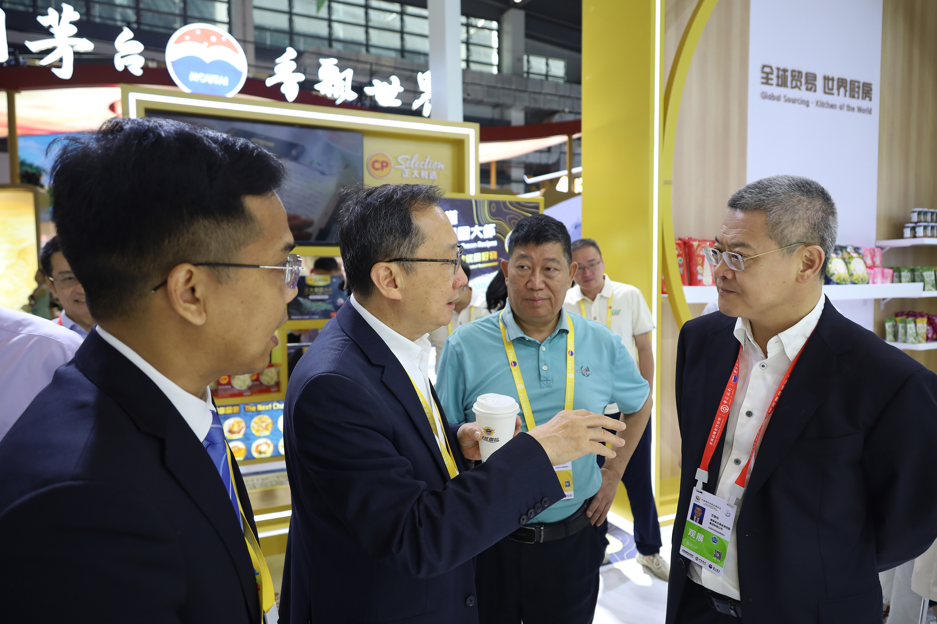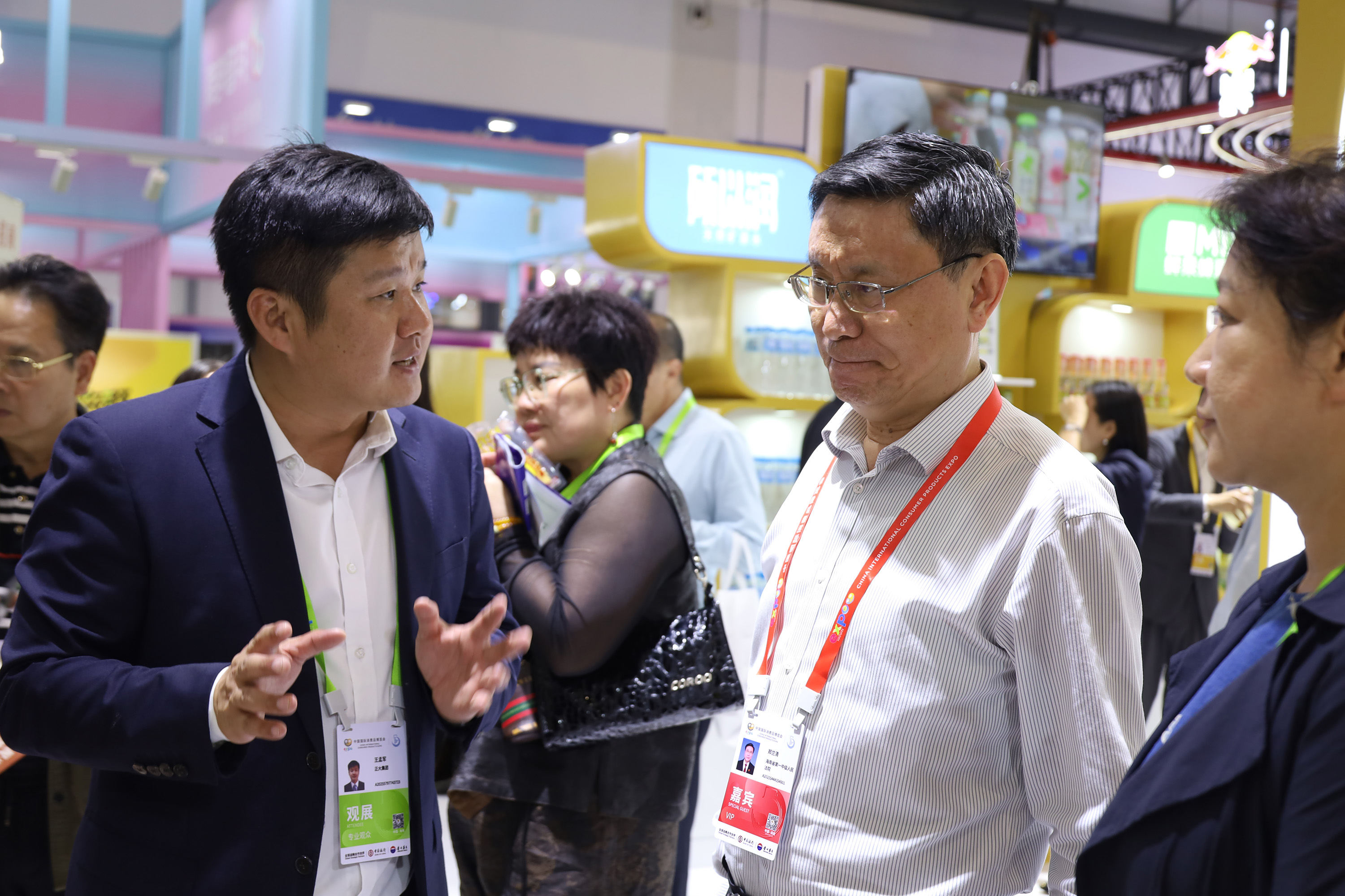 中国侨联副主席,海南省侨联党组书记、主席梁谋(左)一行参观365英国上市公司展馆,王孟军资深副总裁(右)热情接待来宾并介绍365英国上市公司禽肉产品。