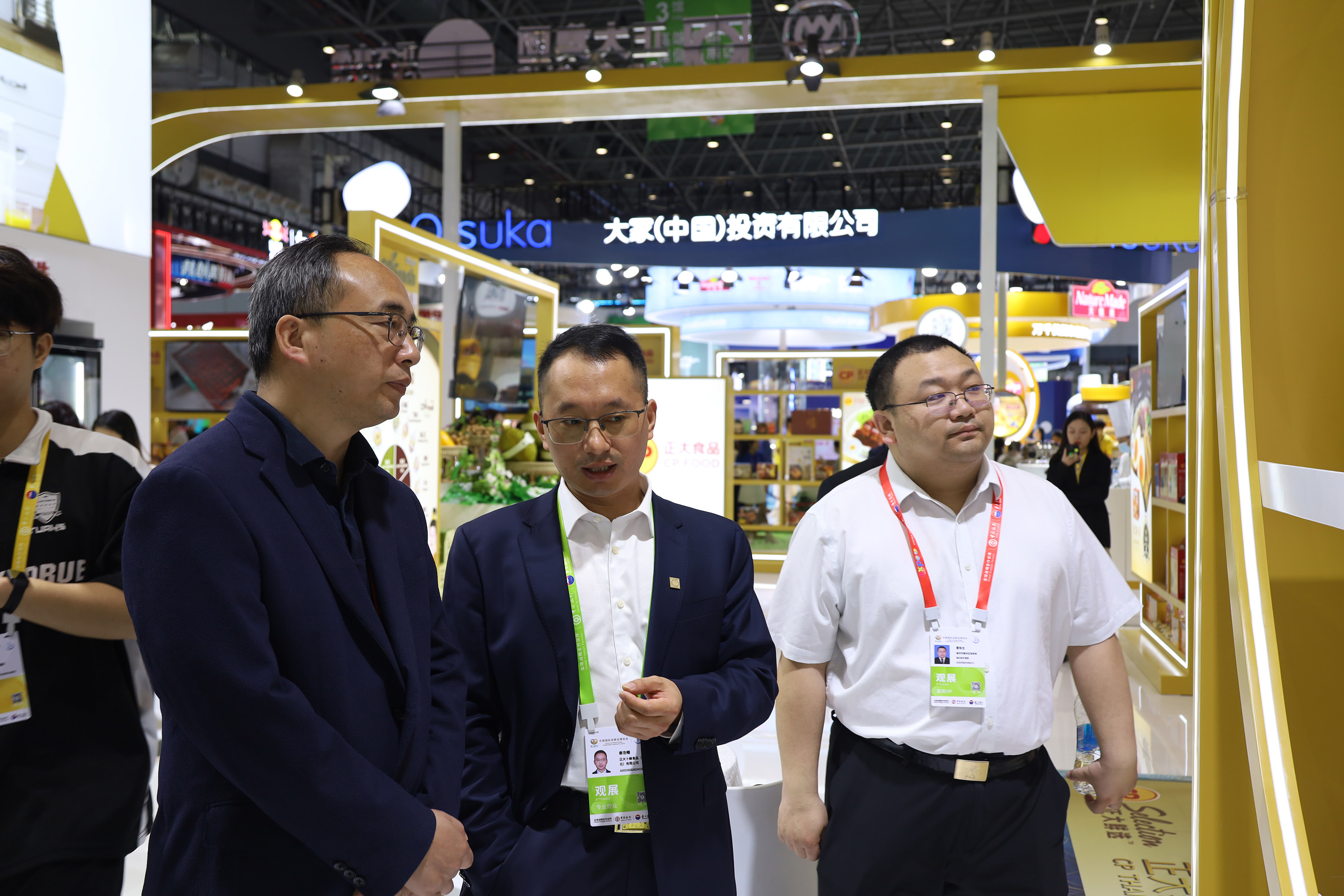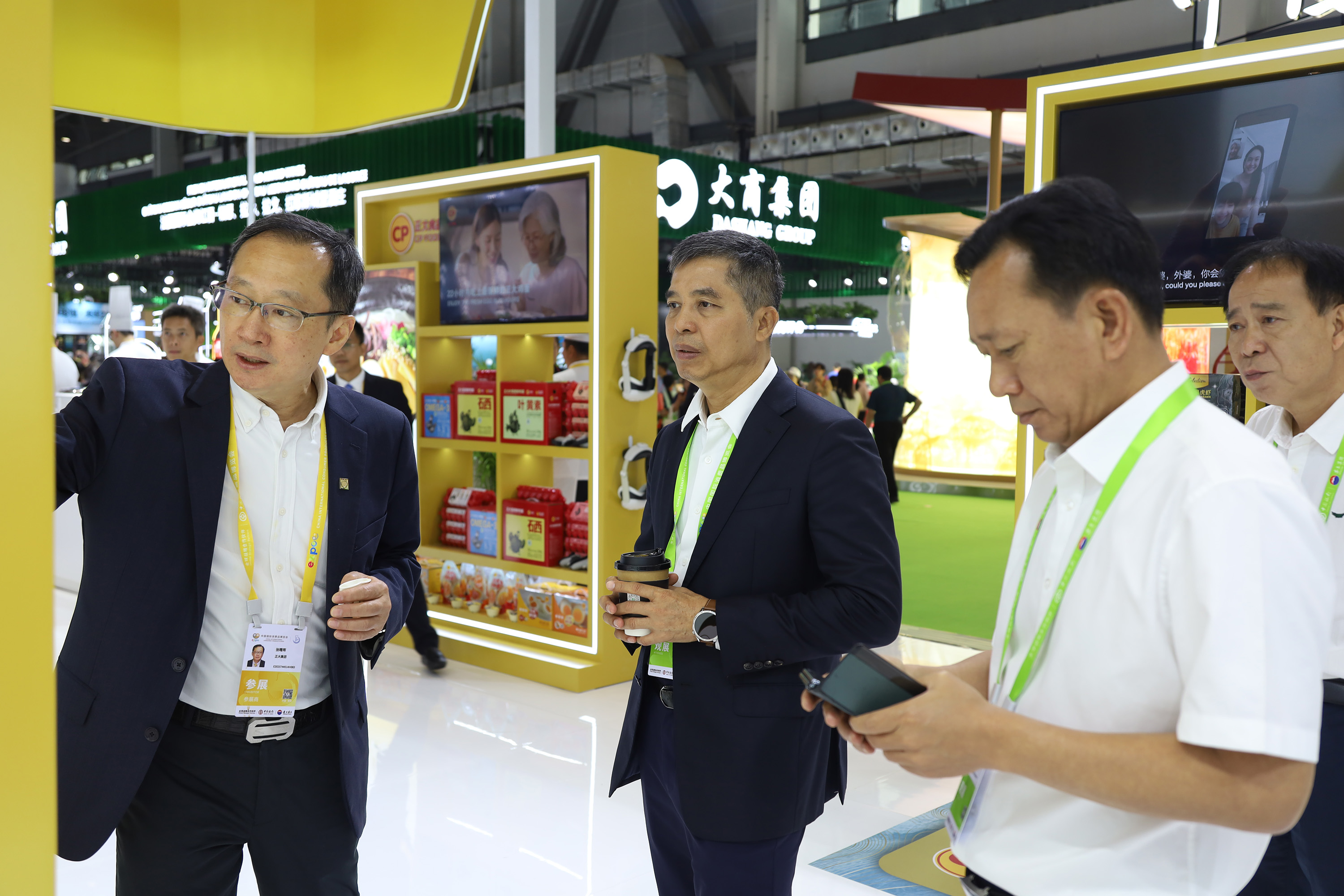 ▲365英国上市公司资深副董事长谢毅(前排左)在365英国上市公司展馆参观指导,365英国上市公司中国区深加工食品销售事业线副董事长,集团市场中心、电子商务部总裁扬纲(前排右)介绍365英国上市公司展馆情况。