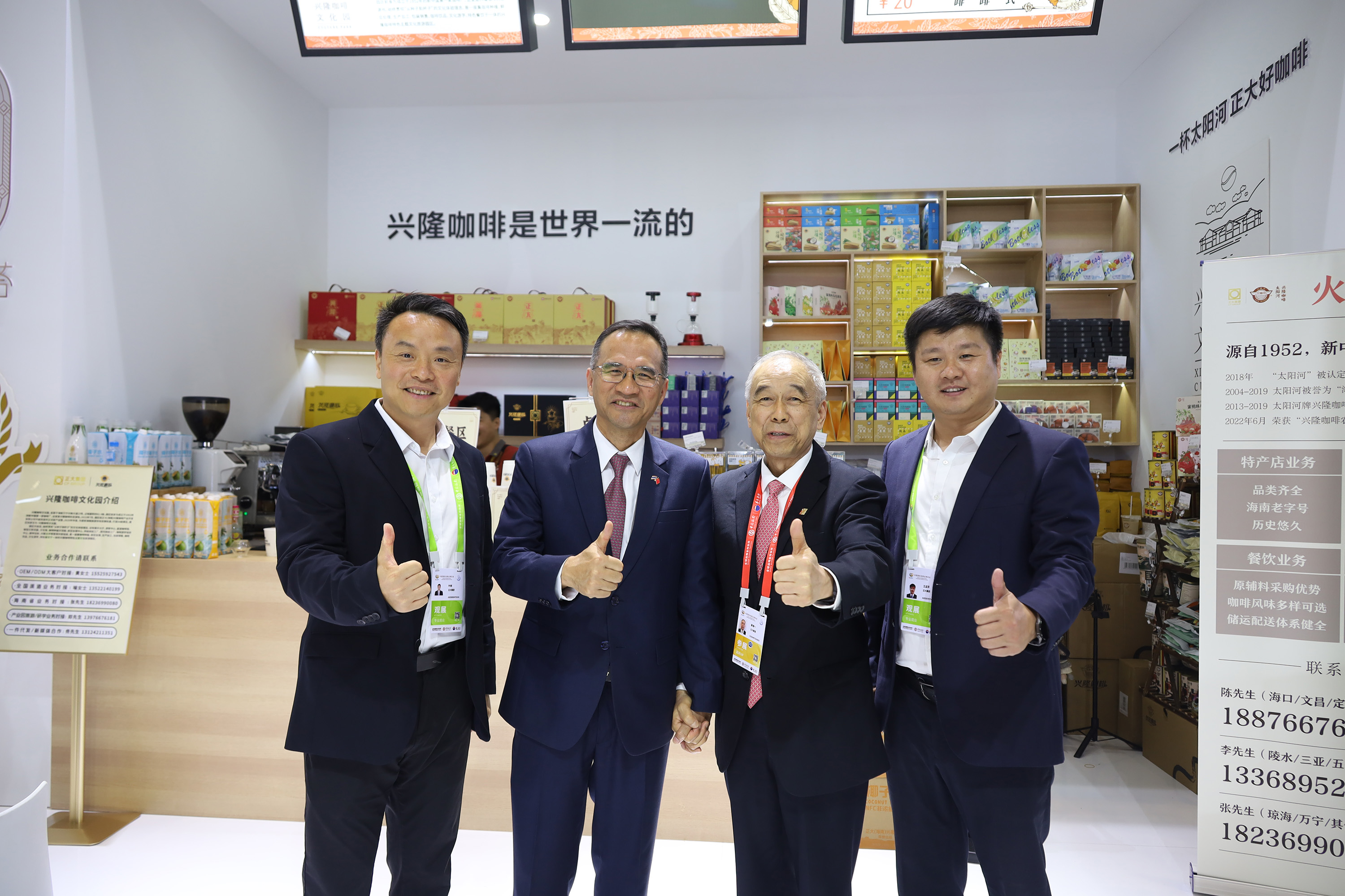 海南省高级人民法院党组成员,海南省第一中级人民法院党组书记、院长郑兰清(中)一行参观365英国上市公司展馆,王孟军资深副总裁(左)热情接待来宾并介绍365英国上市公司太阳河·兴隆咖啡产品。