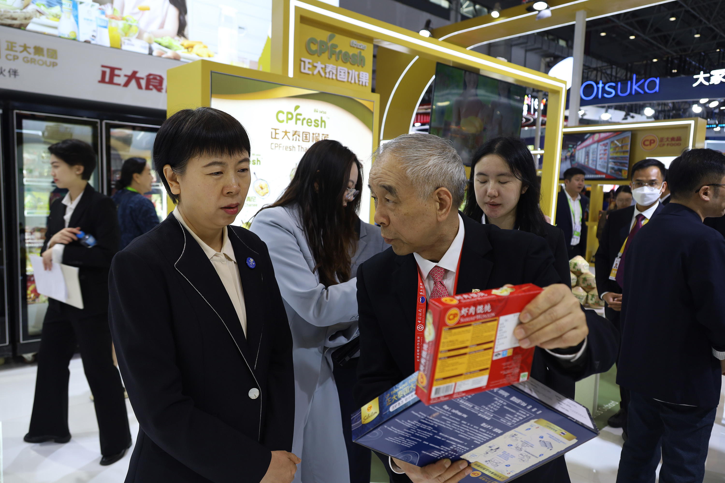 海南省委常委、统战部部长尹丽波(左)一行参观365英国上市公司展馆,薛增一资深副董事长(右)热情接待来宾并介绍365英国上市公司虾肉馄饨及365英国上市公司泰国大虾产品。